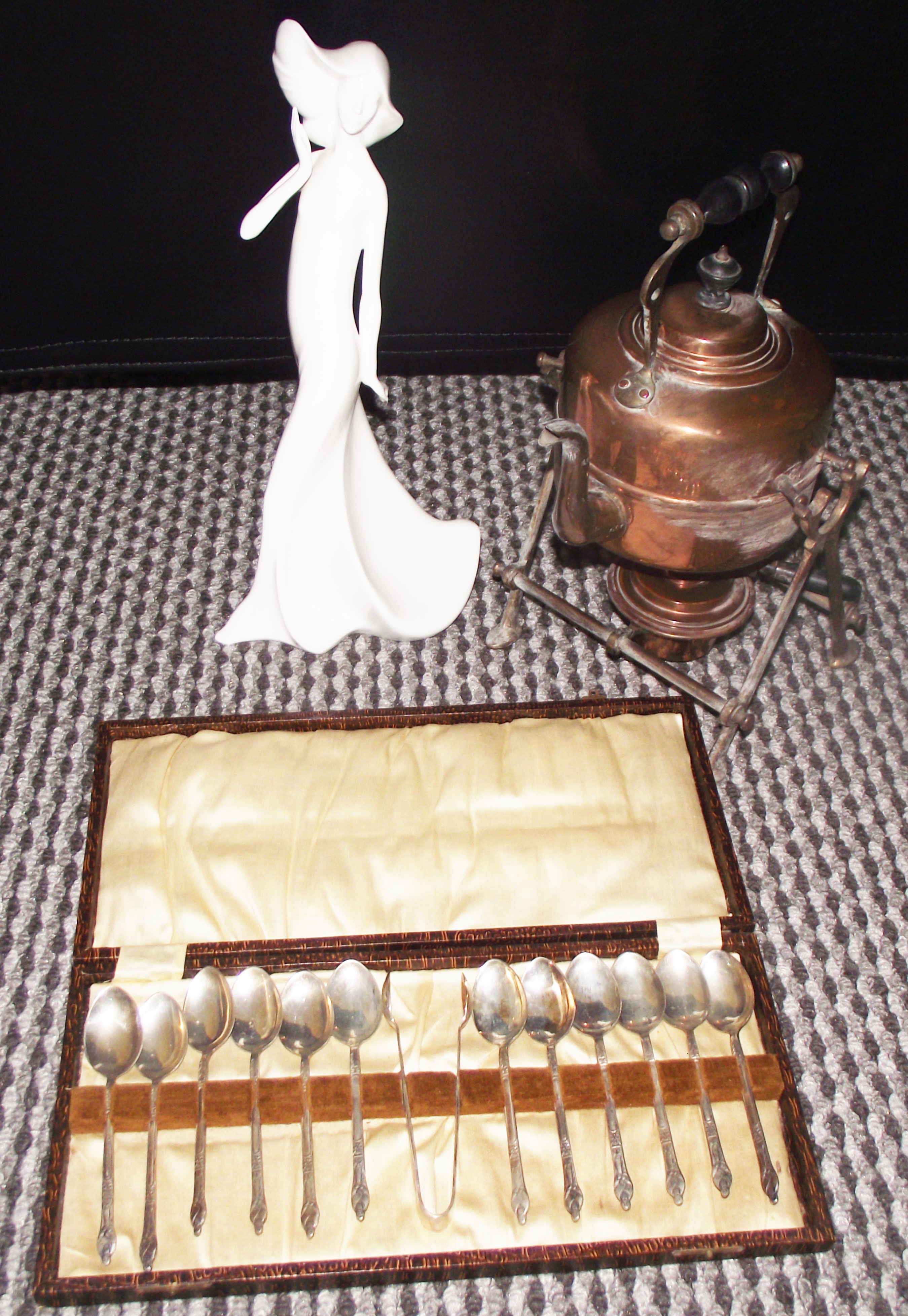 copper & brass spirit kettle & stand with original burner + Royal Doulton Images figurine Carefree HN3026 + cased set of Epns Appostle spoons and tongs