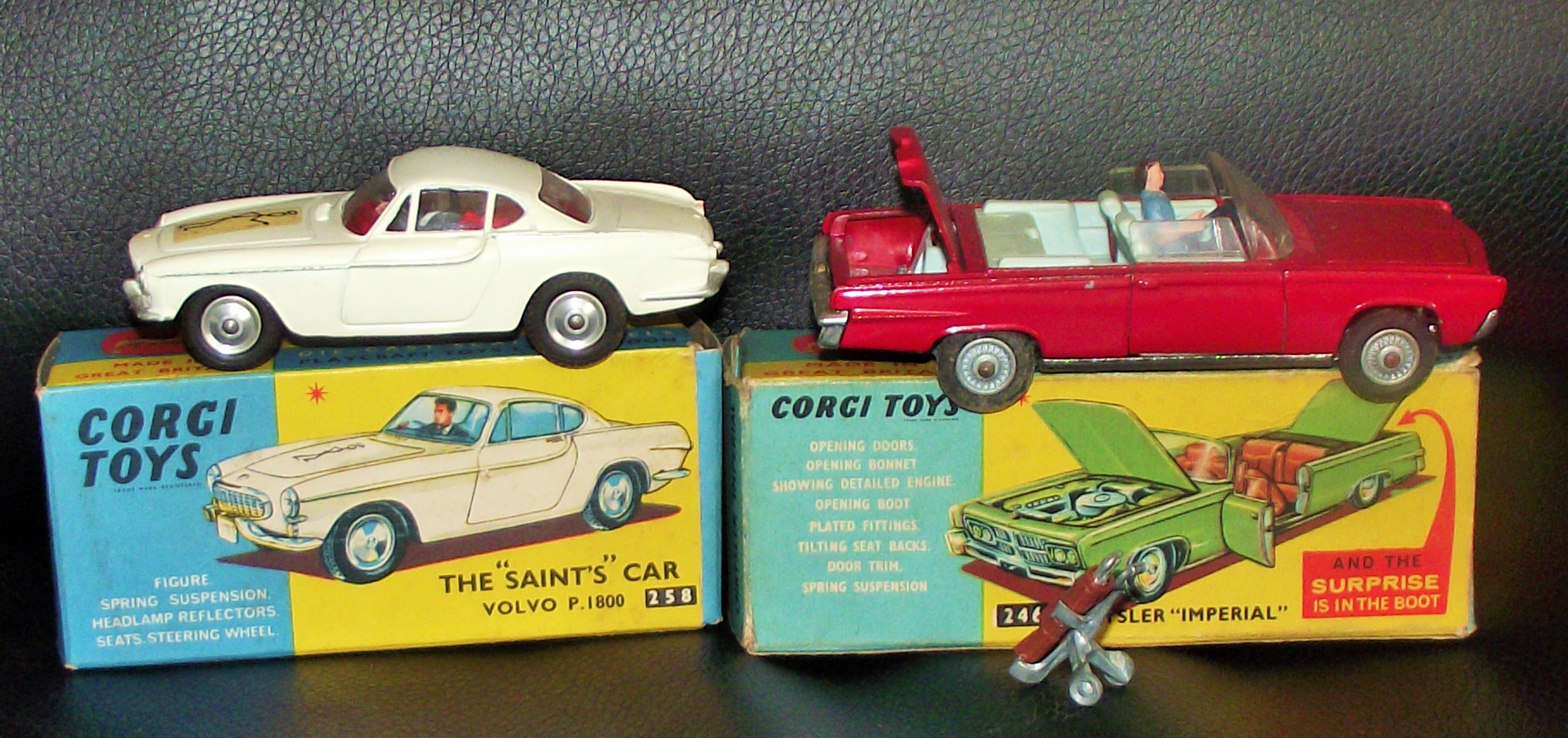 Corgi 246 Chrysler imperial with driver and golf clubs in boot both box & car fair condition + Corgi 258 The Saints car both box & car in fair condition