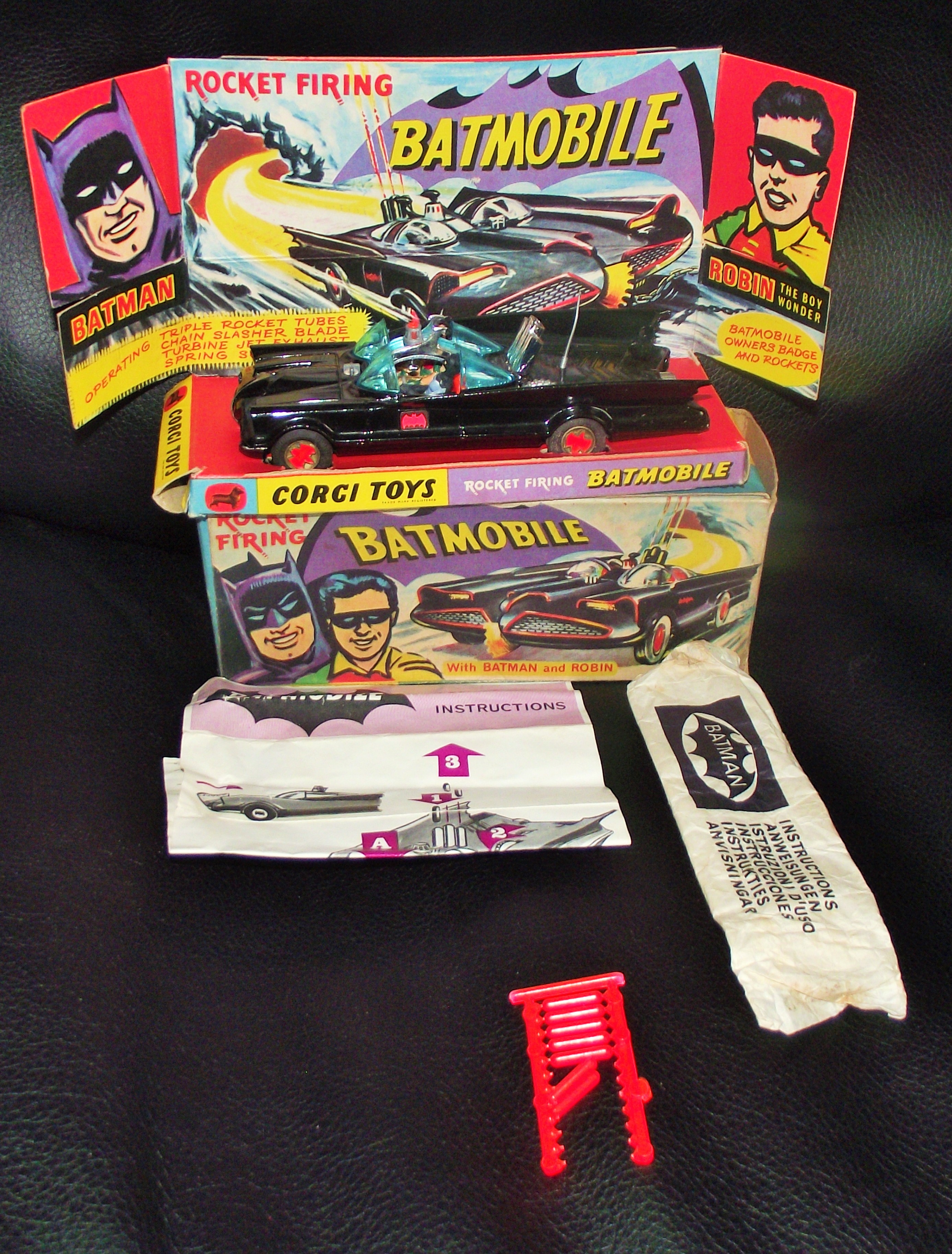 Corgi toy 267 Batmobile in original box with both figures , paperwork , rockets etc , both car and box in very good condition
