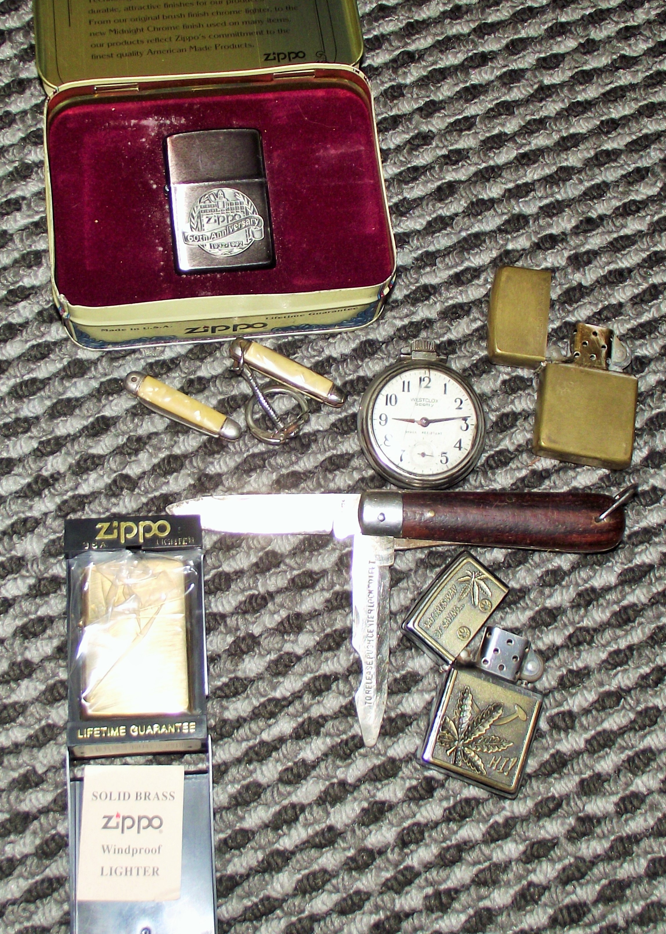 Zippo lighters +Westclox Scotty pocket watch ( working) + pearing knife + 2 small pocket knives