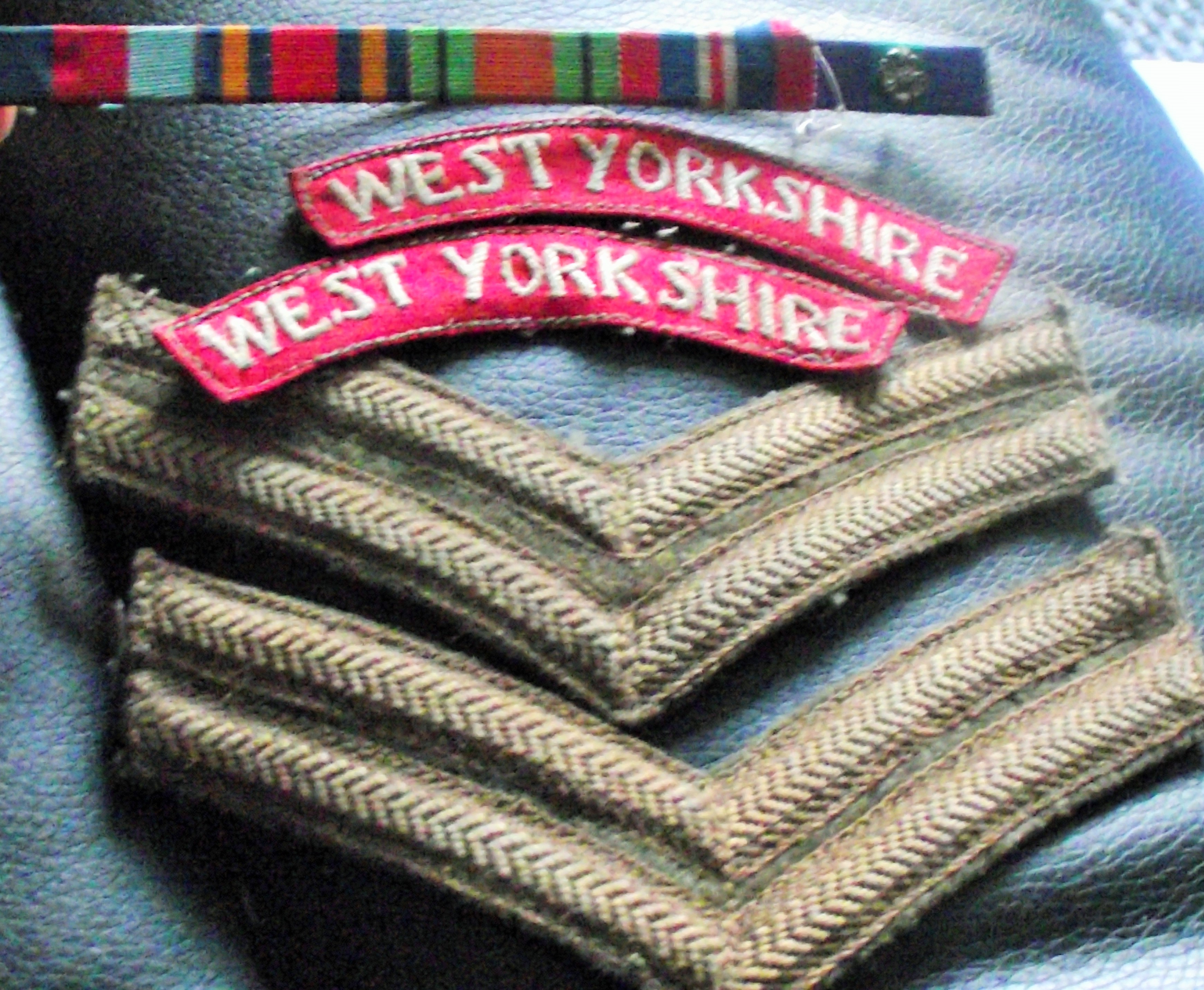 WW2 blouse battledress West Yorkshire regiment PTE R H Wheeler no 1471624 Ribbon bar with rosette ,corporal stripes 2x west yorksire regiment patches .