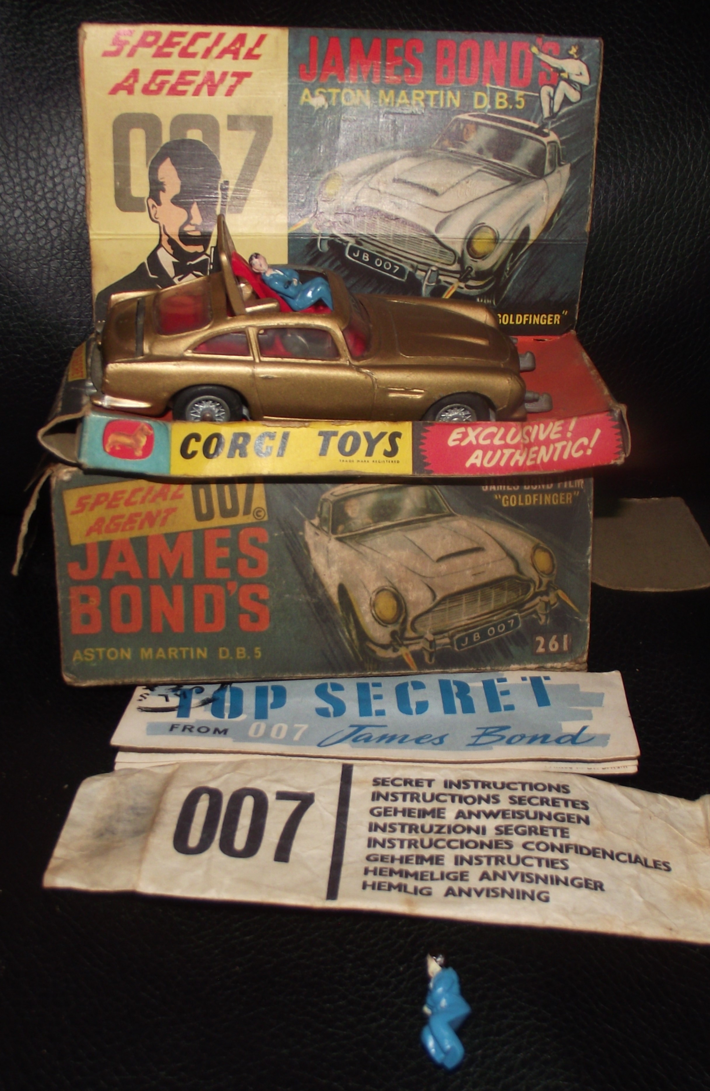 Corgi 261 James Bond Aston martin DB5 play worn no paint loss figures included paperwork and spare ejector seat agent , box in rough condition