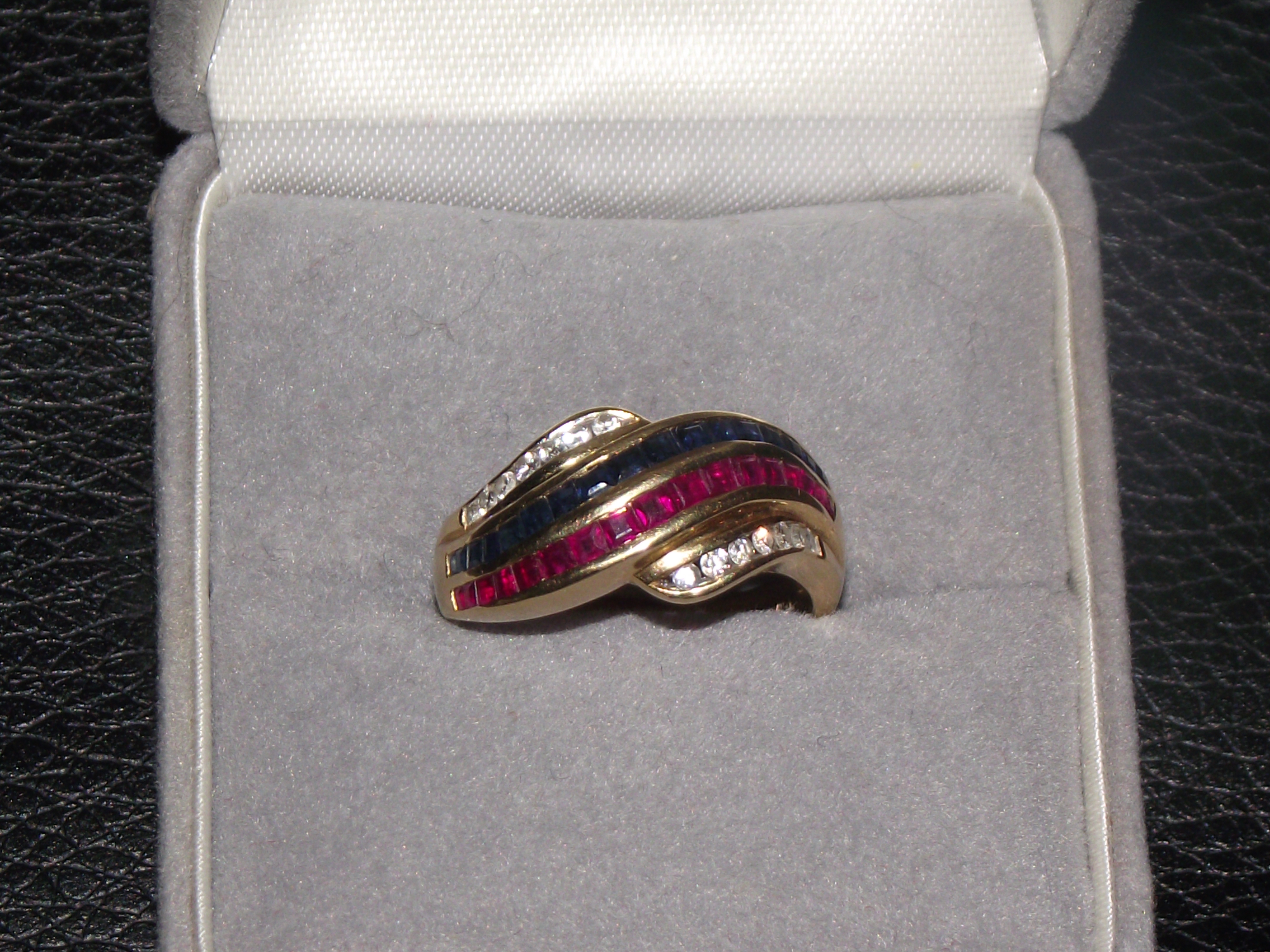 18ct gold ladies ring marked 750 set with rubies emeralds and diamonds in a crossover design size N 5.5g