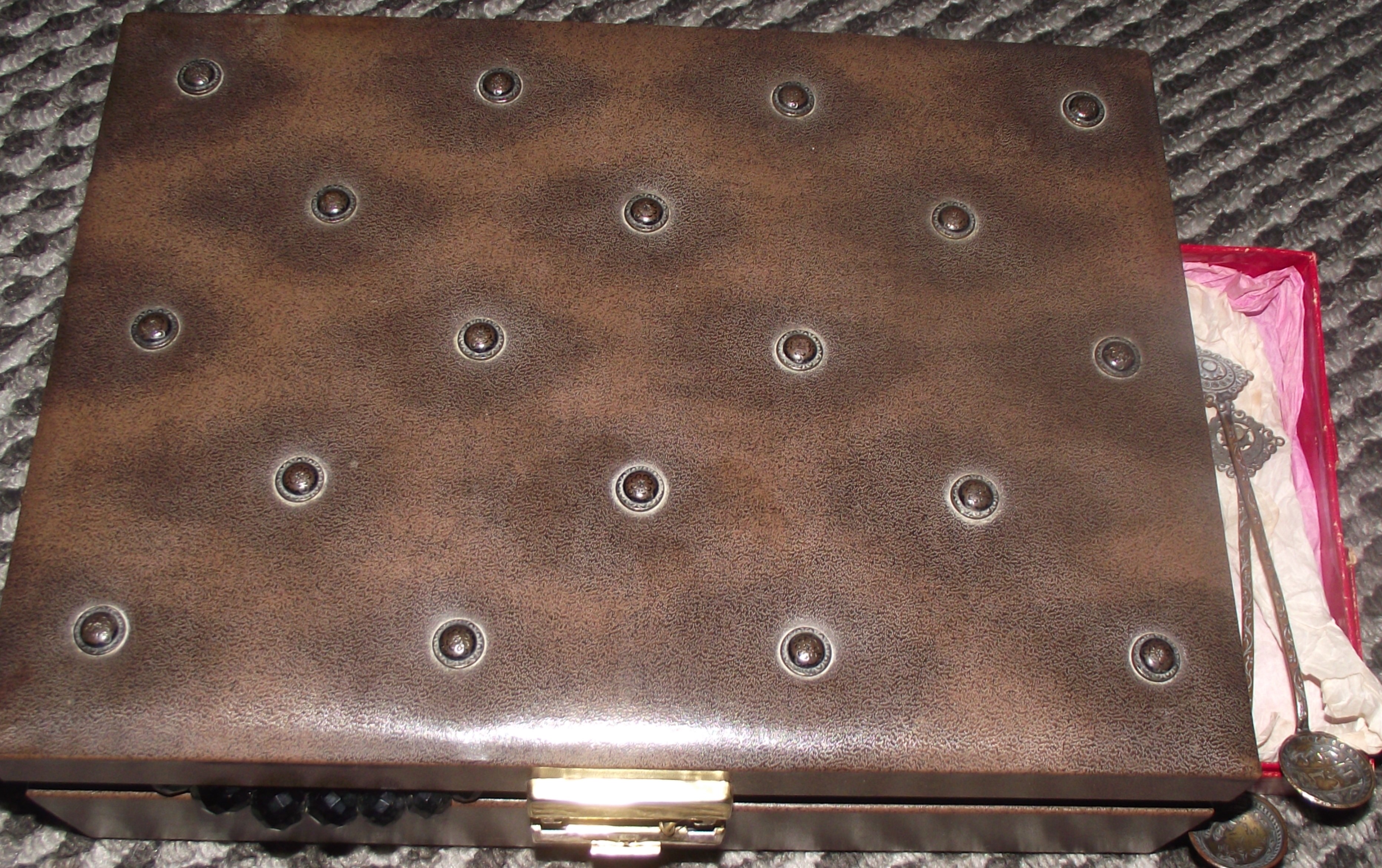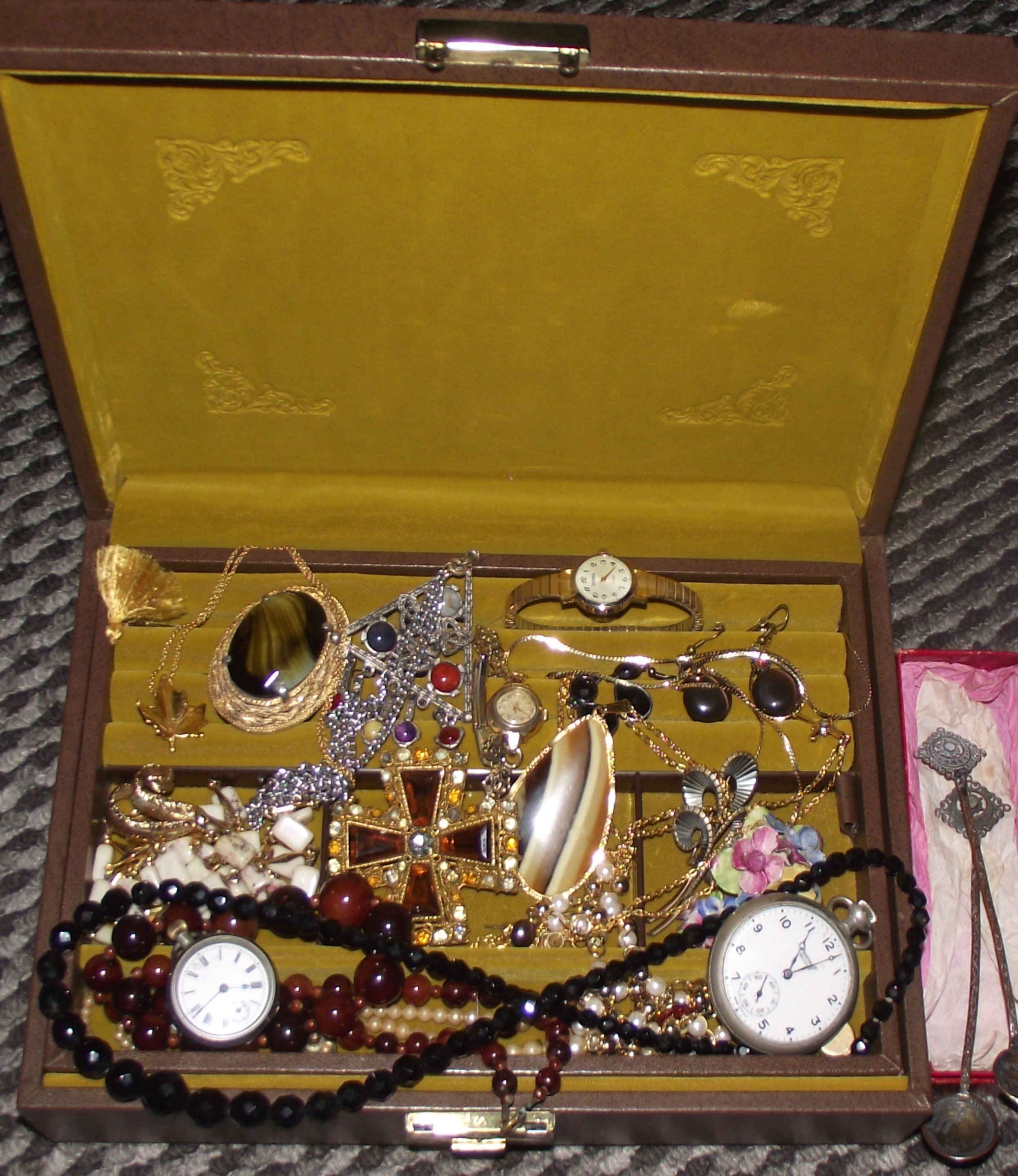Nice selection of assorted costume jewellery including several pieces marked gold plated all in an unusual leater and stud set style jewellery box + Ladies stainless cased small pocket watch ( seen ticking) + Gents stainess casedc Ingersoll reliance pocket watch + pair ofegyptian style coin spoons