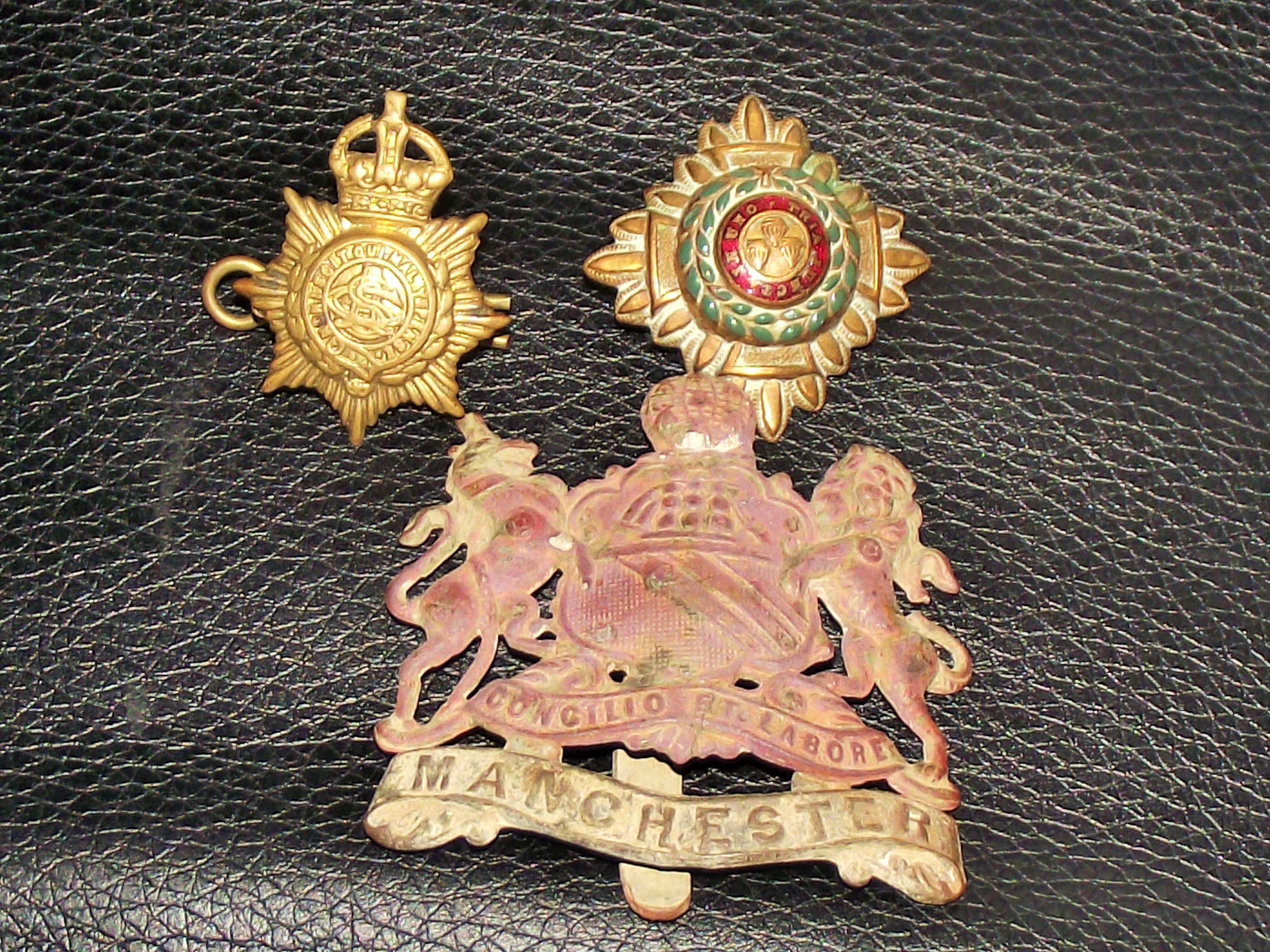 WW1 Officers Tria Juncta in Uno Brass enamel 3 Pip Military Naval Lapel badge + Great War Manchester Regiment Cap Badge + World War One officers cap badge (‘Honi soit qui mal y pense’, which means ‘Shame on he who thinks evil of it’.