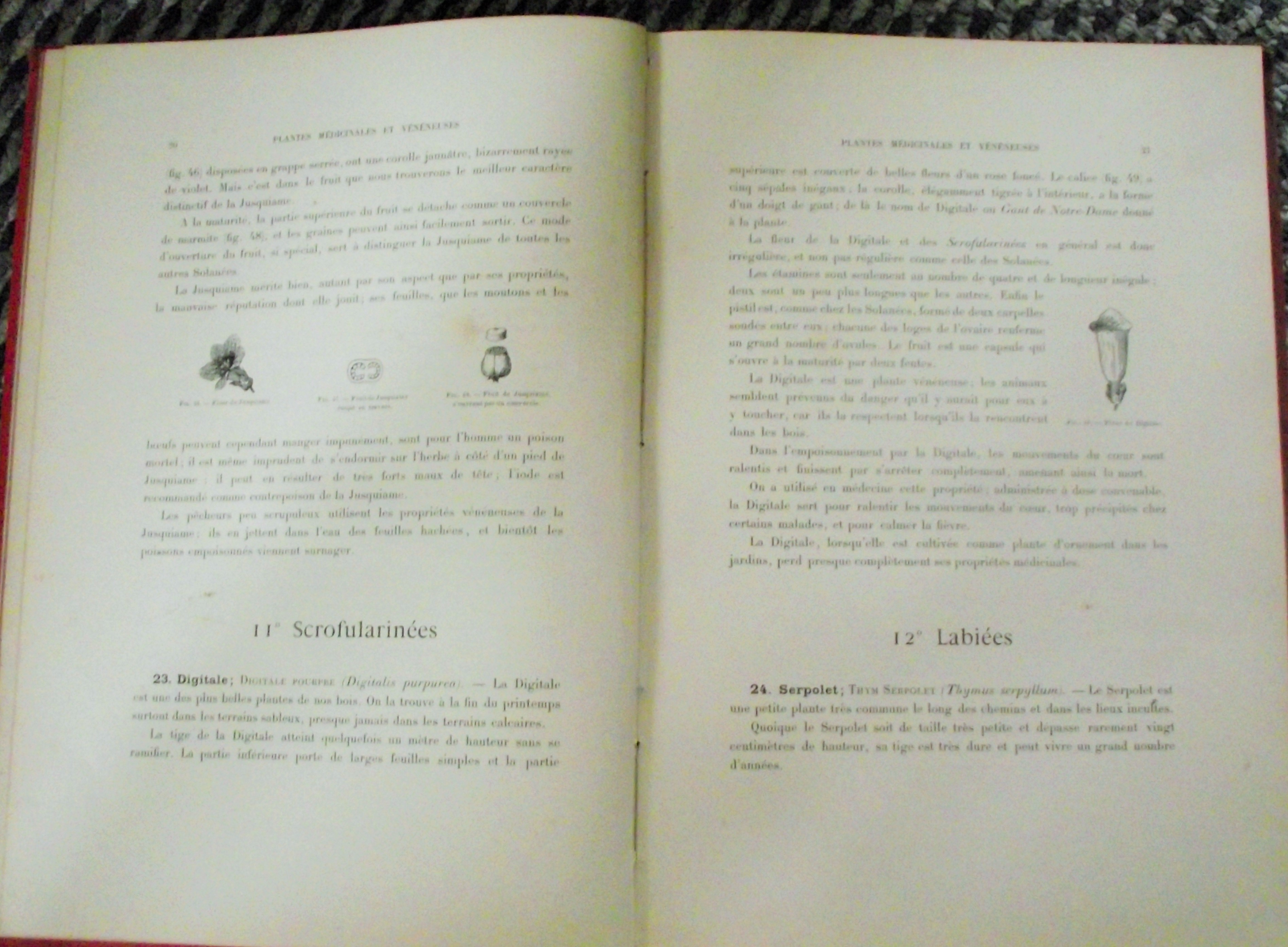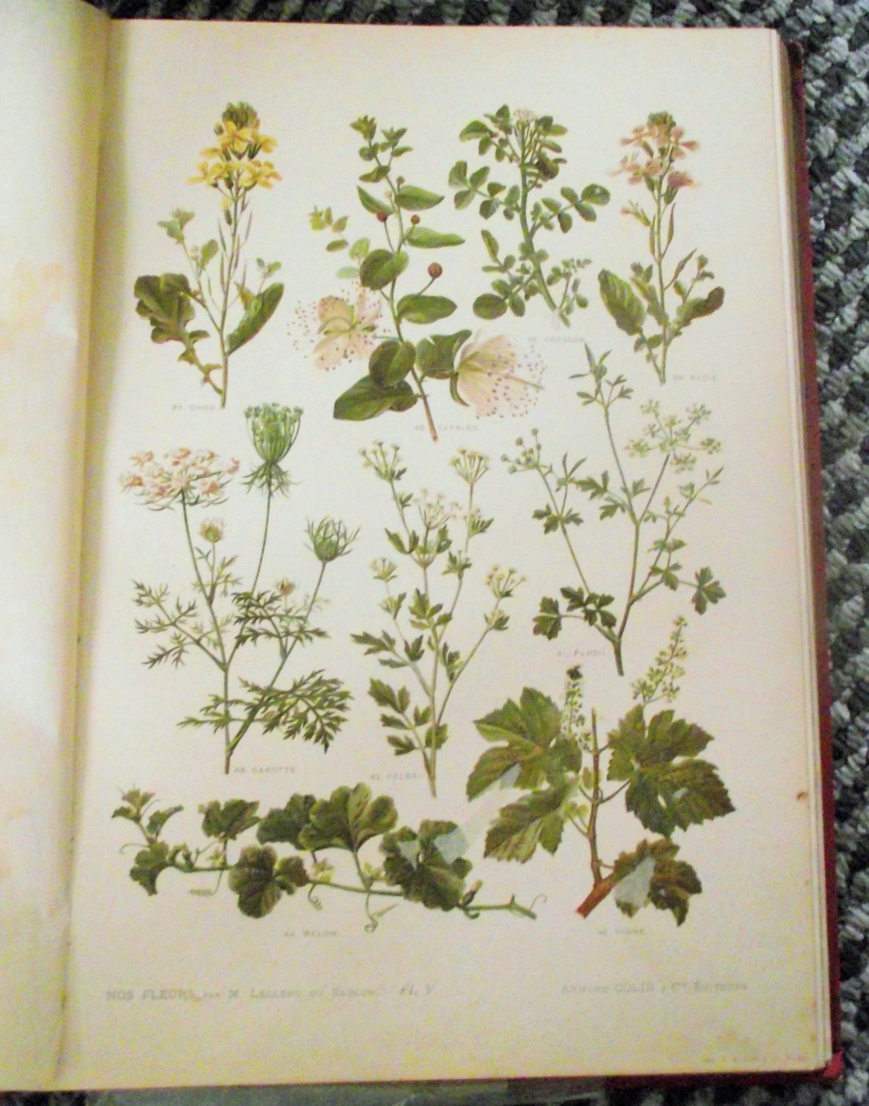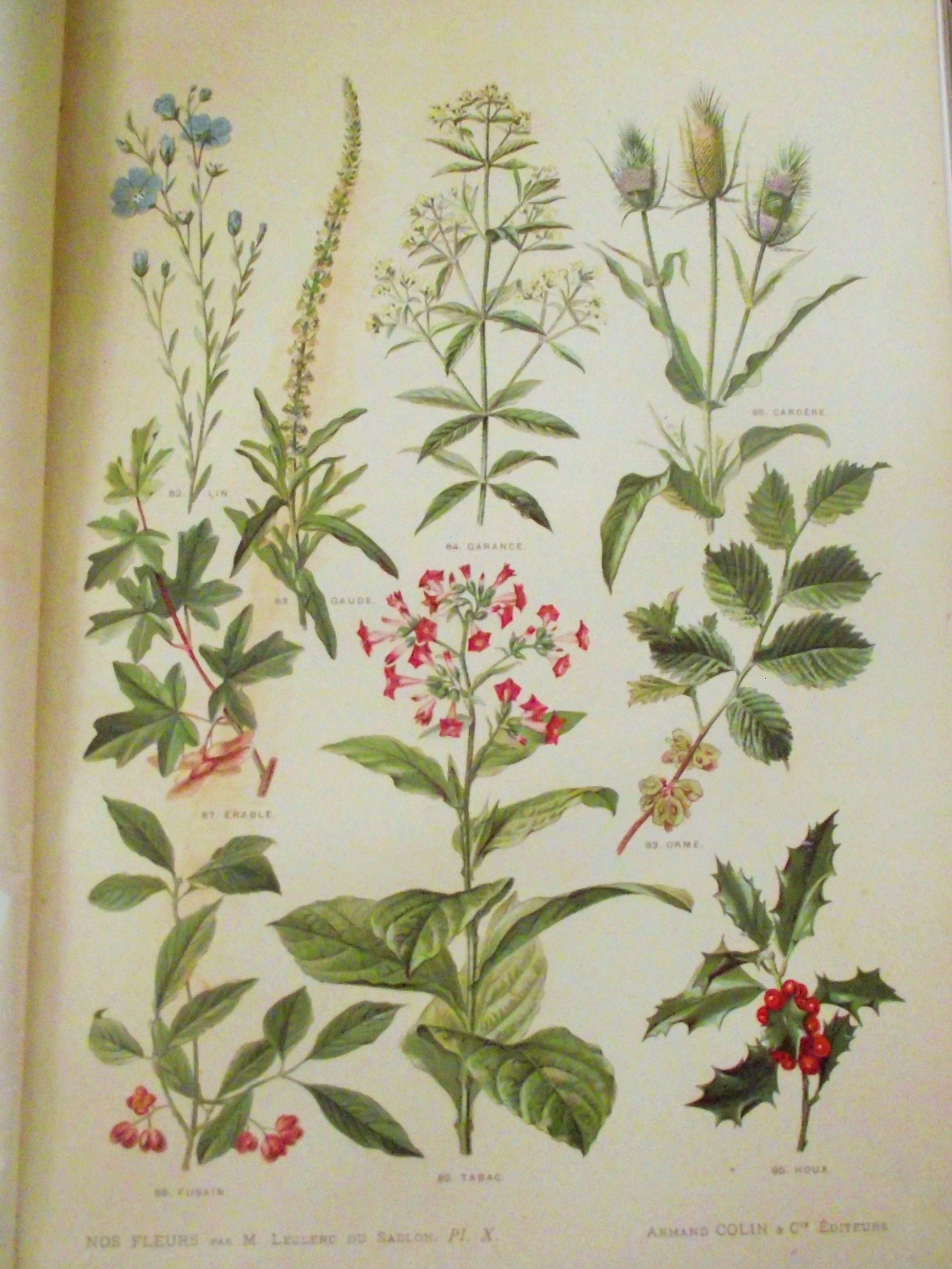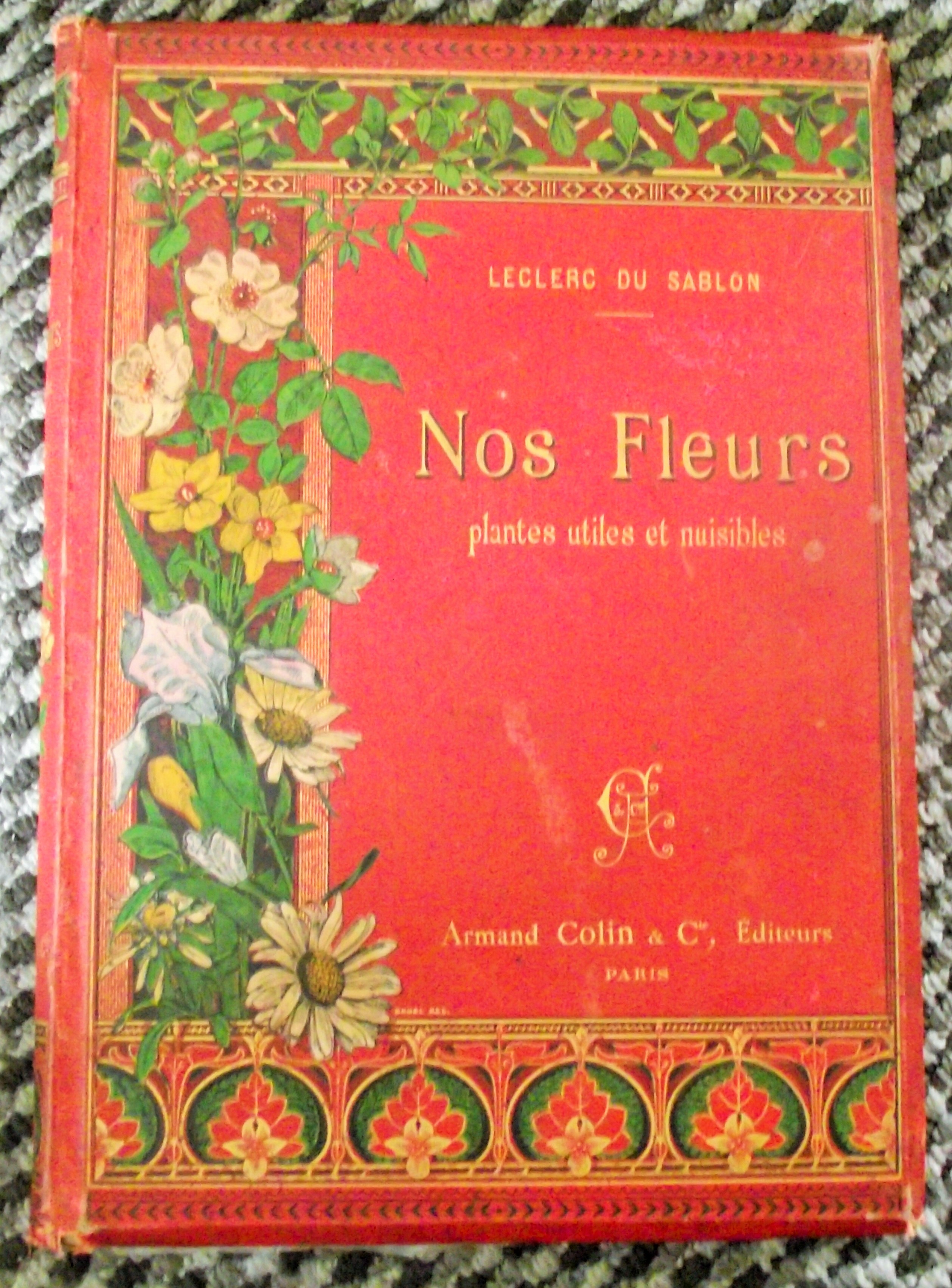 BOTANY] LECLERC DU SABLON – Our flowers, useful and harmful plants – Paris Armand Colin et Cie SD – red percaline binding, the spine and outer cover decorated with flowers and foliage friezes, titles and authors in gold letters – 132 pages – illustrations in and out of text, the color plates underneath meander.Black & White and colour plates (rubbed binding, – interior with some foxing and stains)1895/98