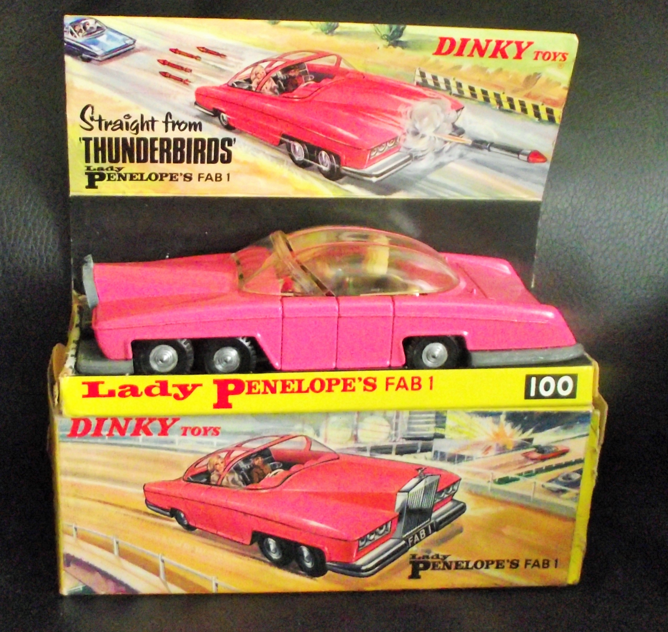 Dinky 100 FAB 1 Thunderbirds Fluorescent Pink Gerry & Sylvia Anderson TV series with rockets for front and back car in very good condition box fair to good condition includes both figures