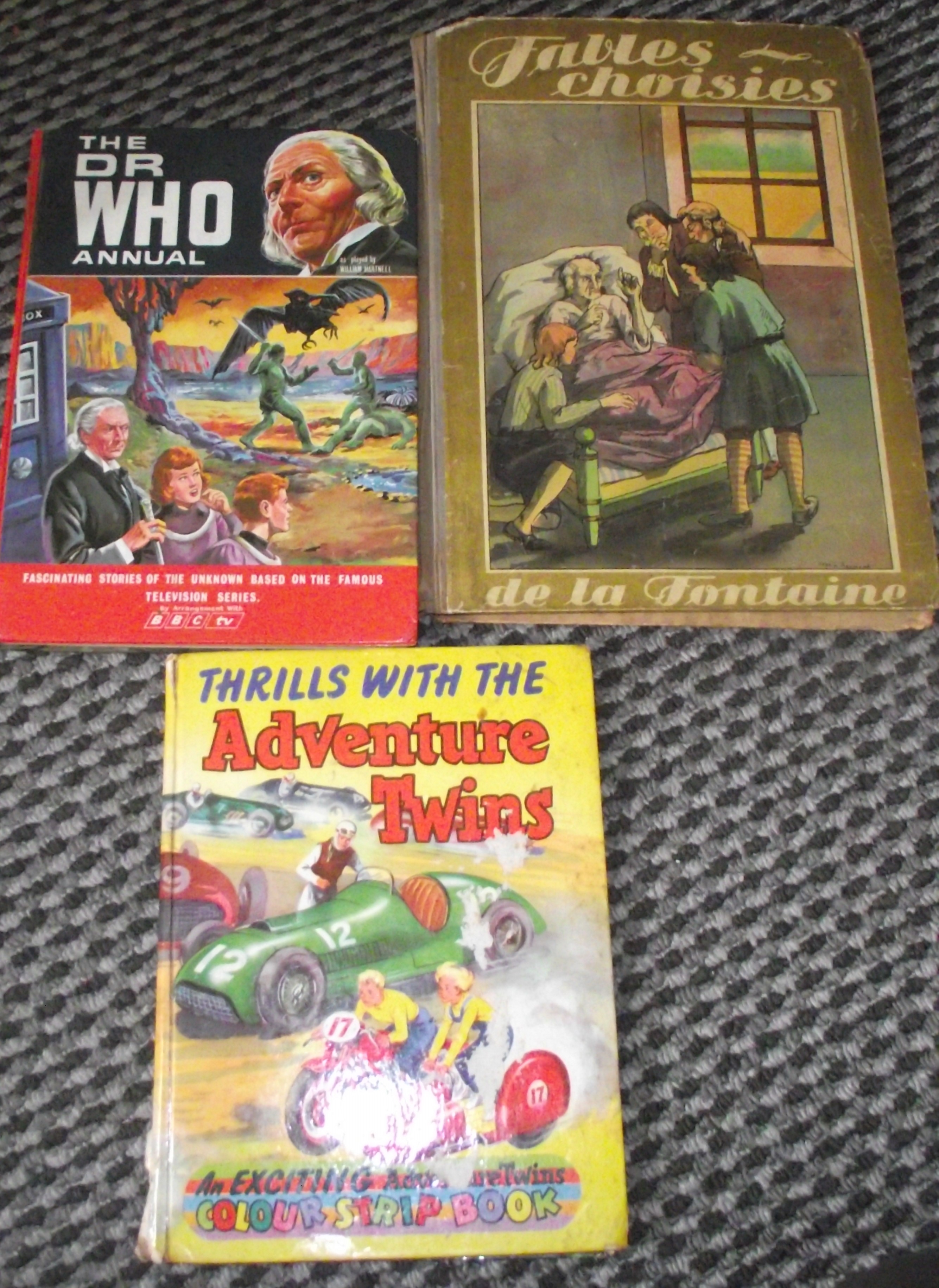 Dr Who annual Second annual issued – William Hartnell as the original Doctor, sold at Christmas 1966 – for the year 1967. with cancel stamps inside cover + Thrills with the Adventure Twins.Thrills with the adventure twins hardback storybook early fifties’, and was published by Sampson Low, Marston & Co. Ltd.some drawing on internal front & back cover + Rare French 1920s story book Fables Choisies De la Fontain edition rene Touret paris