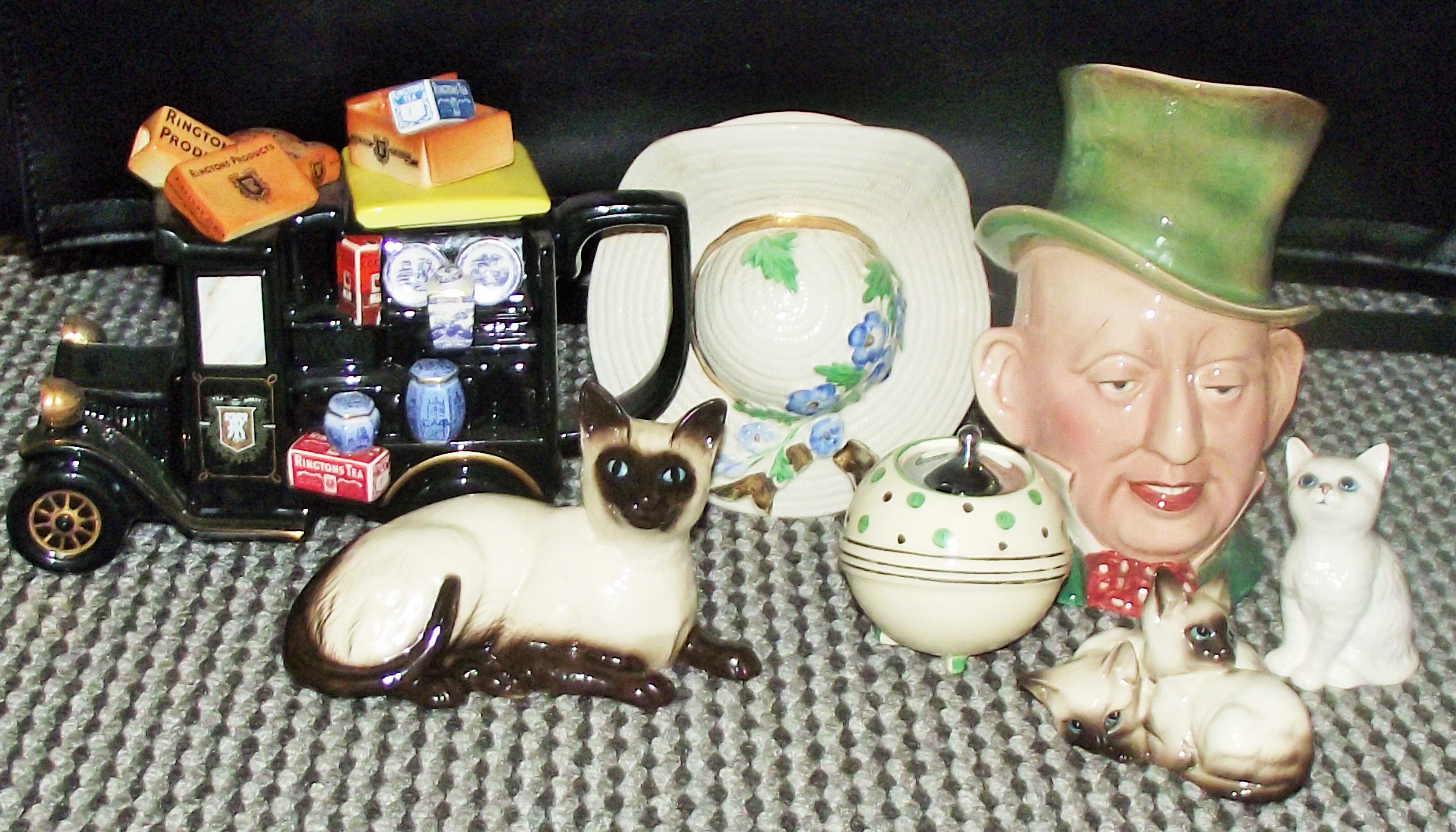 Good collection of assorted collectables including The Ringtons Van Teapot By Paul Cardew Design – Number 4132 ltd edition with certificate of ownership + Beswick siamesecat and one other beswick cat +Royal Doulton siamese cat + Beswick Micawber 310 jug +1930s style wall pocket & 1930s preserve pot