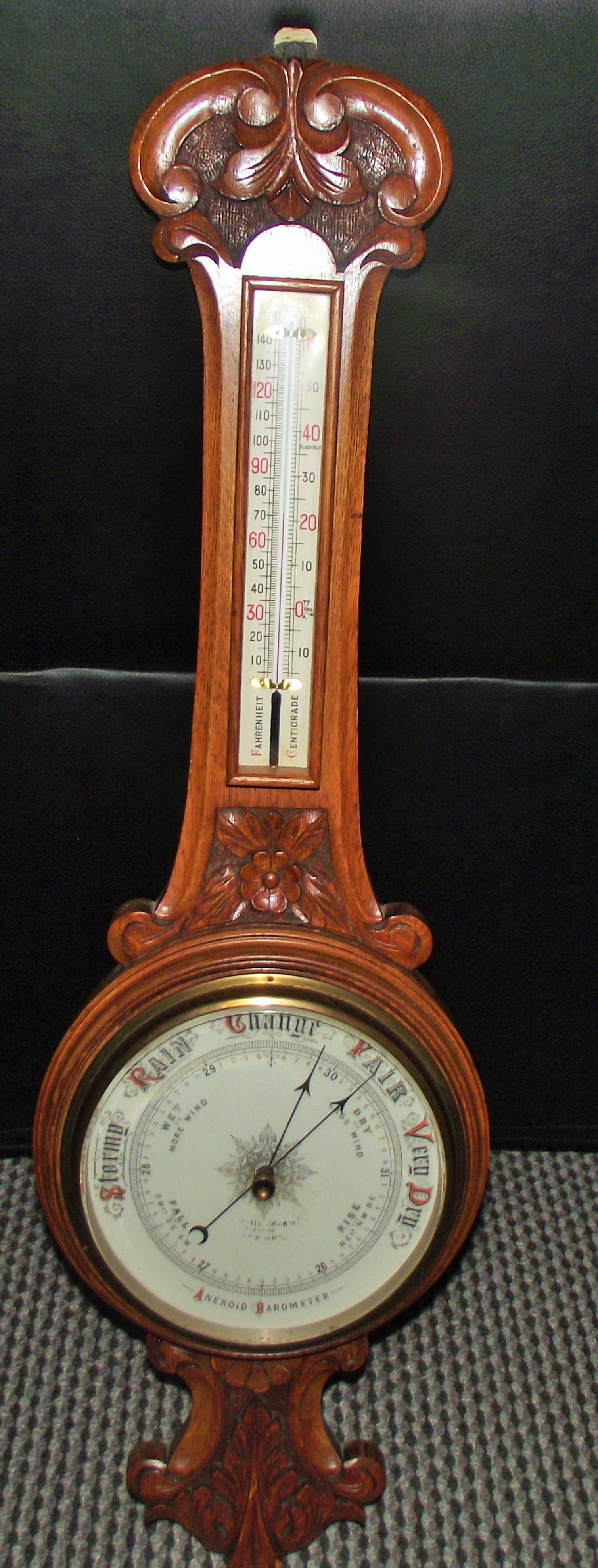 Quality Edwardian Carved Oak Barometer and Thermometer Circa 1910 oak frame with foliate carving to the top and base, central rectangular thermometer with glass facing. The barometer with bevelled edge glass, white painted face and adjustable arm, contained in a brass bezel.makers name rubbed 33″ approx