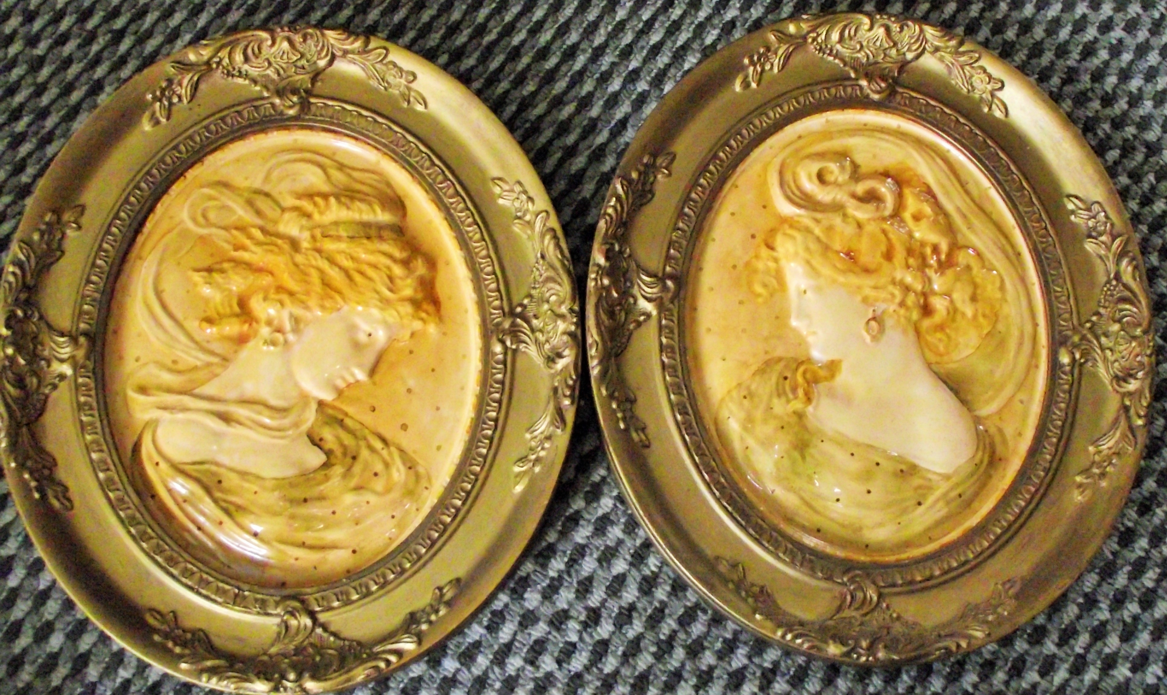 Pair of Vicorian heavy glazed cameo profile wall plaques in original gilded frames 13/11″