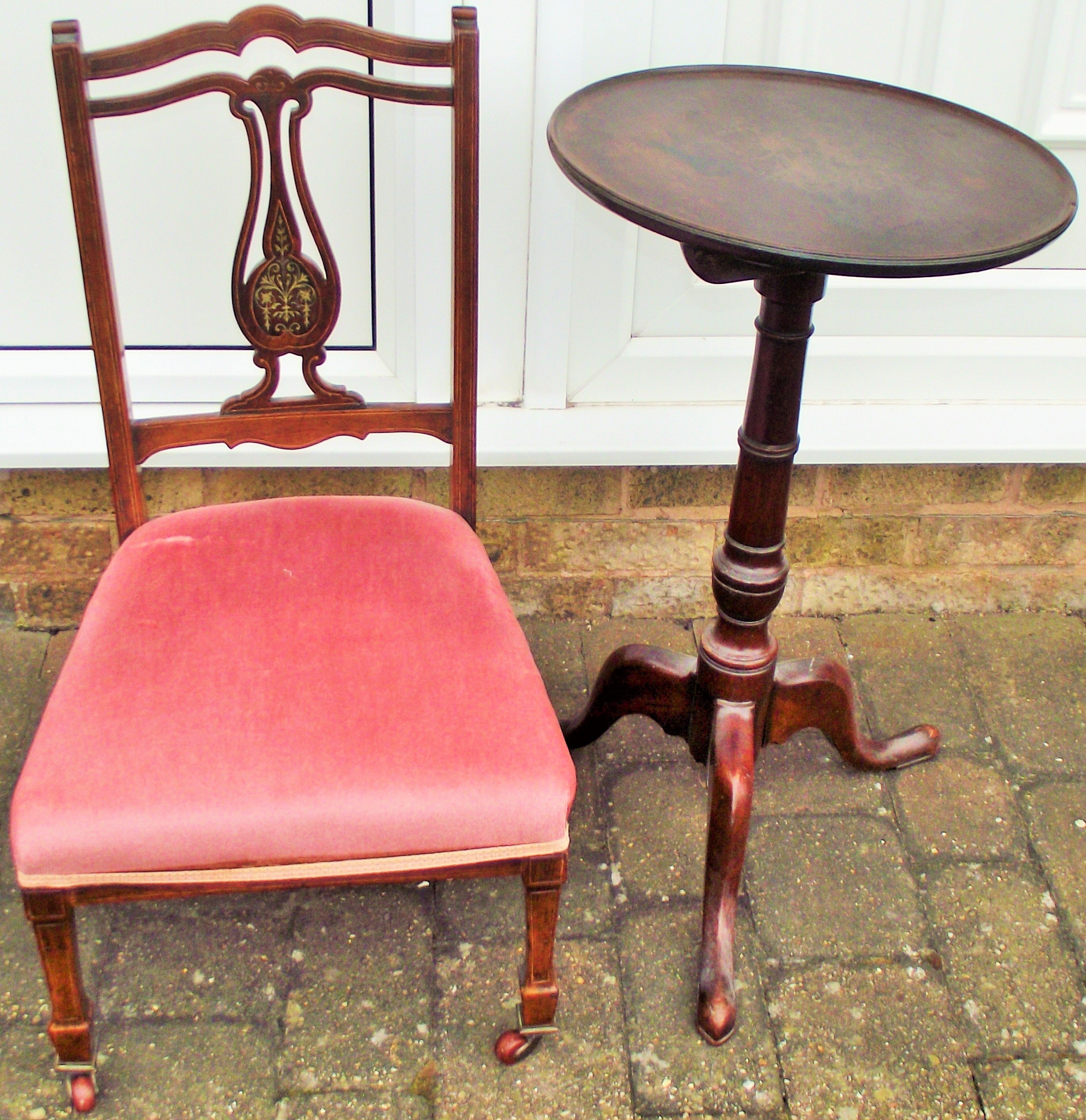Antique mahogany tiltop side table + edwardian inlaid low seat sewing chair on castors