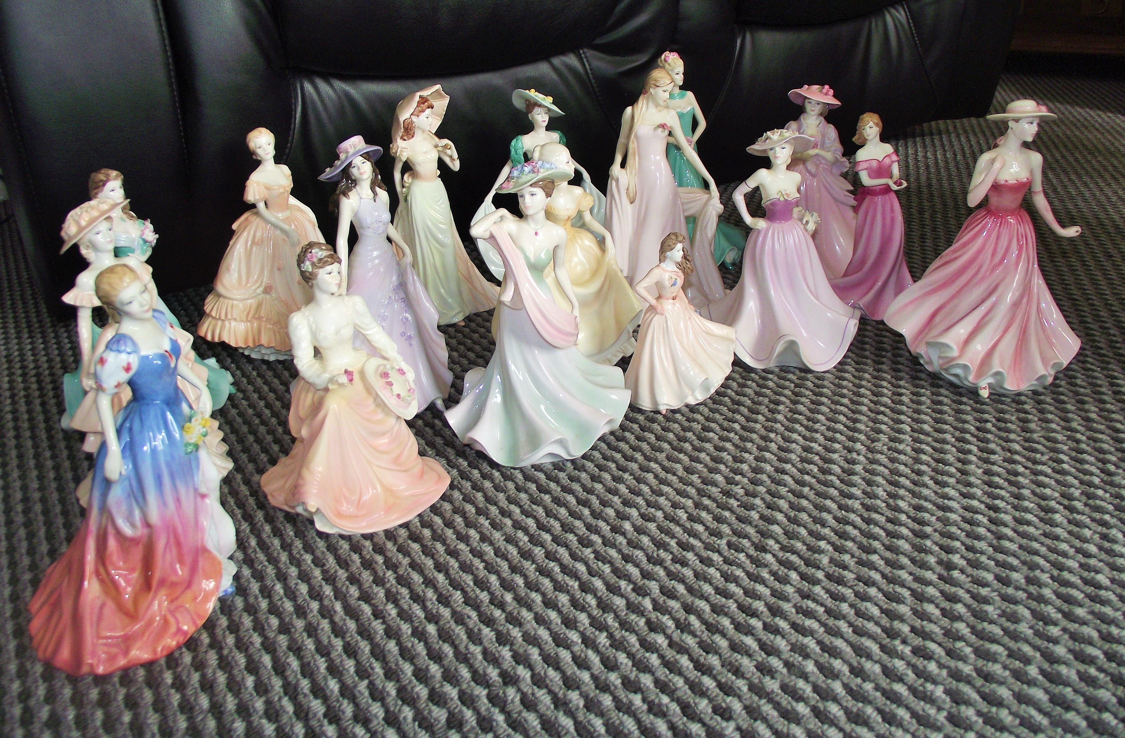 14 X coalport lady figurines mainly Ladies of fashion + Royal Worcester Birthstone cancer + 2 x Royal doulton Pamela & chloe