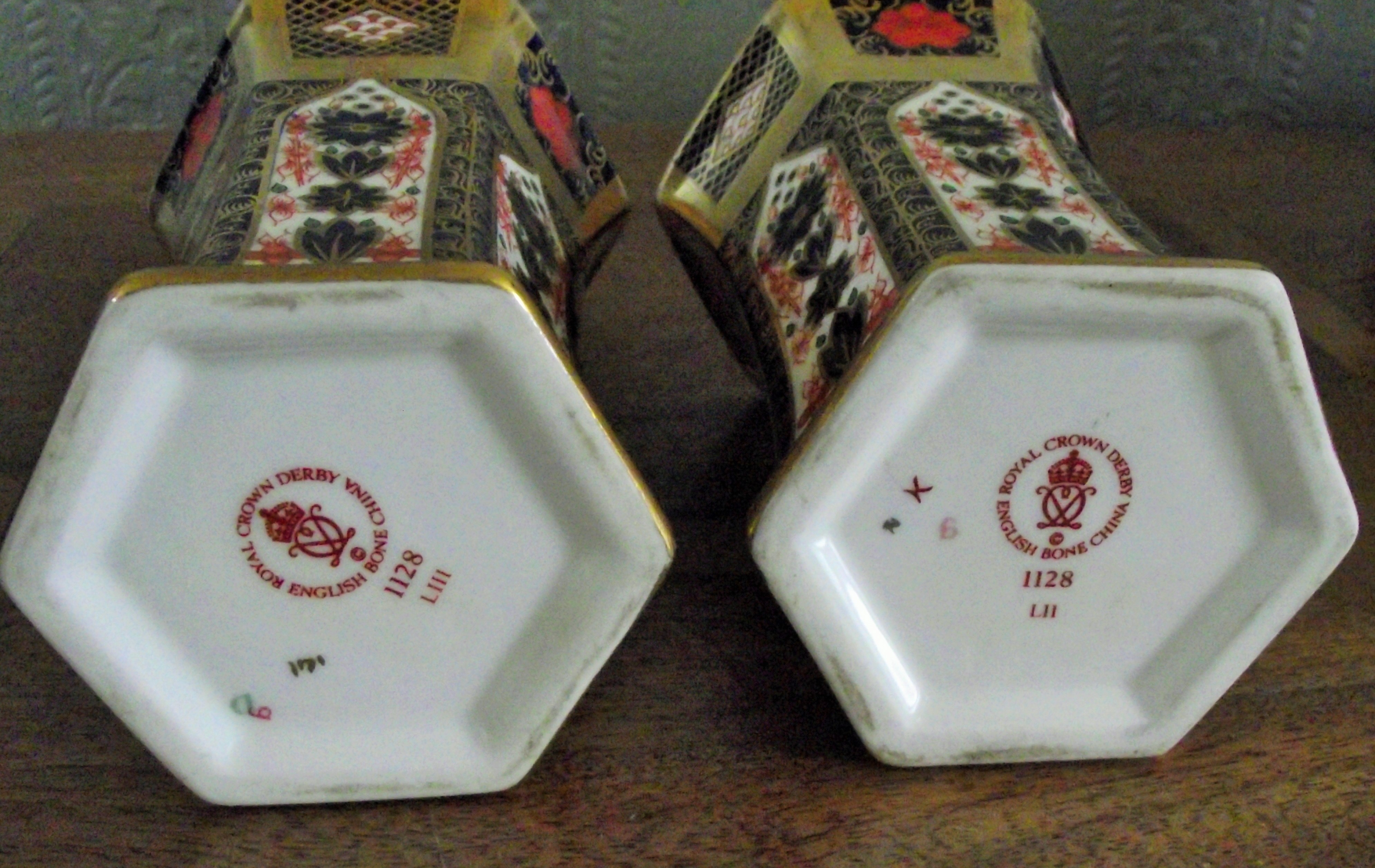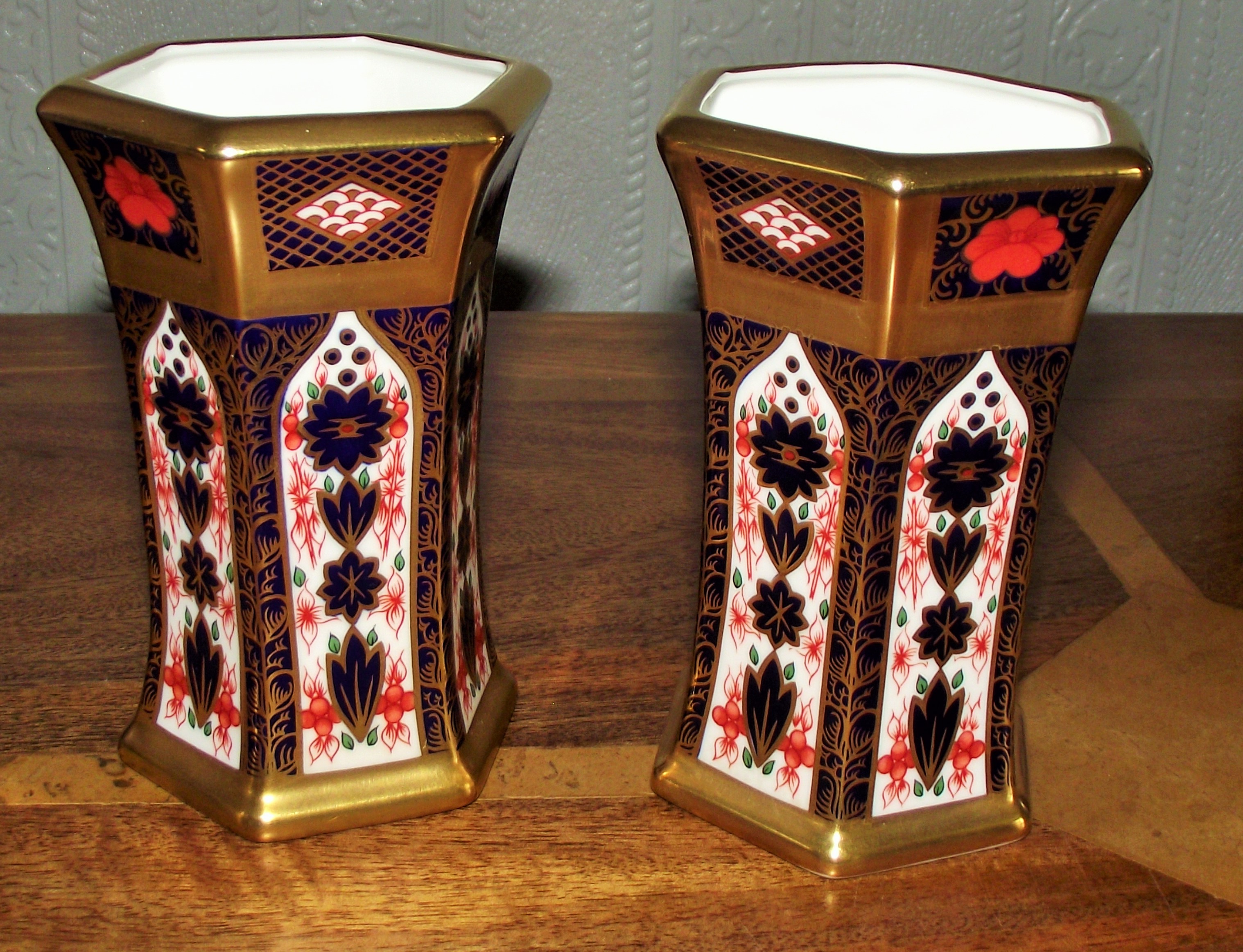 Pair 0f 4.5″ tall Royal Crown Derby 1128 Old Imari Pair of Hexagonal Vases 1st Quality solid gold band ( no scratch out marks to base )