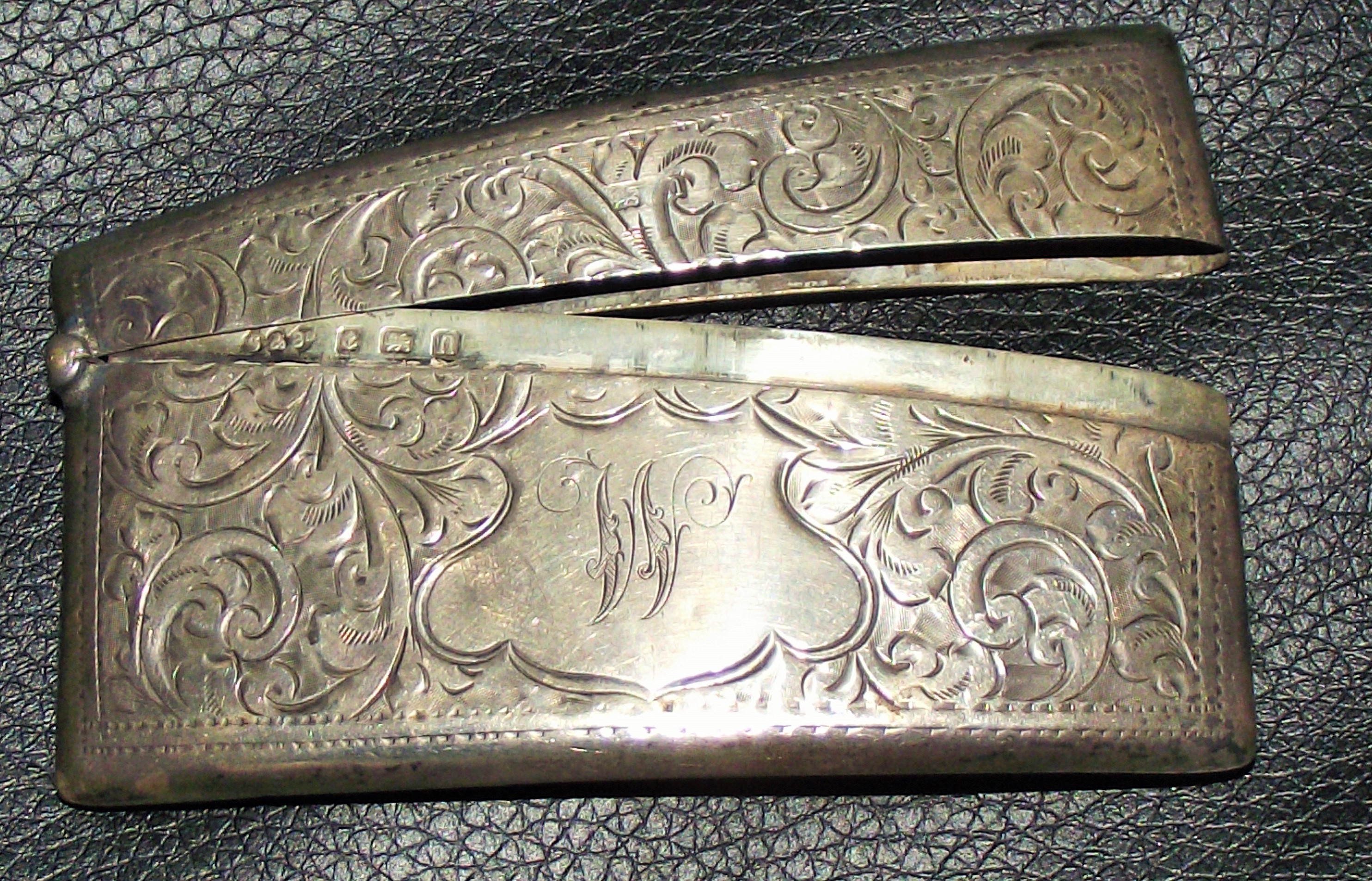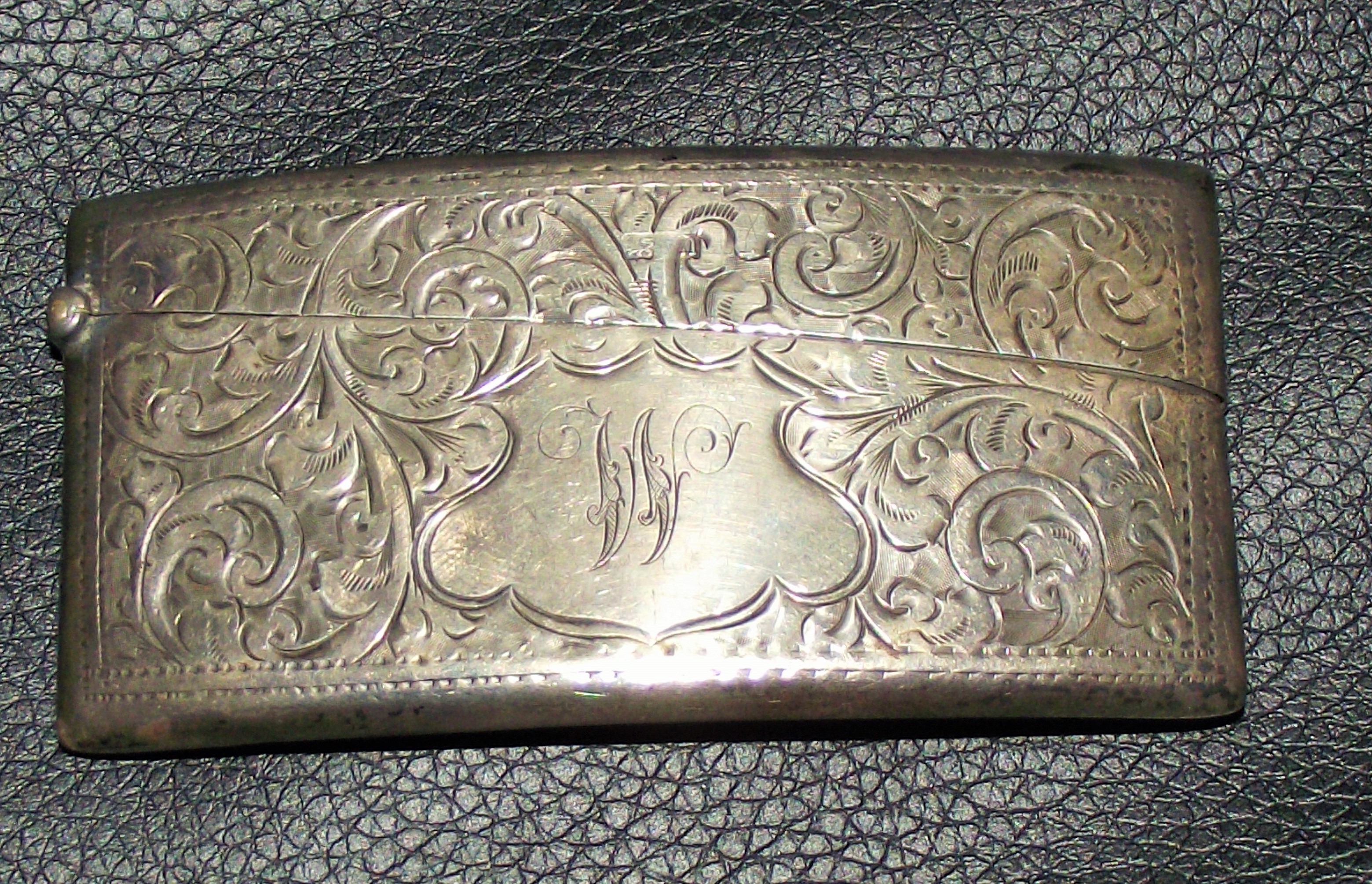 Silver Edwardian card case of curved form highly engraved with initialled cartouche