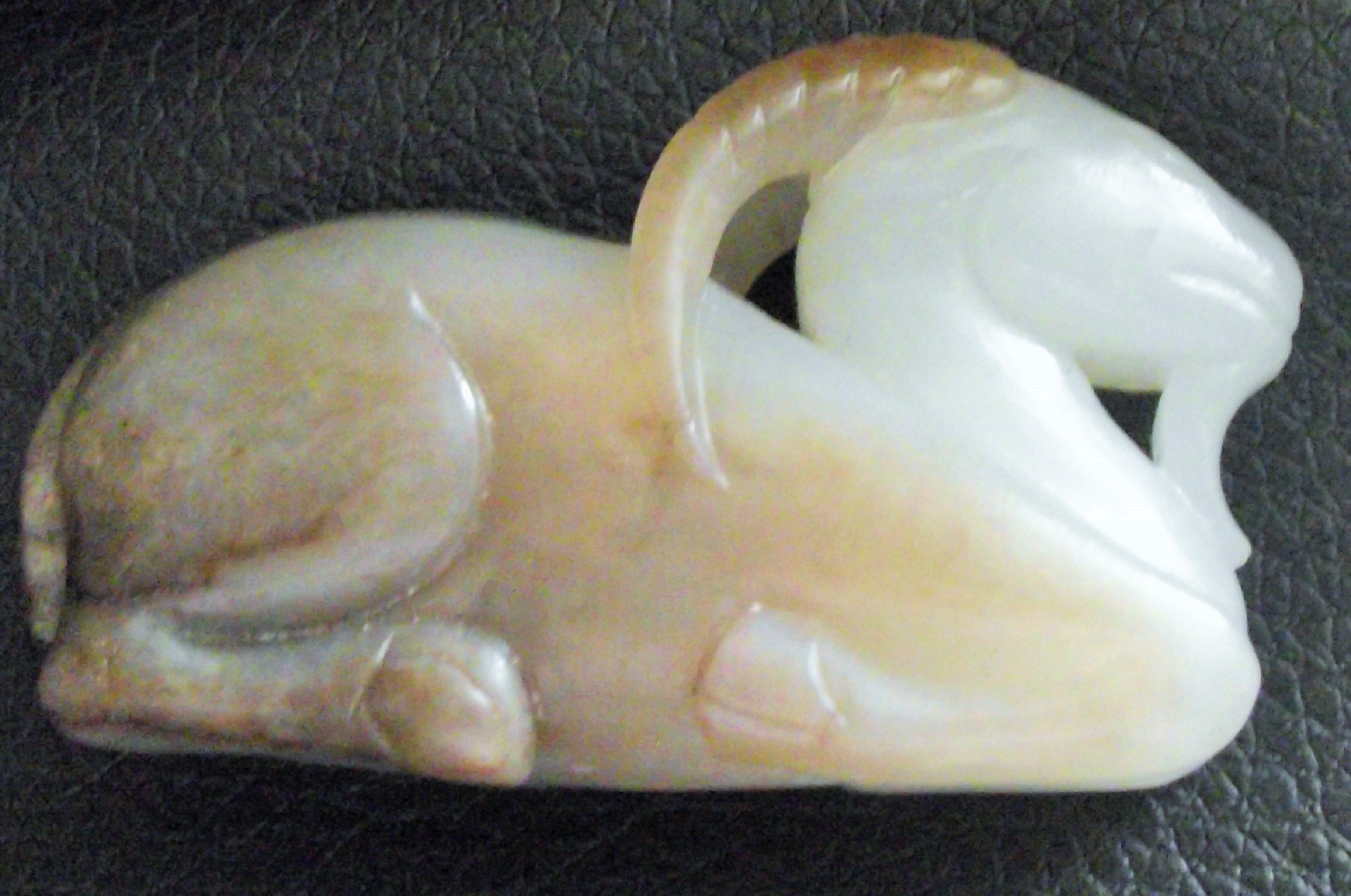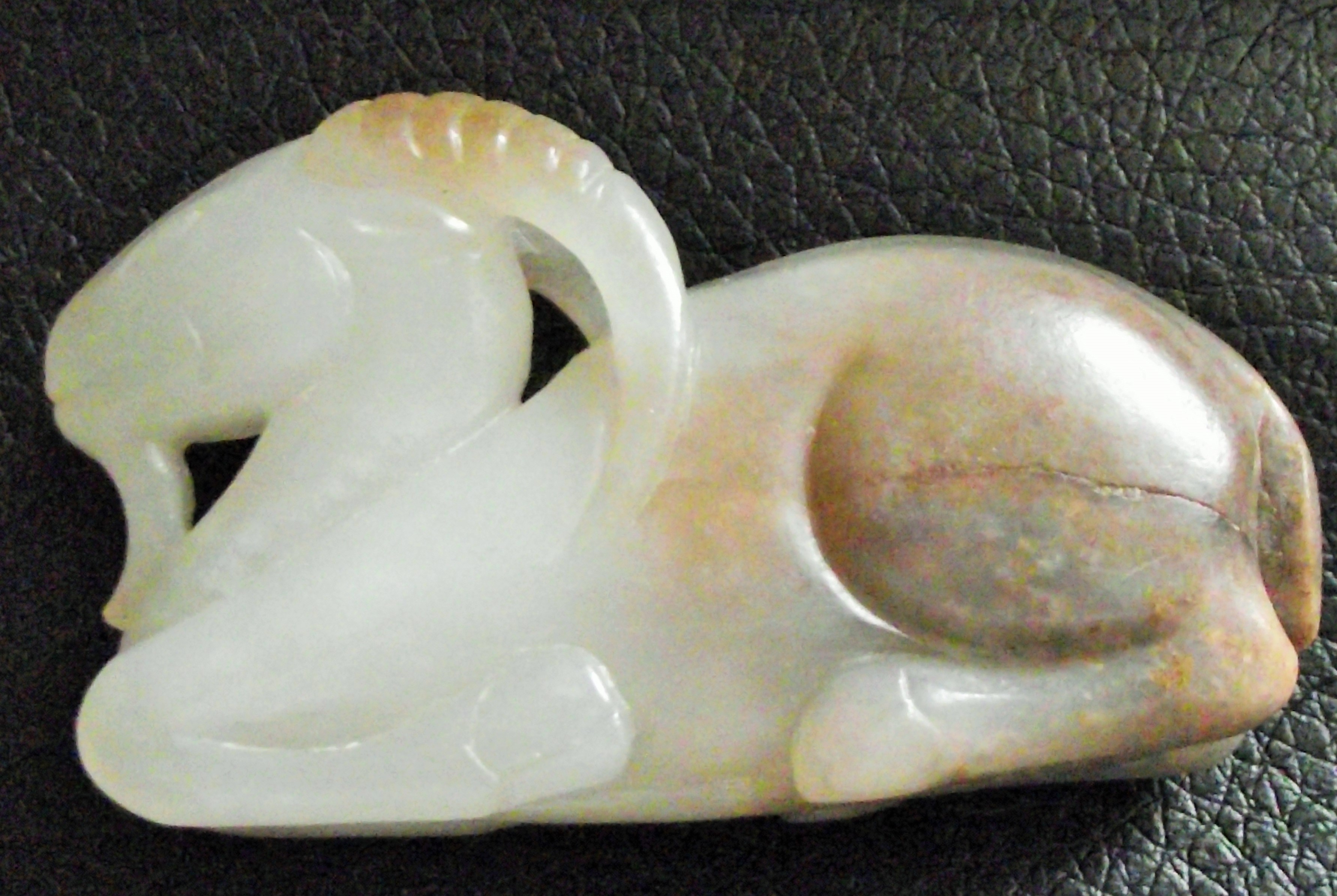 1st part of a life long collection of Jade & curiositys .A 19thc Chinese pale celedon Jade carving of a ram The recumbent animal with his legs tucked underneath the body, the head with curved highly detailed horns facing back down its body, the stone with russet inclusions. 5cm approx