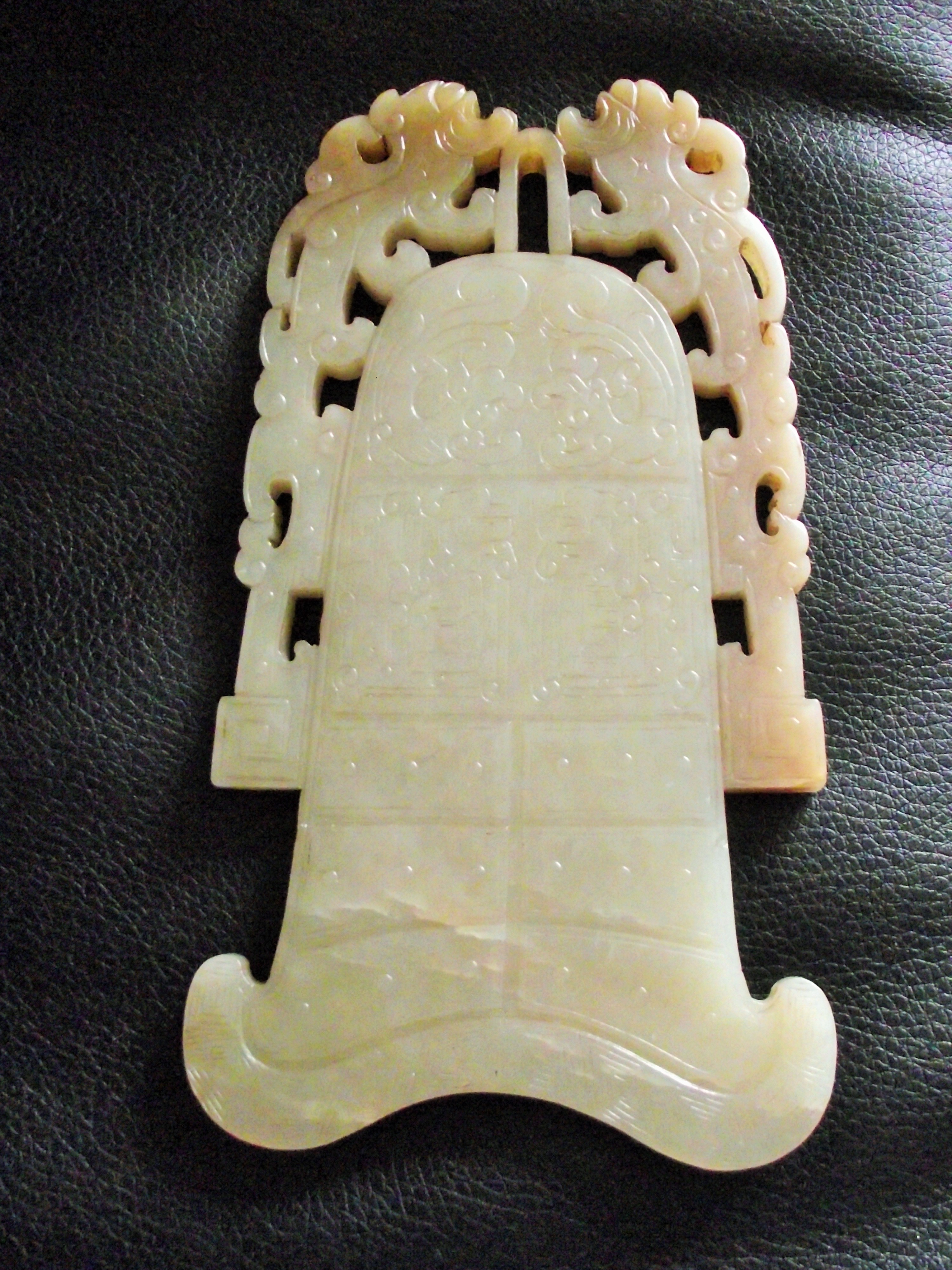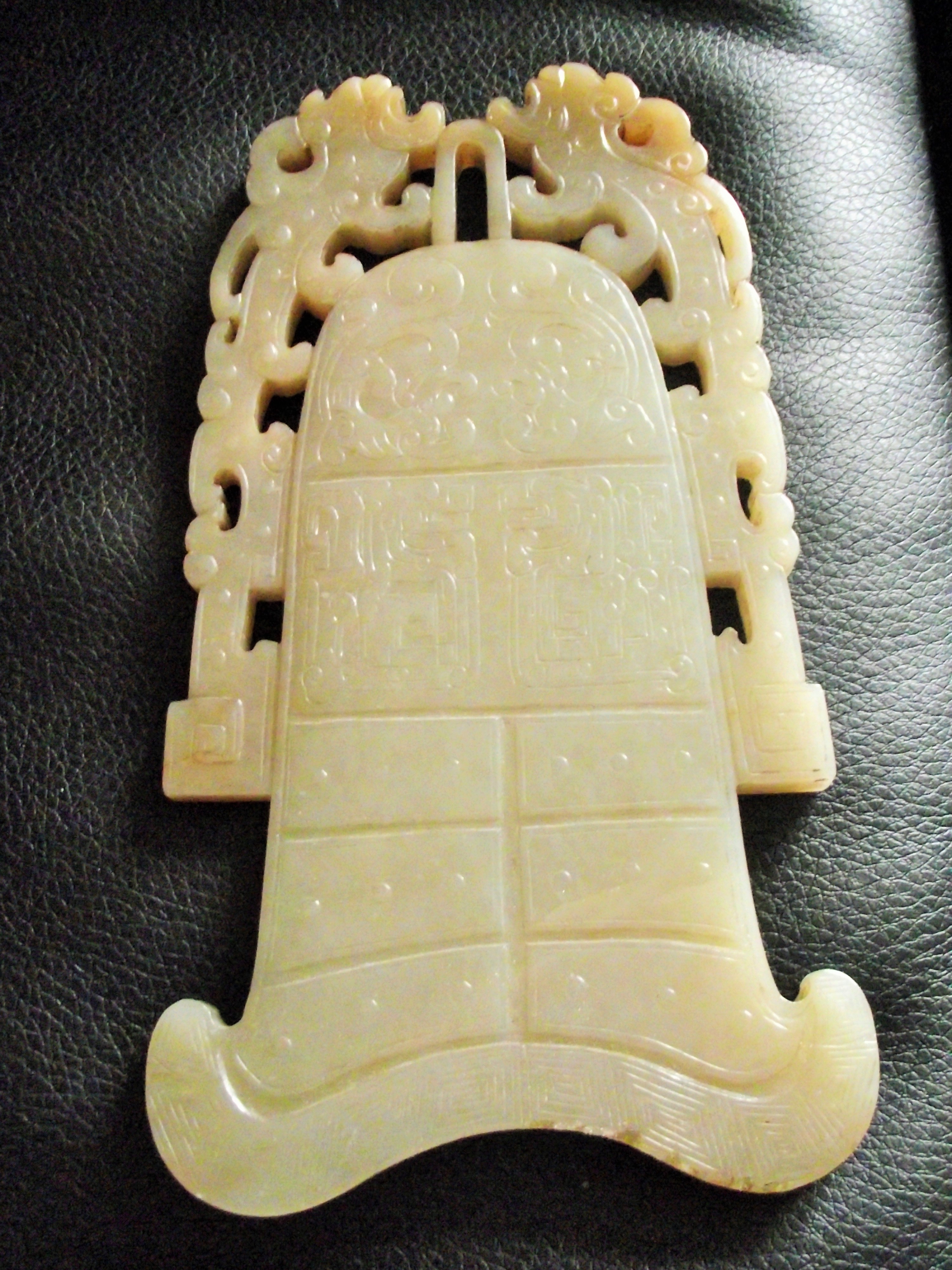 Rare large 16x9cm 19thc partially pierced creamy white with hues of burnt orange & brown Jade plaque ornately carved on both sides ,very slight nibbles to bottom edge on one side