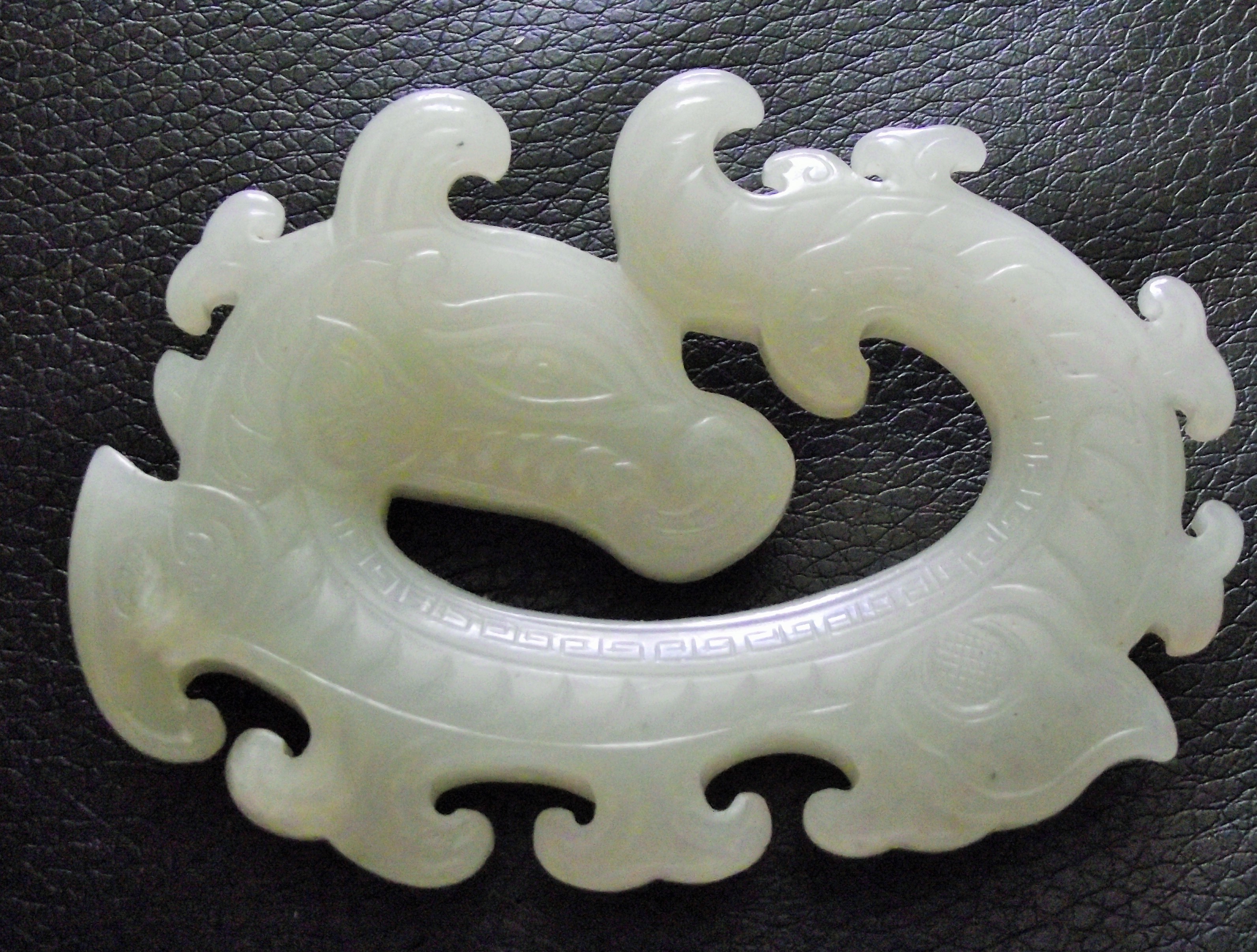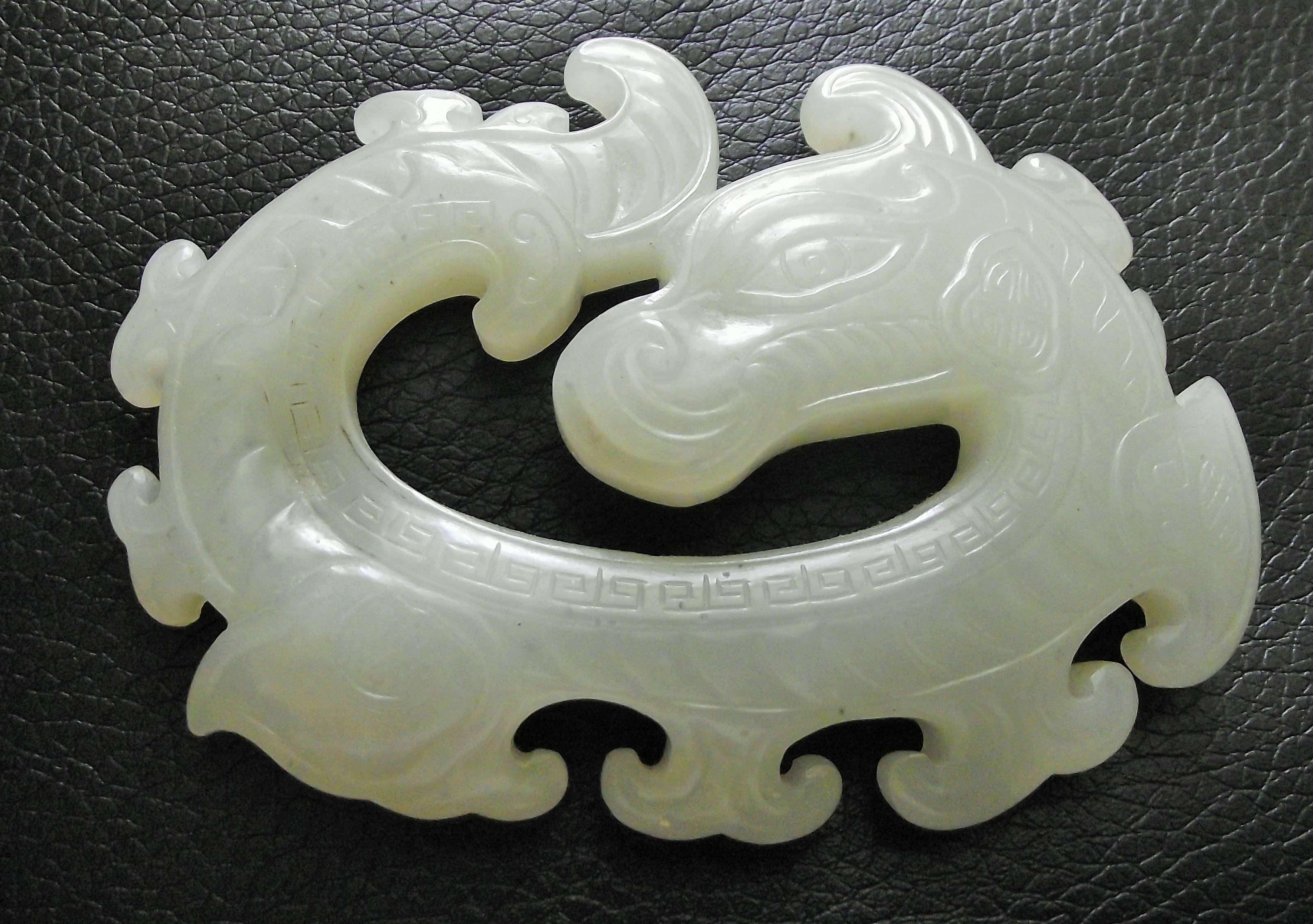 Chinese late 19thc early20thc creamy white jade carving of a dragon / sea serpent with finely carved detail on both sides 8x6cm approx