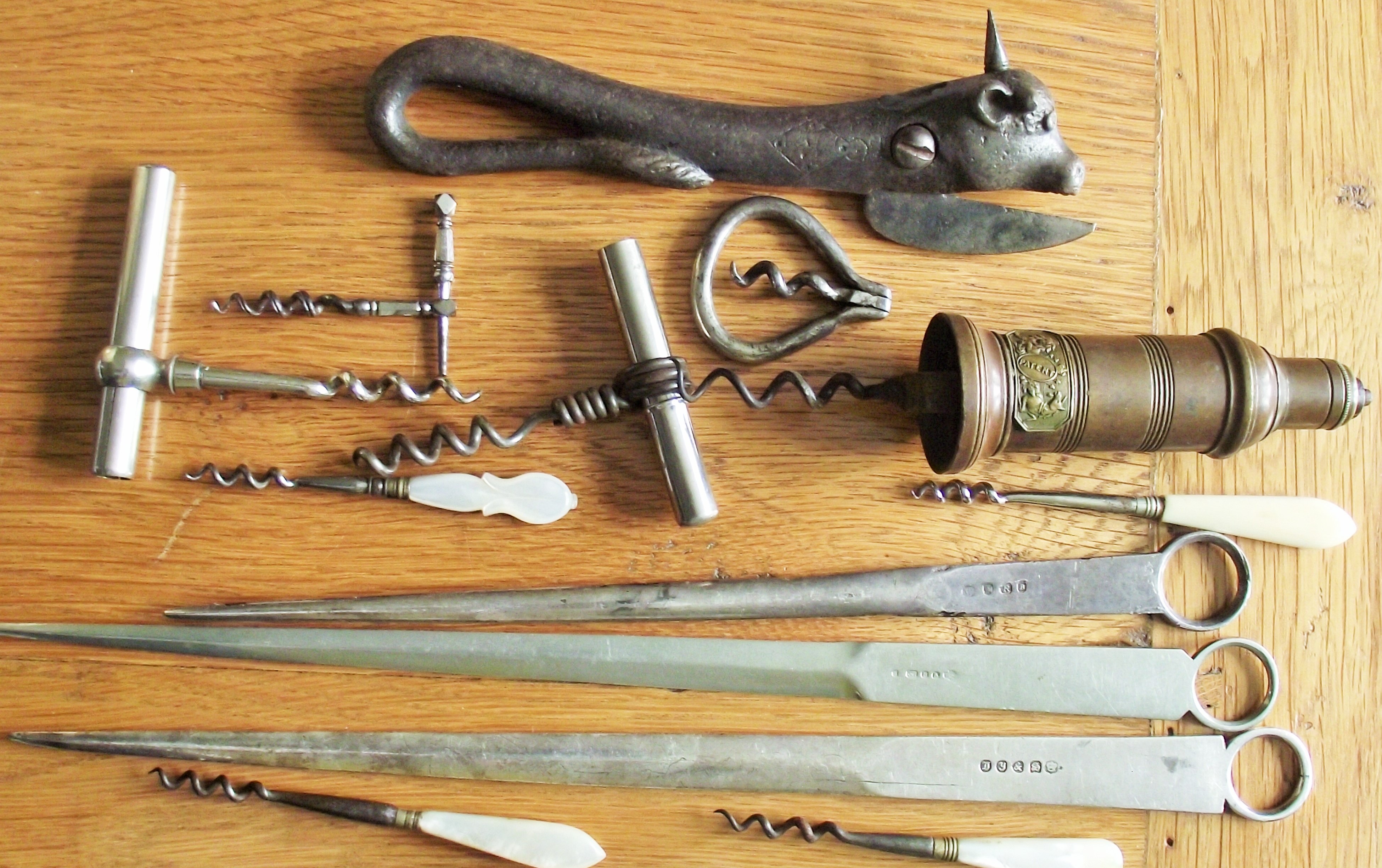 3 x19thc Antique plated meat skewers by various makers + vintage cast iron bulls head can opener + small collection of assorted cork screws
