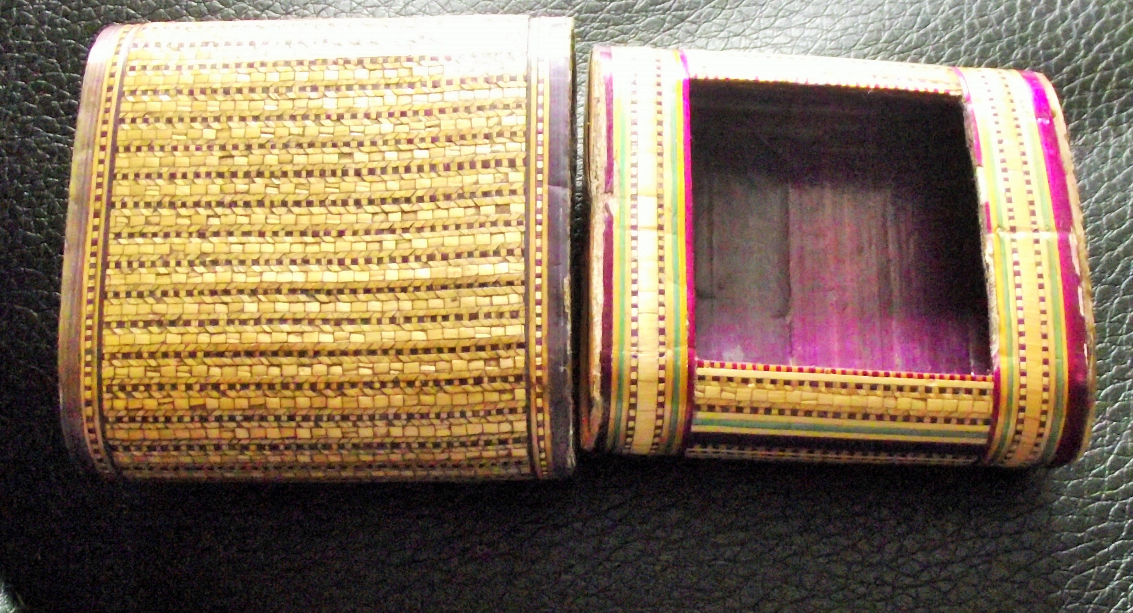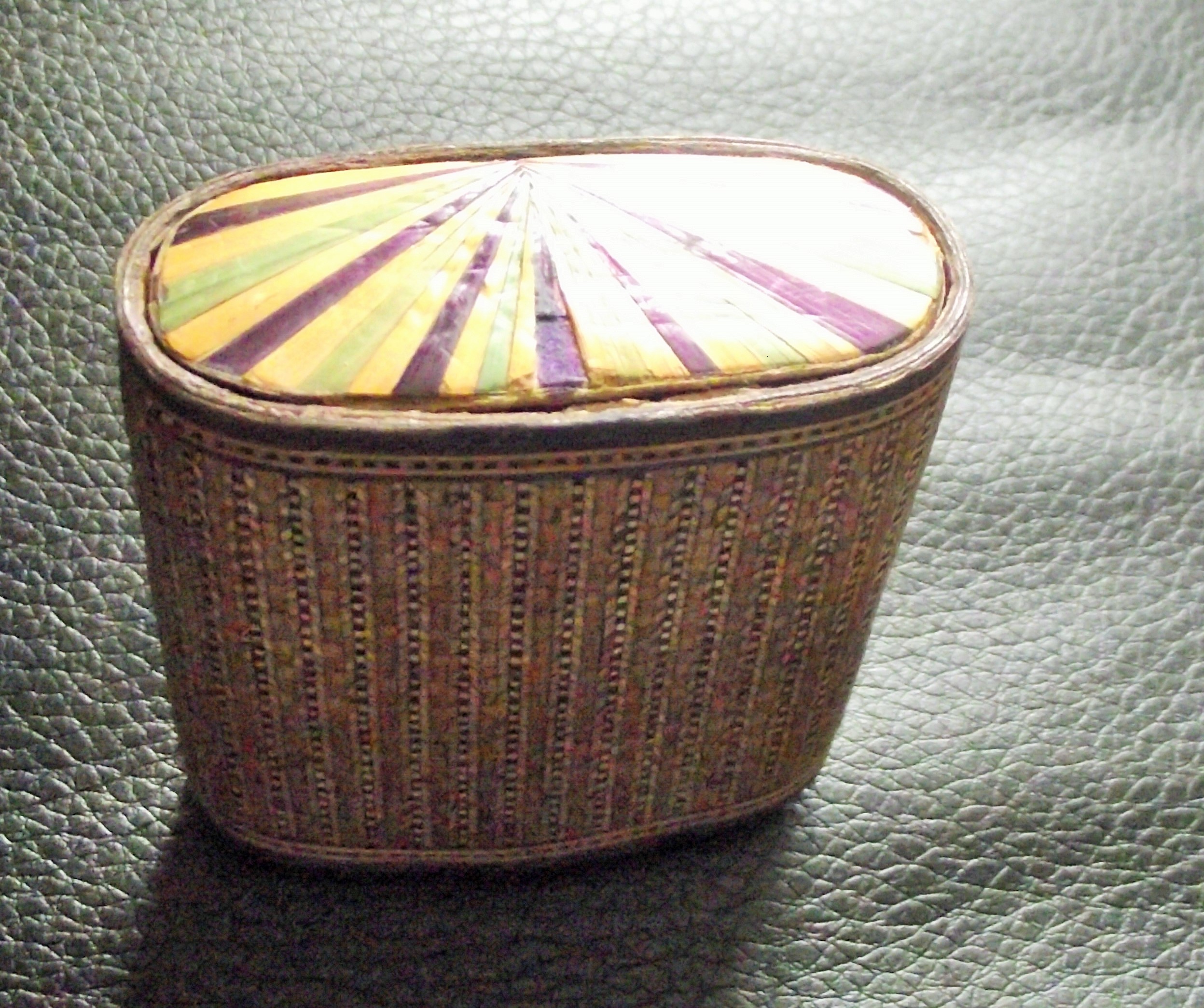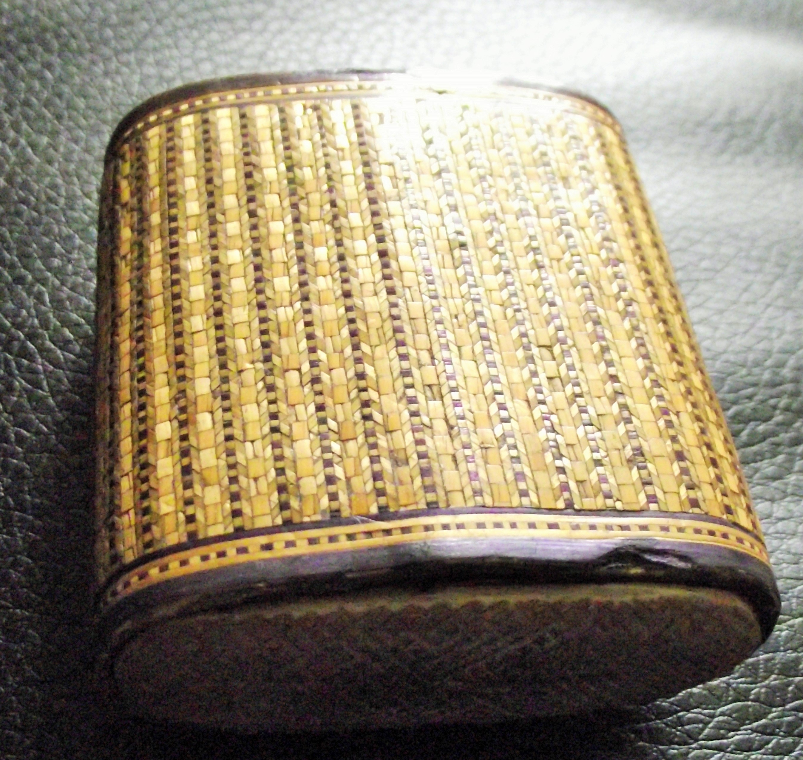 Rare Antique straw work match safe with bone striker to base intricately designed and painted separate strands of straw 5x5cm approx
