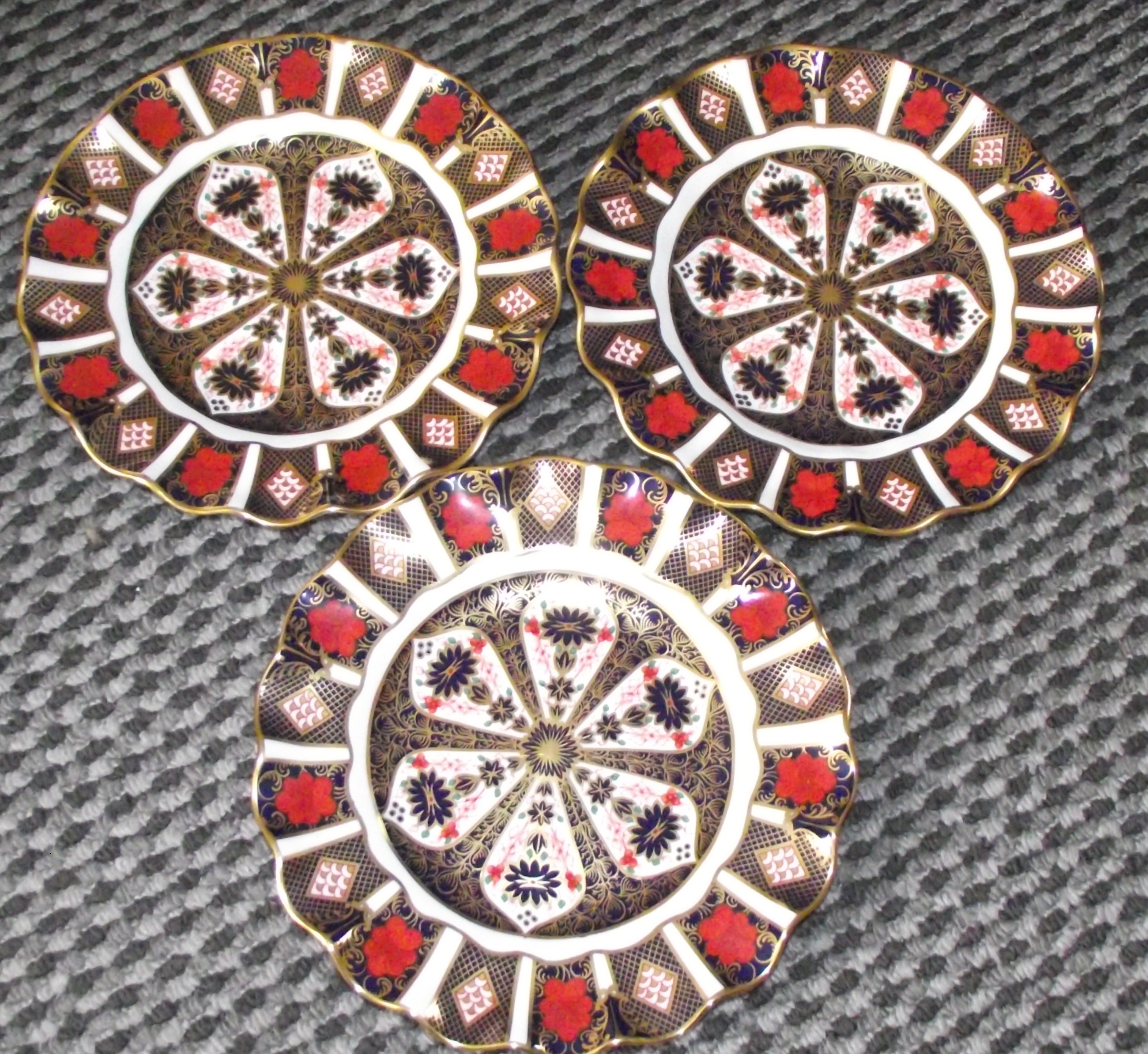 A set of three Royal Crown Derby 1128 pattern wavy edge plates 8.5″ 1st quality ( no scatched out marks to backs