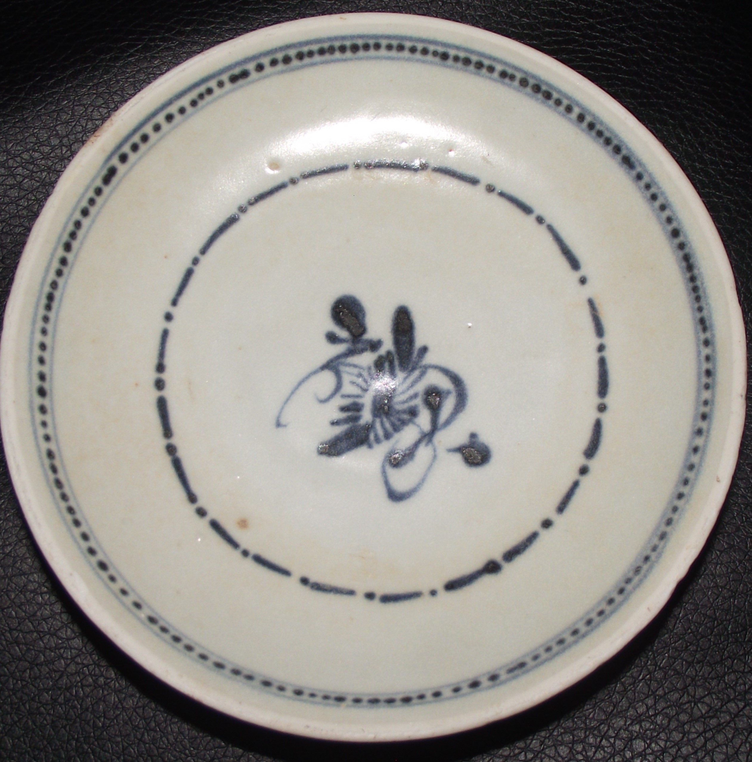 19thc chinese blue & white small porcelain dish 11.5cm decorated simply with small spray of flowers to the centre , recovered from the wreck of the Tek Sing which sunk in 1822