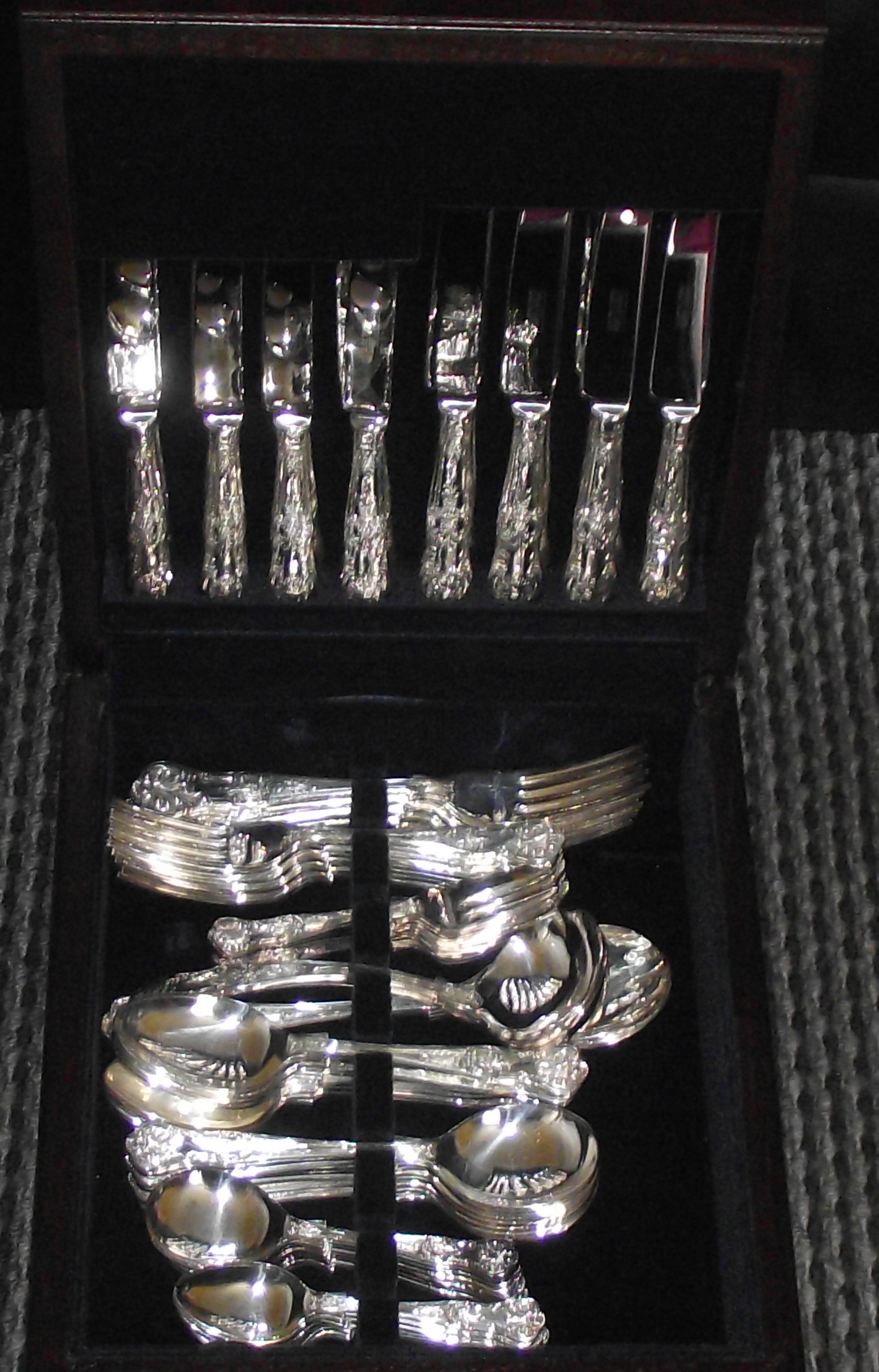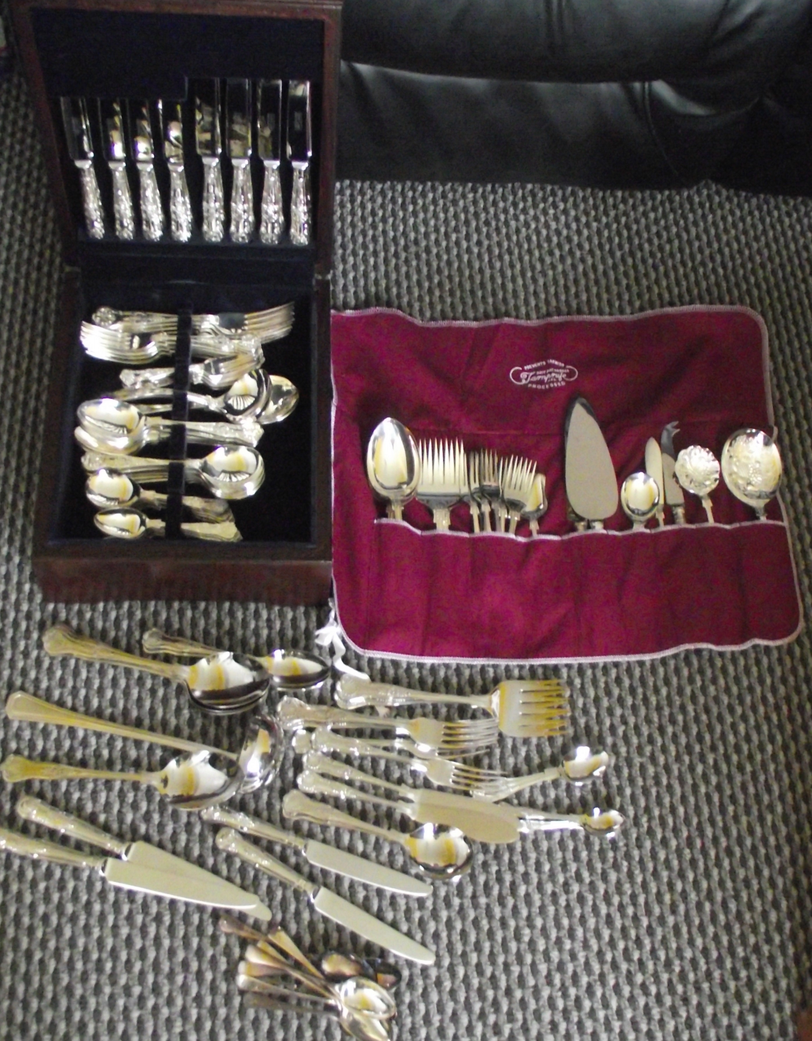 84 piece Queens pattern EPNS A1 plated United Cutlers Sheffield cased cutlery set + 25 separate pieces same pattern slotted into roll + 25 loose kings pattern & others