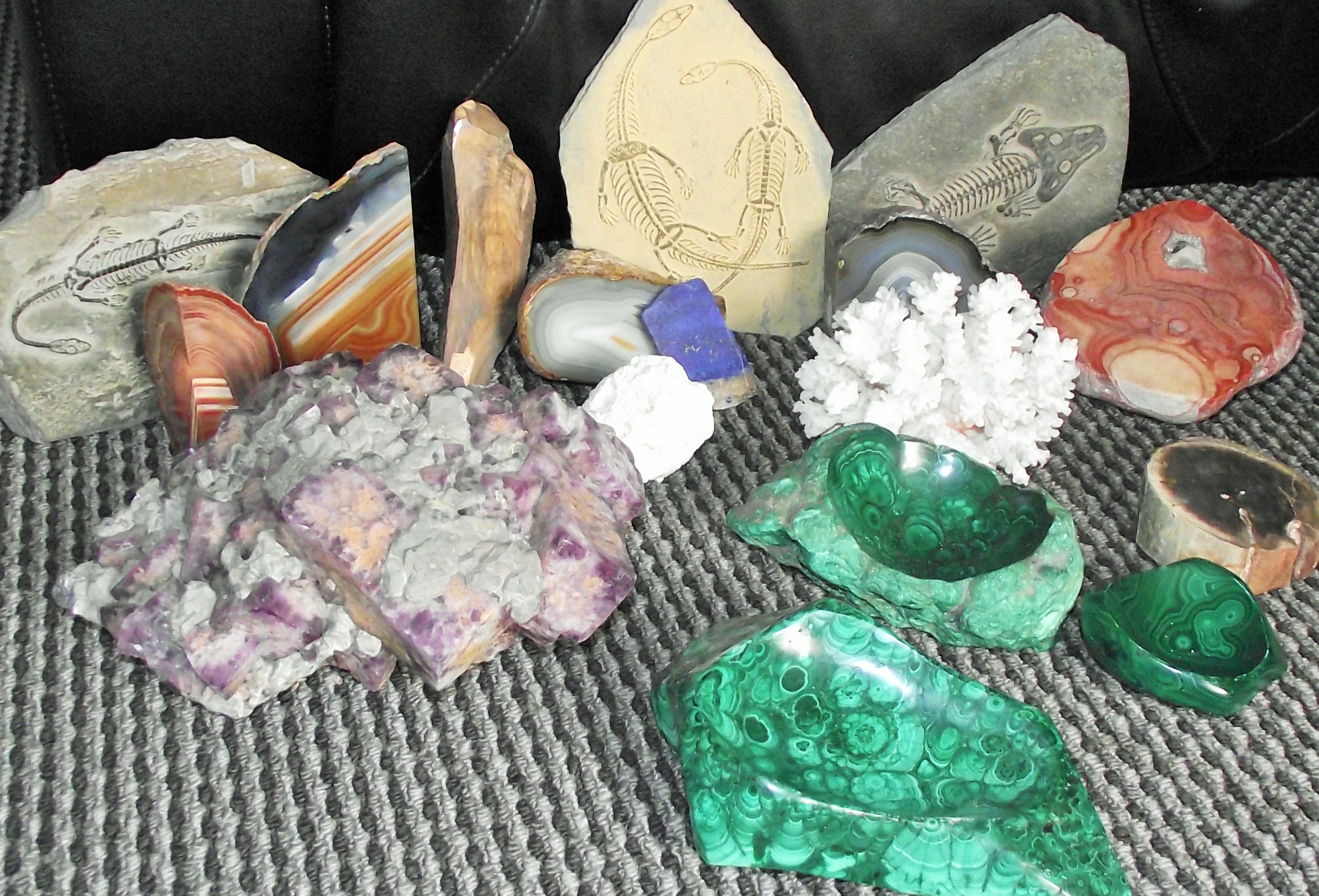 Selection of assorted polished stones showing geological structure including 2 pieces of petrified wood, 2 coral , and slice of Lapis Lazoli , also several pieces of Vintage Carved Stone Malachite Rock formed as bowls & Ashtray + 3 reproductions of fossilized skeletal remains of juvenile dinosaurs + large unworked quartz crystal stone