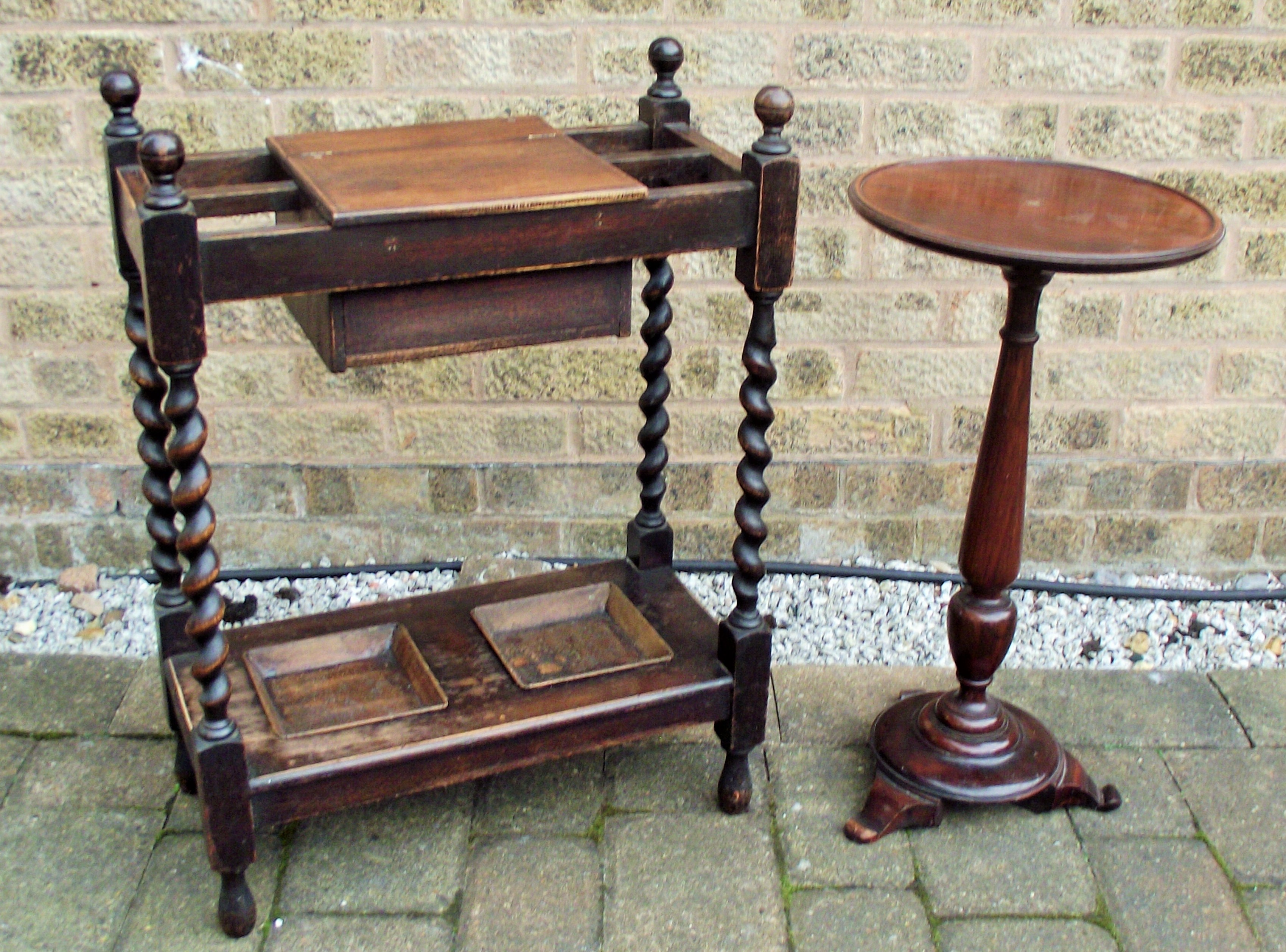 Small hall sized barley twist stick stand with drip trays + Small 1930s mahogany wine table