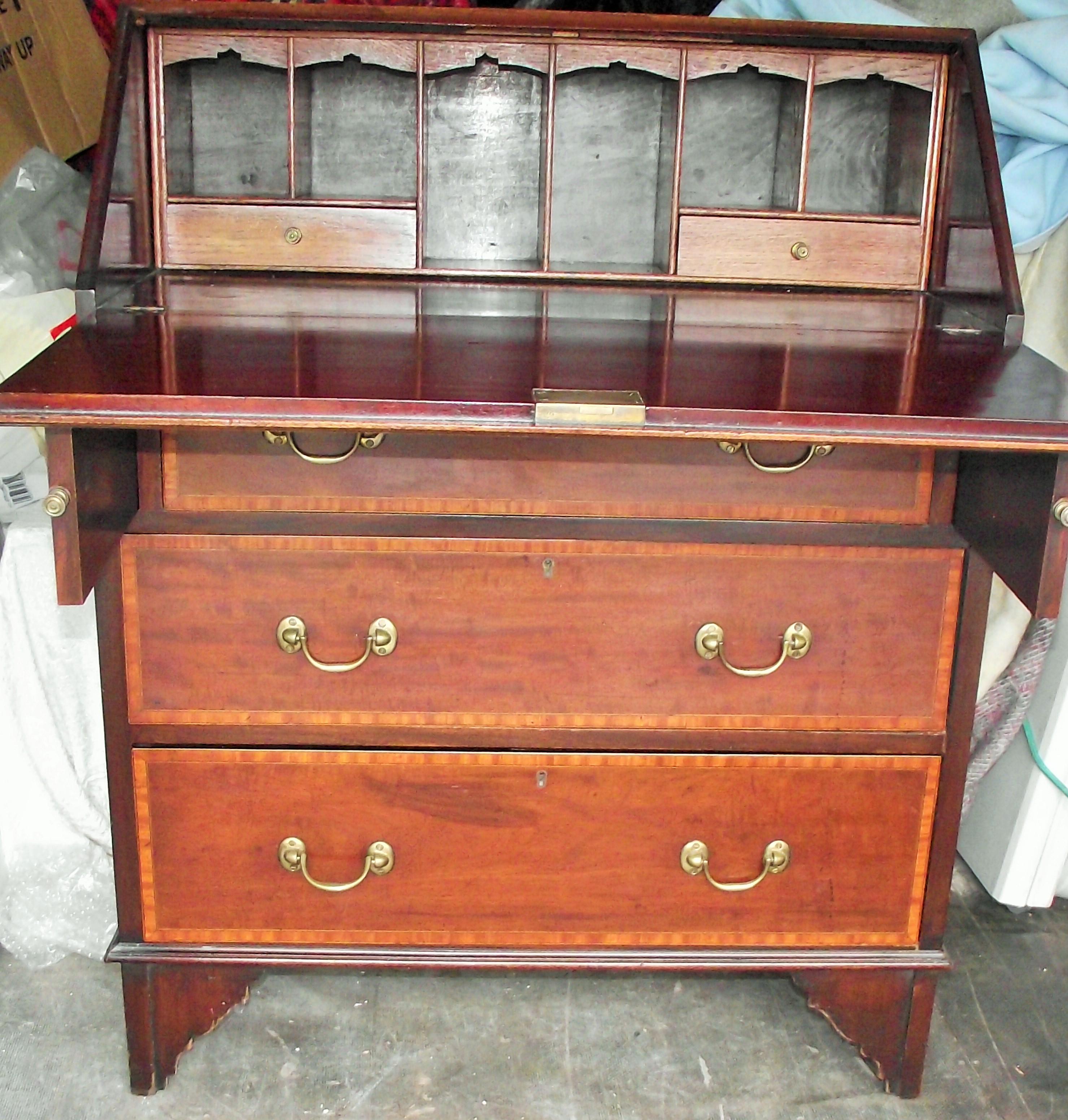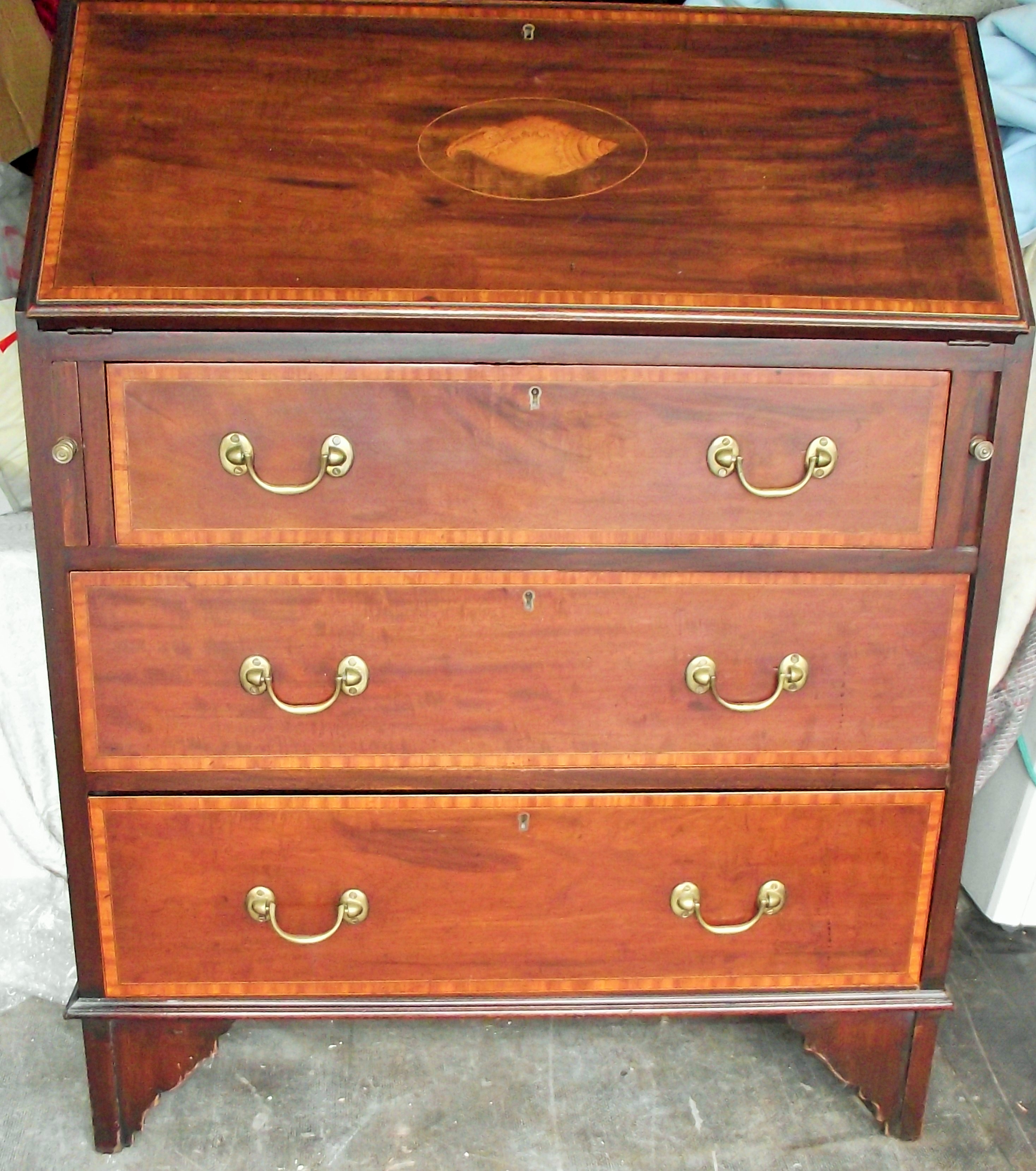 Quality Edwardian 3 draw bureau with shell motif and crossbanding