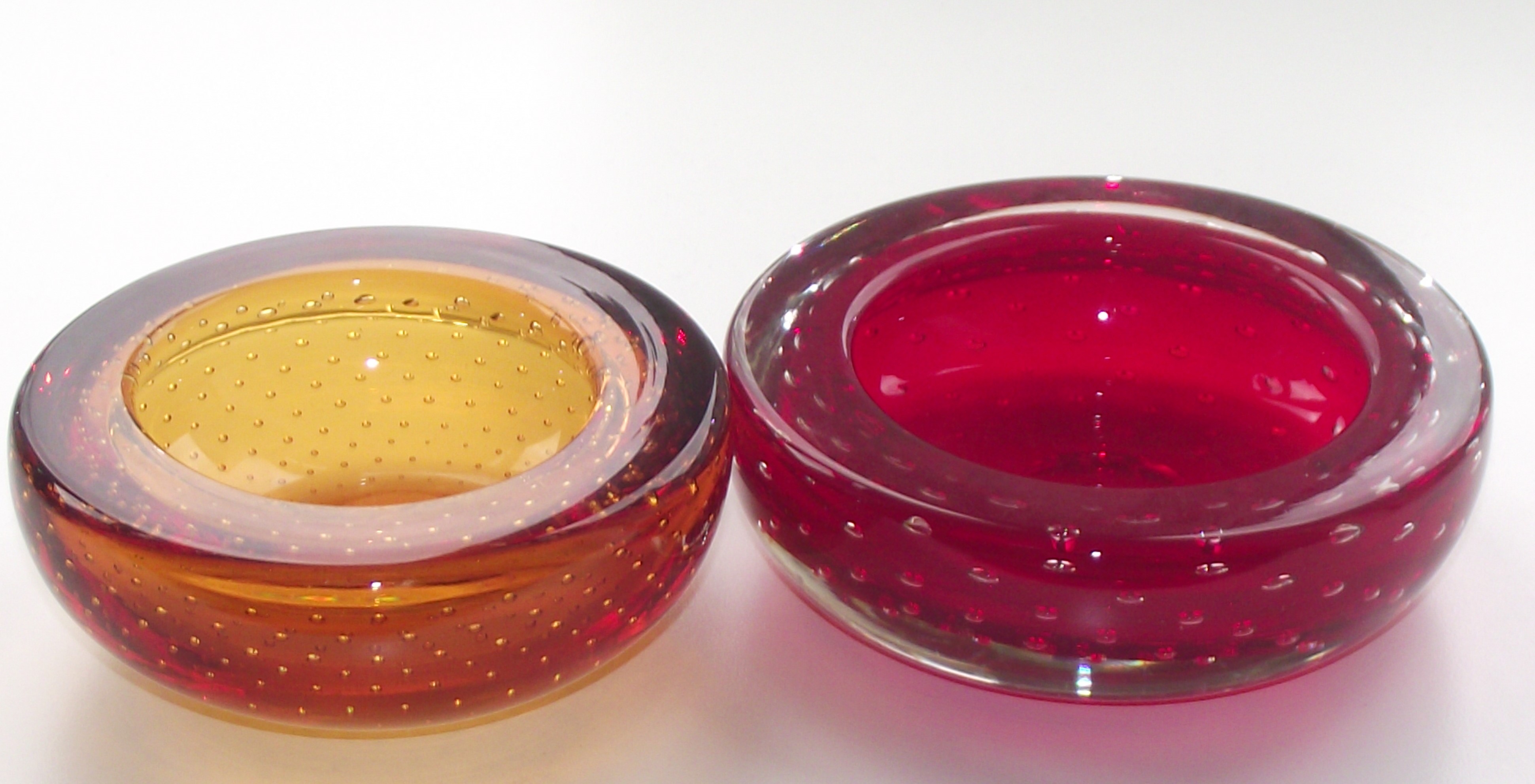Whitefriars Golden Amber controlled Bubble Bowl 40x110mm approx+ Whitefriars Ruby Red Controlled Bubble Glass Bowl 1960s 40x125mm approx