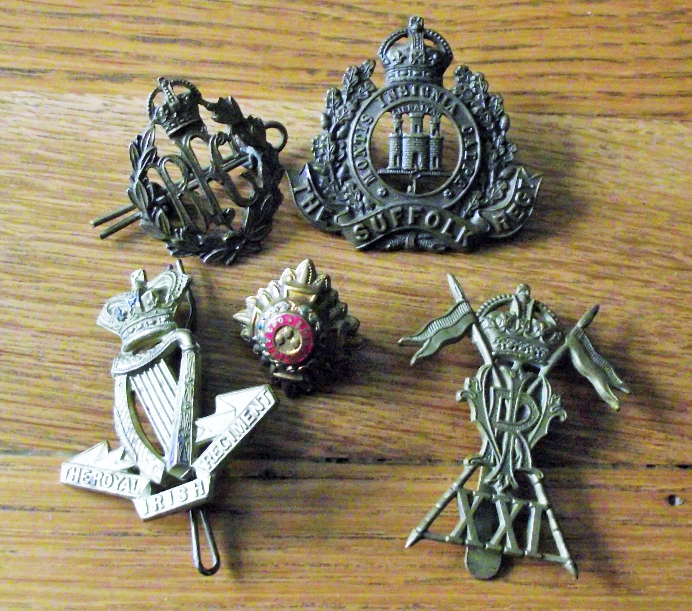 Royal Irish Regiment Cap Badge with 2 lugs & pin + Tria Juncta In Uno Badge with 2 brass lugs +The Suffolk Regiment Cap Badge Brass Metal with 2 lugs J R Gaunt London+ Royal Flying Corps Cap Badge with 2 brass lugs + 21st Lancers Cavalry Cap Badge XXI Lancers Brass Slider