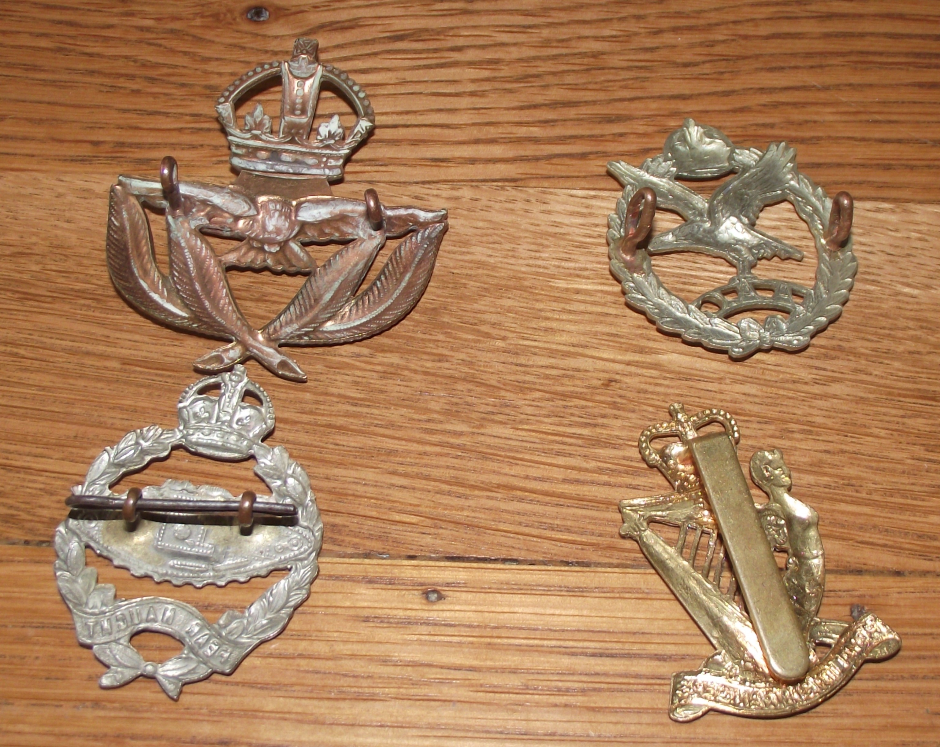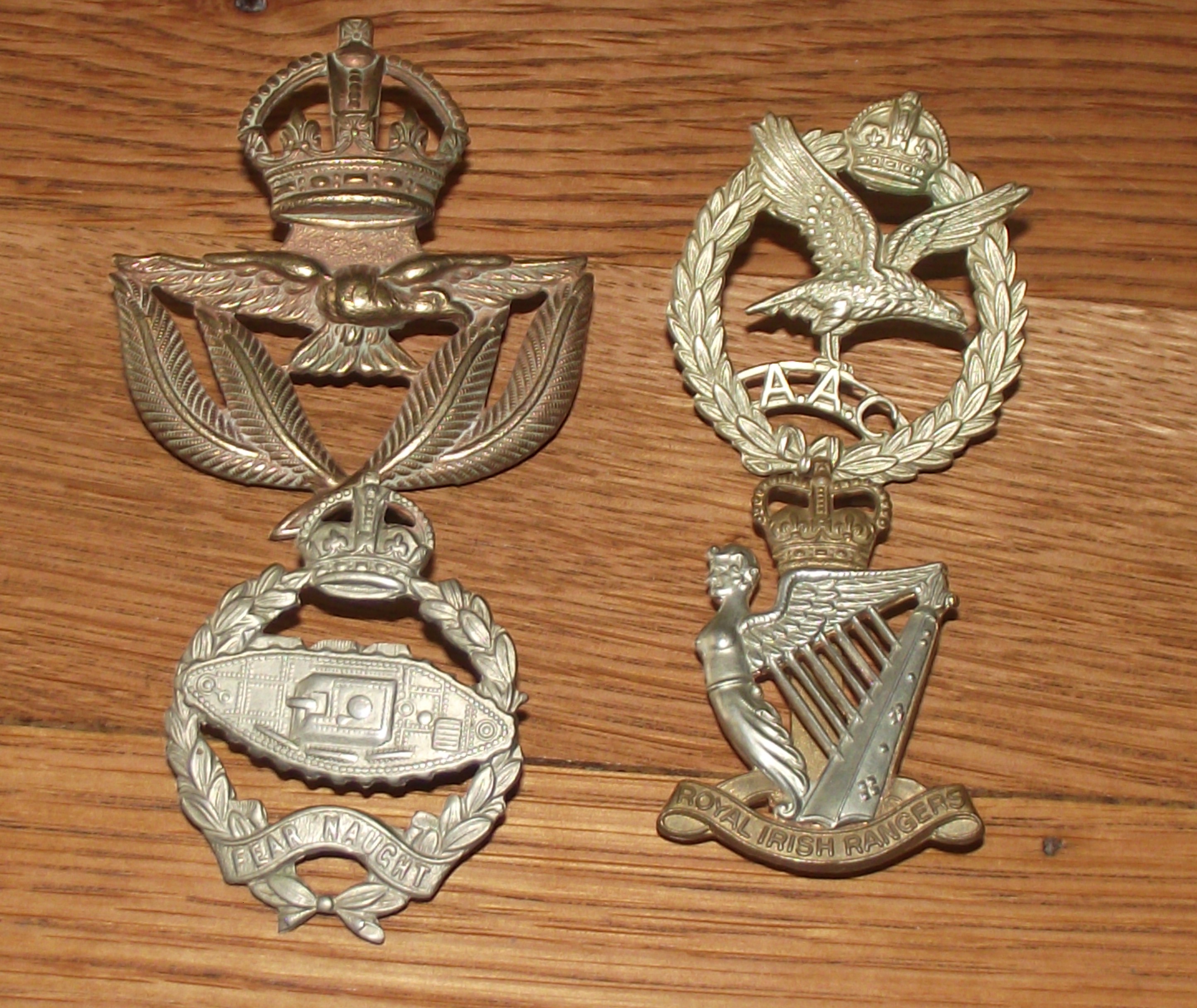 Gilt metal WW11 Royal airforce service cap badge with 2 brass lugs to back + AAC ( Army air corps cap badge with 2 brass lugs on back + Royal Irish ranger bi metal cap badge brass slider to back + Royal Tanks Corps hat badge with with 2 brass lugs on back