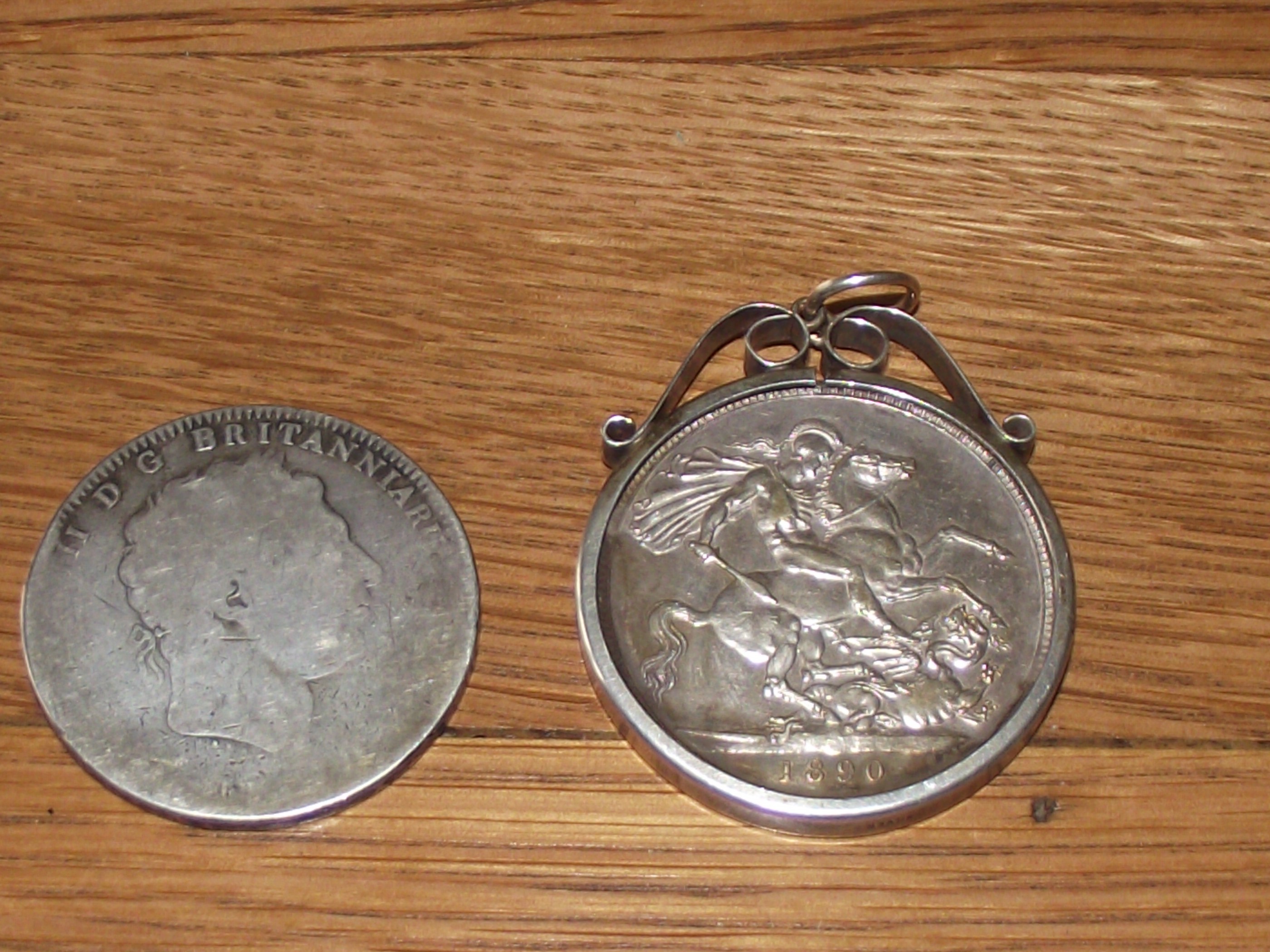 George 111 silver crown ( date rubbed ) + 1890 Victoria silver crown in silver holder 63.9g approx