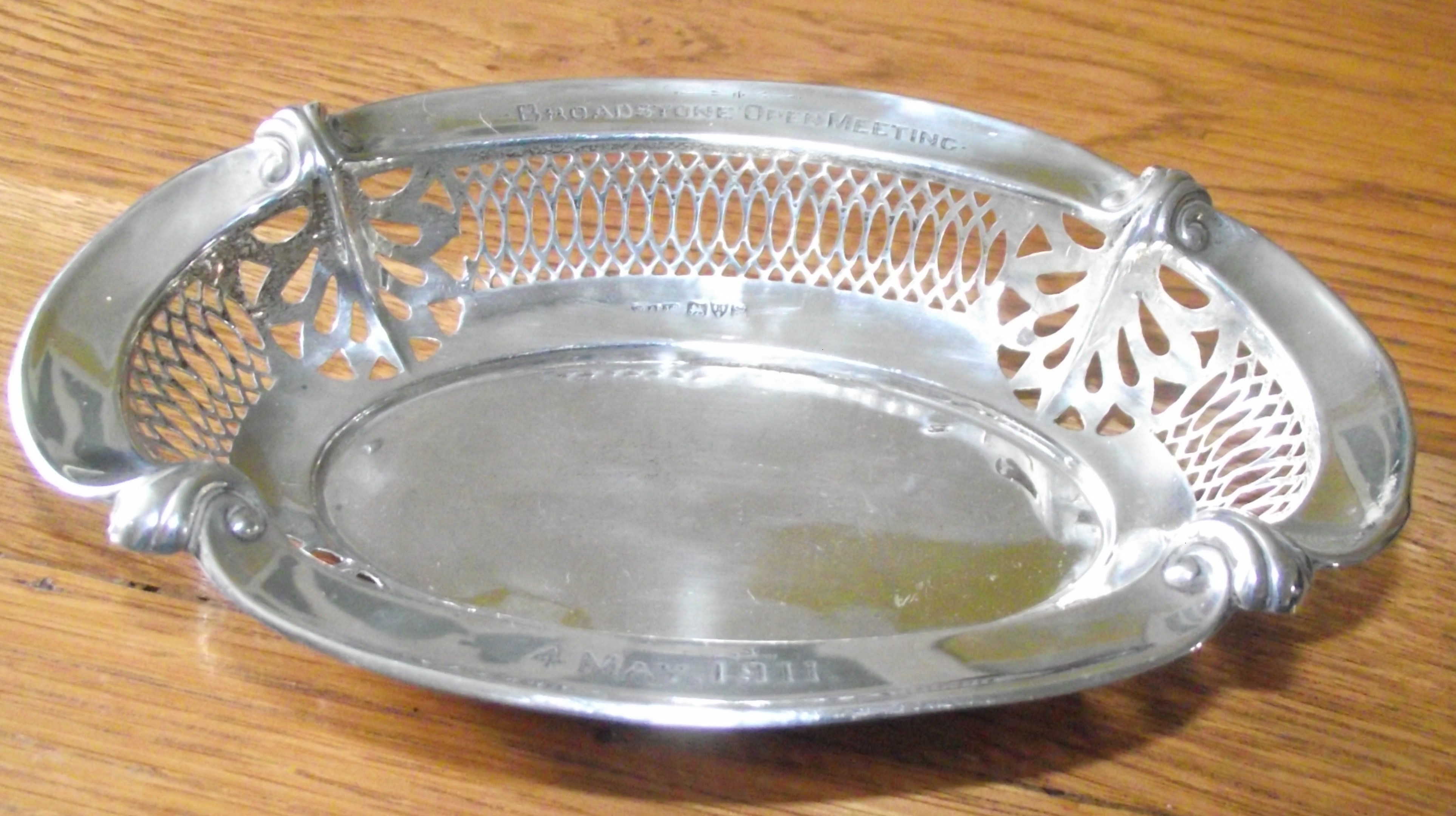 Small silver sweetmeat dish Chester 1908 with pierced sides and scrolls to top edge, presented to Broadstone open meeting may 1911 47.2G APPROX