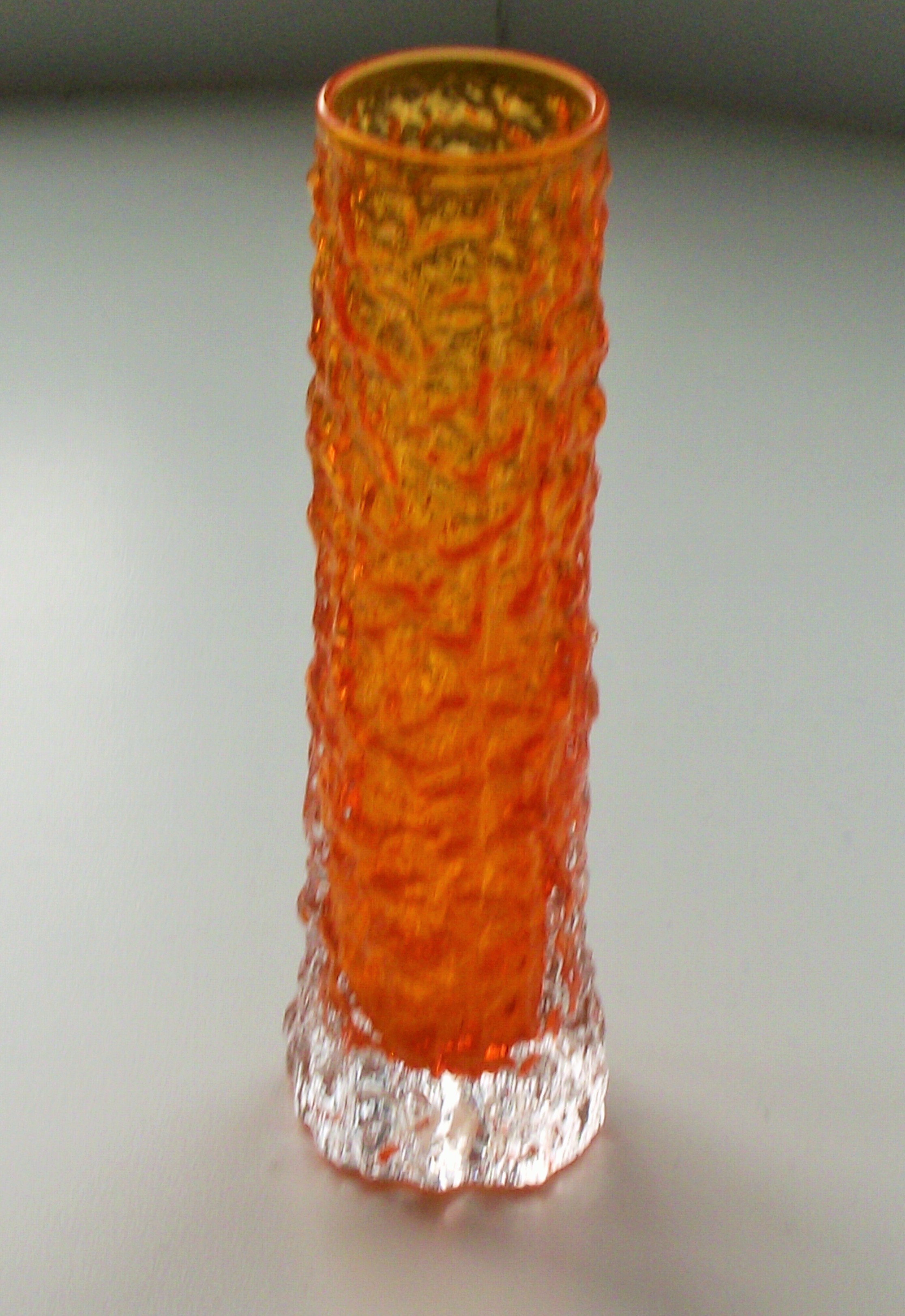 Whitfriars Tango orange bark pattern finger vase, by Geoffrey Baxter. 15cm tall