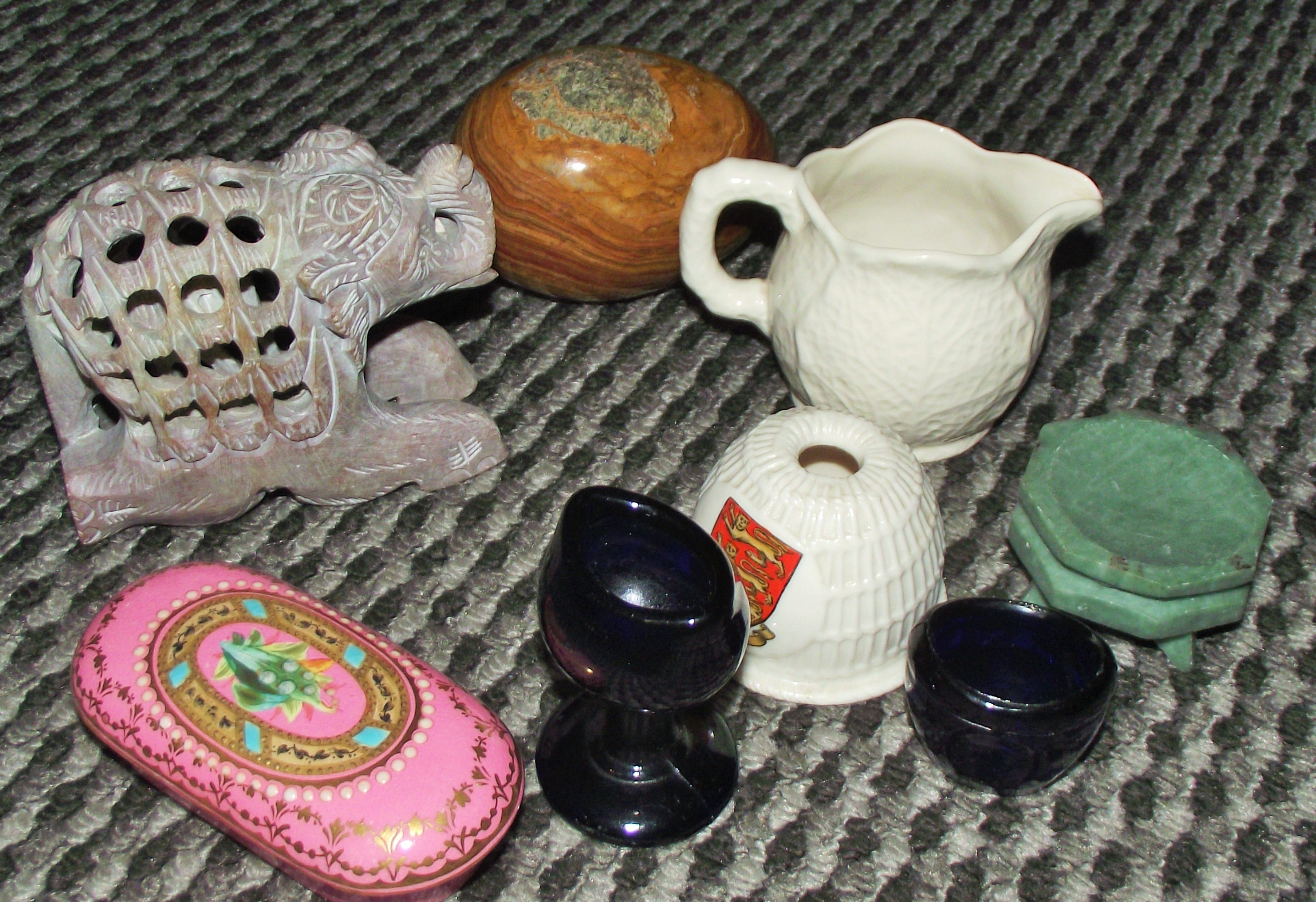 Mixed lot inc, soapstone elephant , hexagonal soapstone stand , Pink enamel painted covered porcelain box Whisky connoisseur white leaf moulded water jug , 2 vintage blue glass eye washers, large hardstone egg paperweight ,vintage Goss taper holder lobster trap Jersey
