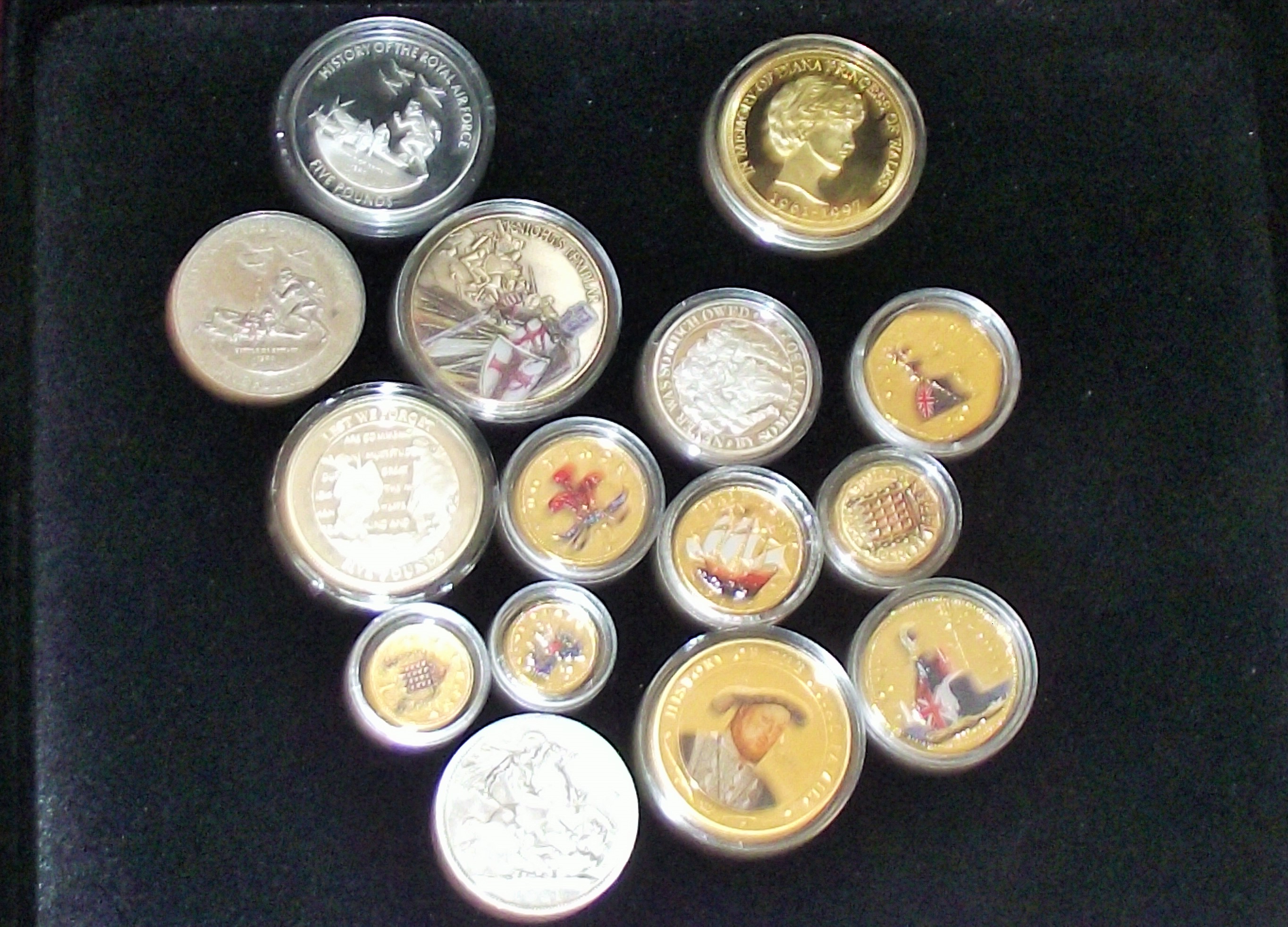 Collection of various coins inc commemerative , £5 coins , old british currency plated & enameled , Knights templar coin 1951 five shilling etc