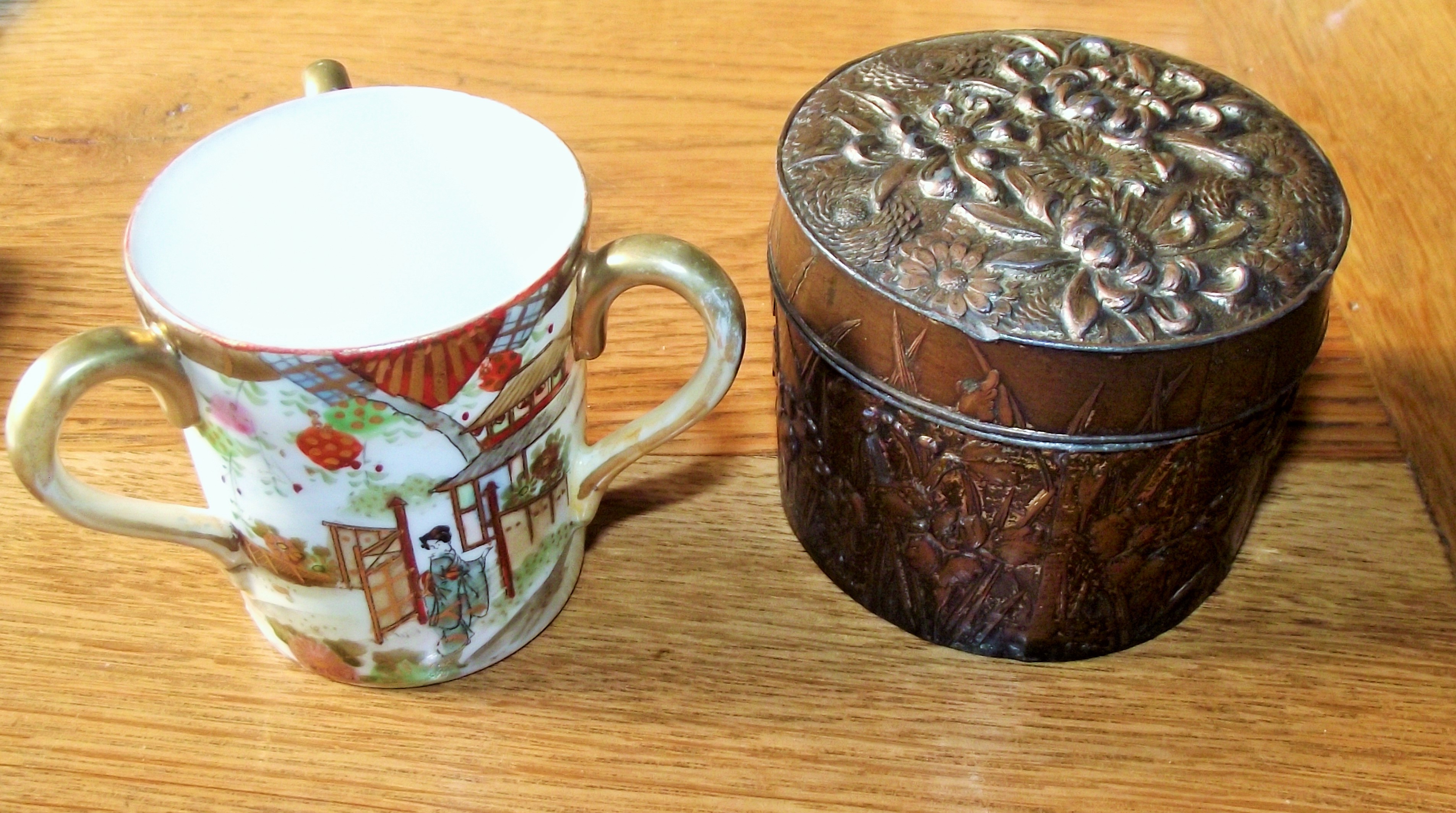 Rare miniature TYG ( 3 handle mug ) with Japanese transfer & hand painted design + Small circular Japanese lidded box copper on base metal embossed chrysathemum flower heades to lid and flowers & reads to side