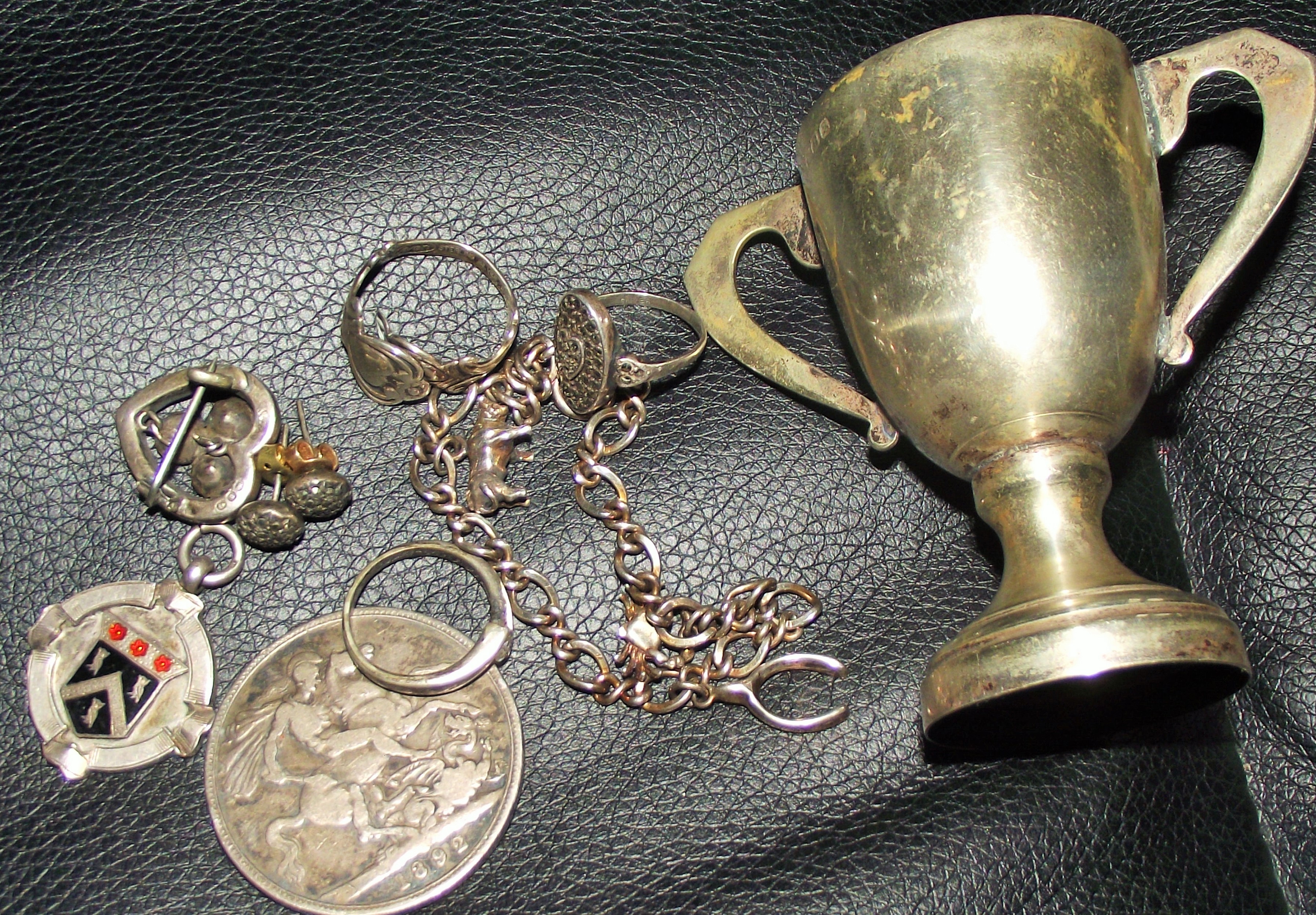 Small silver trophy + silver rings , badge brooch + small silver charm bracelet +Victoria silver 1892 crown 101g approx