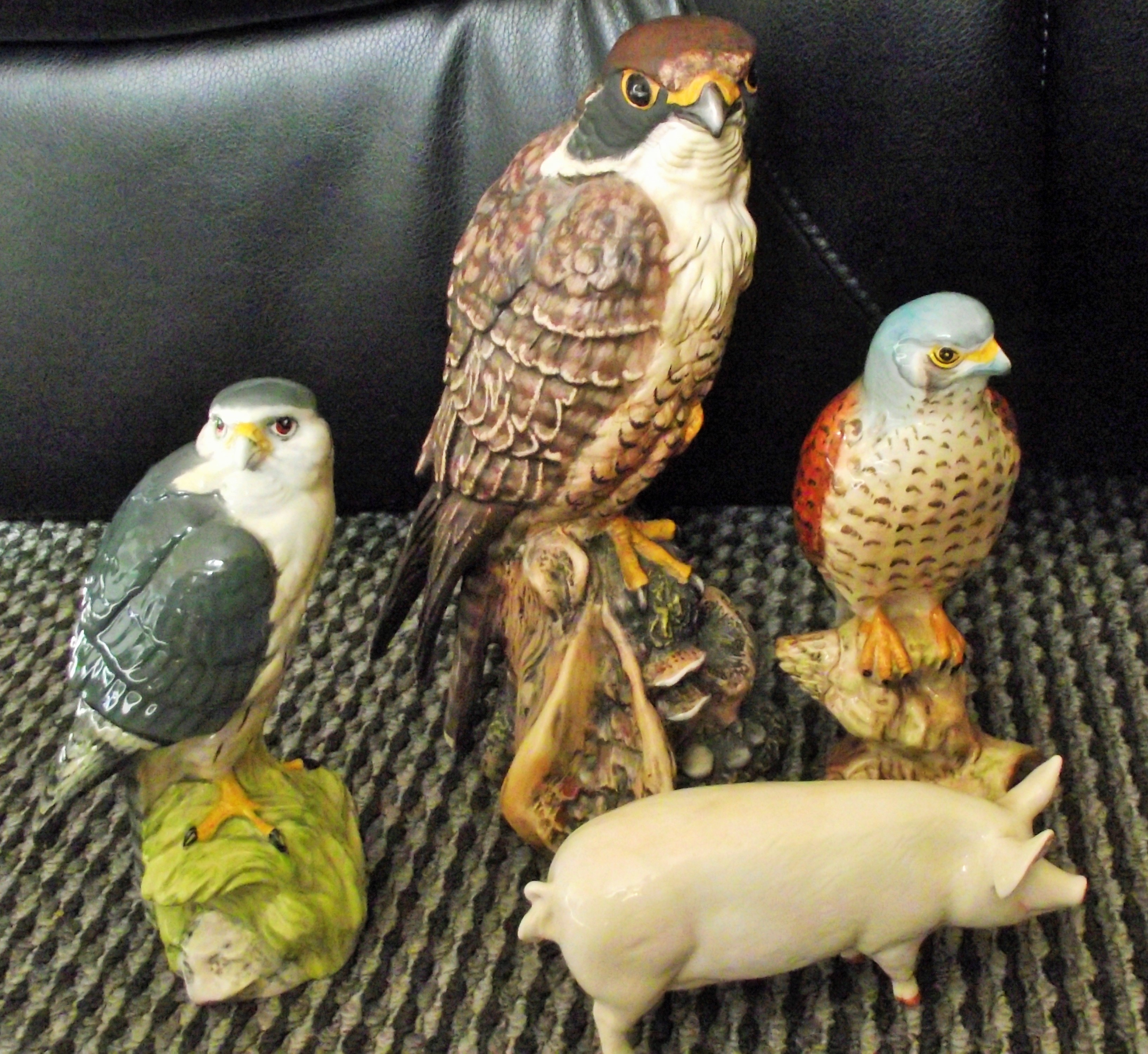 Royal Doulton peregrine falcon Hn 3451+ Beswick bird of prey + Vintage John Beswick ‘Wall Queen 40’ Porcelain Pig +Royal doulton Merlin Scotch Whisky glasgow model