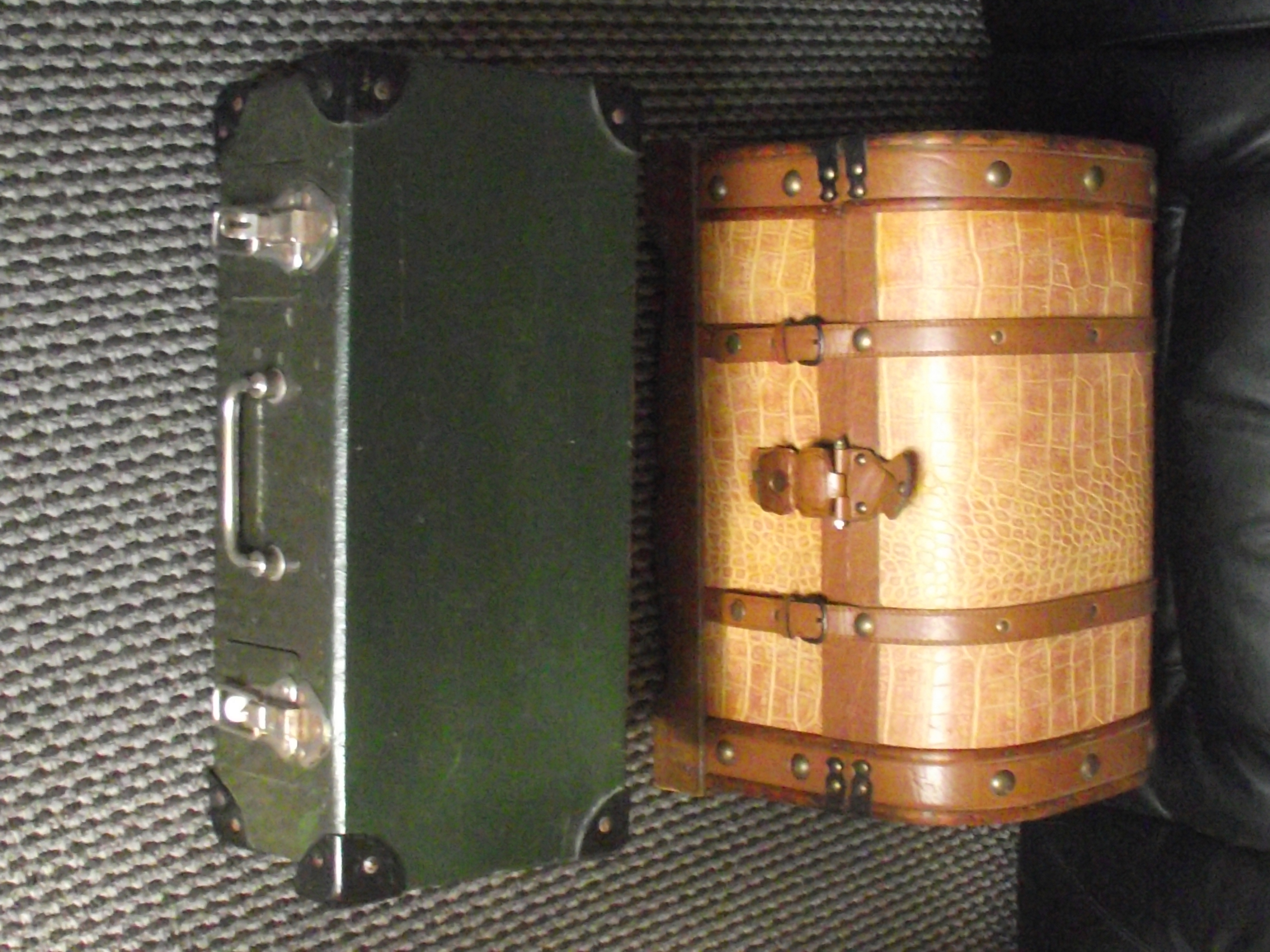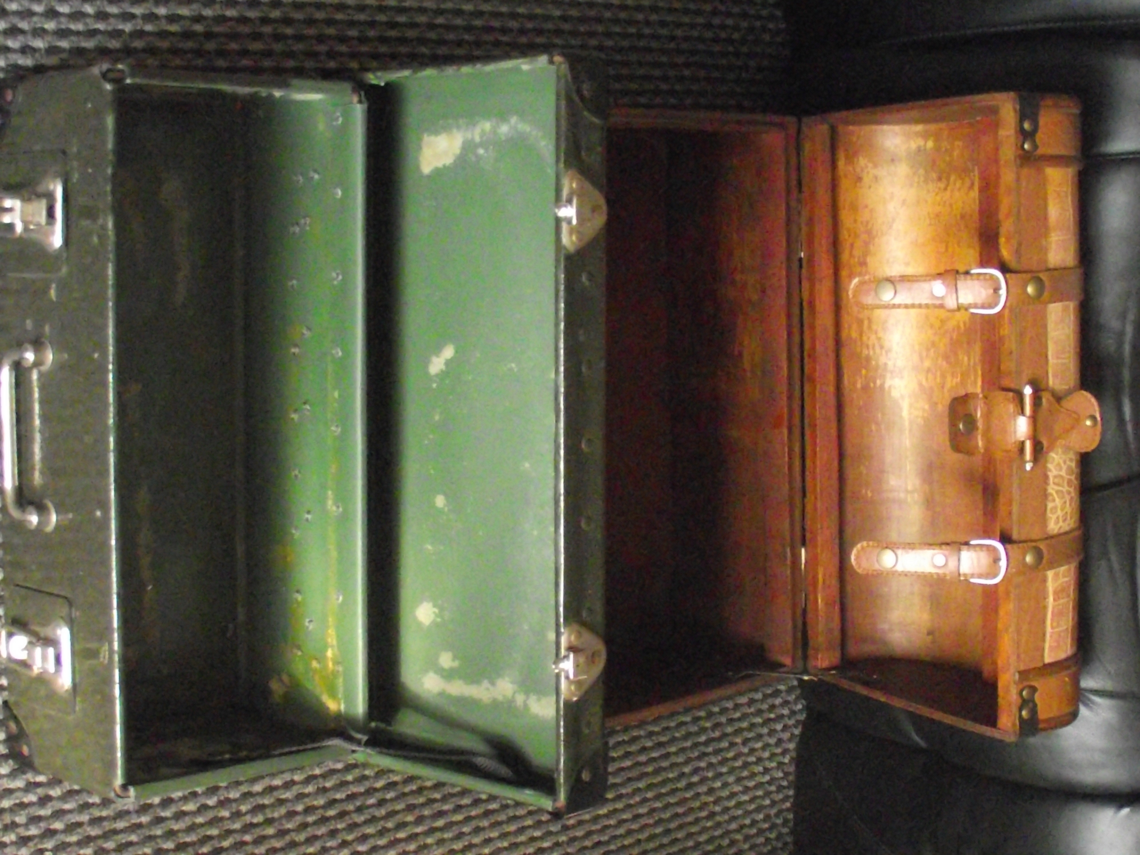 Small wooden & leather chest 18x9x10″approx + green army surplus case 18x9x6″ approx