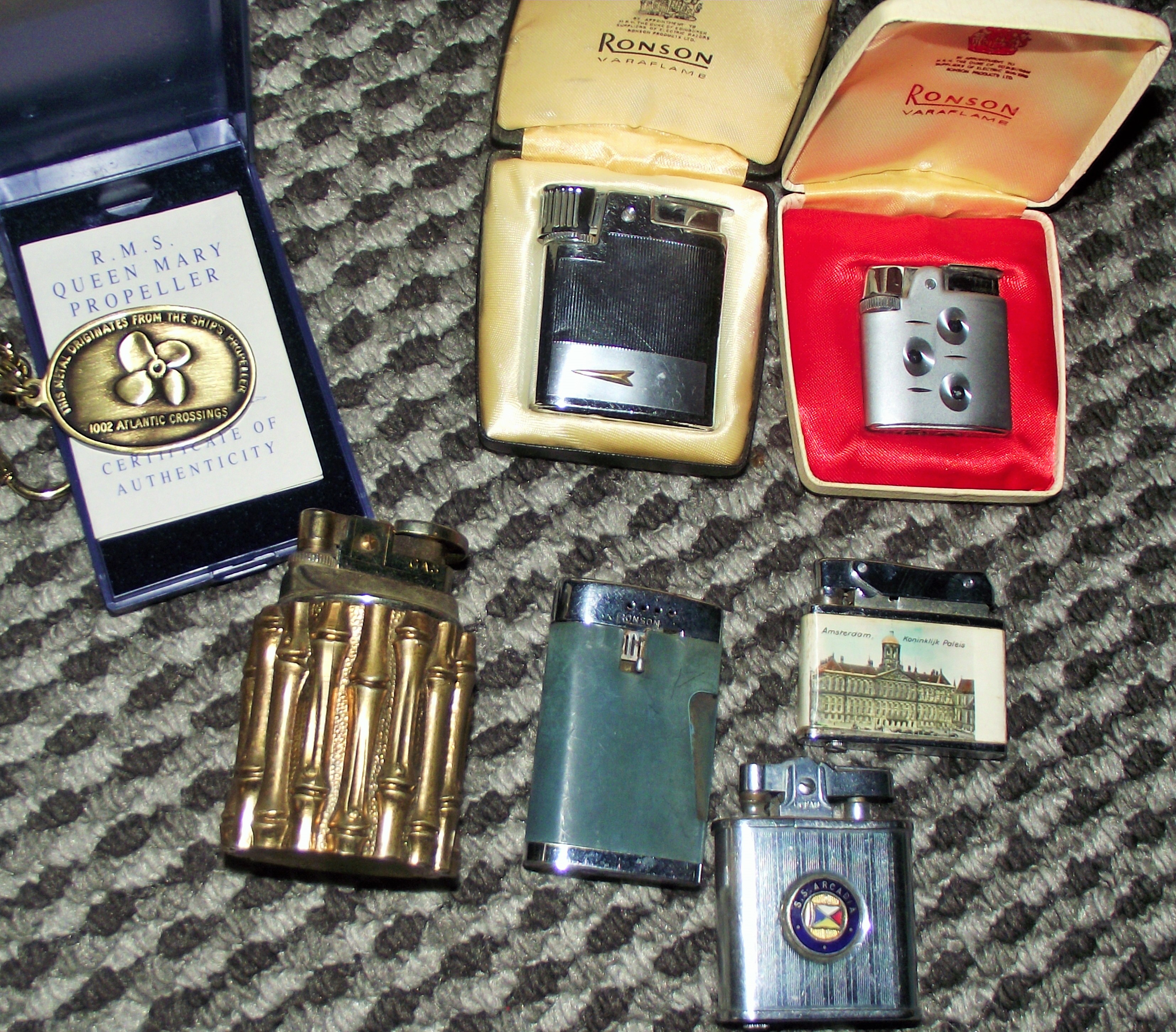 Collection of assorted lighters including Ronsons ,+ Vintage table lighter with bamboo finish + key fob made from RMS Queen Mary Propeller after her 1002 Atlantic crossing with certificate