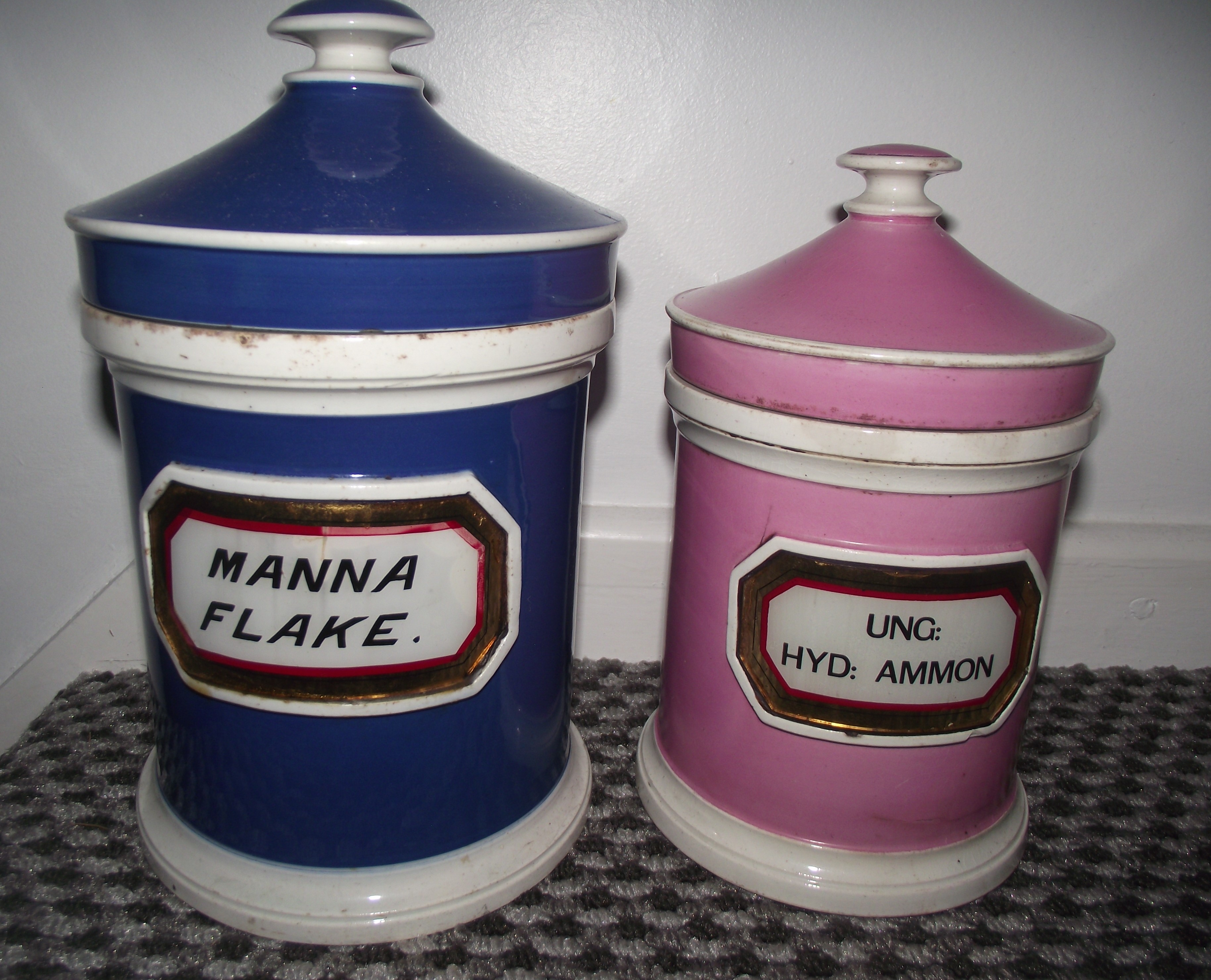 2 x Victorian Apothercary lidded jars 9″ approx