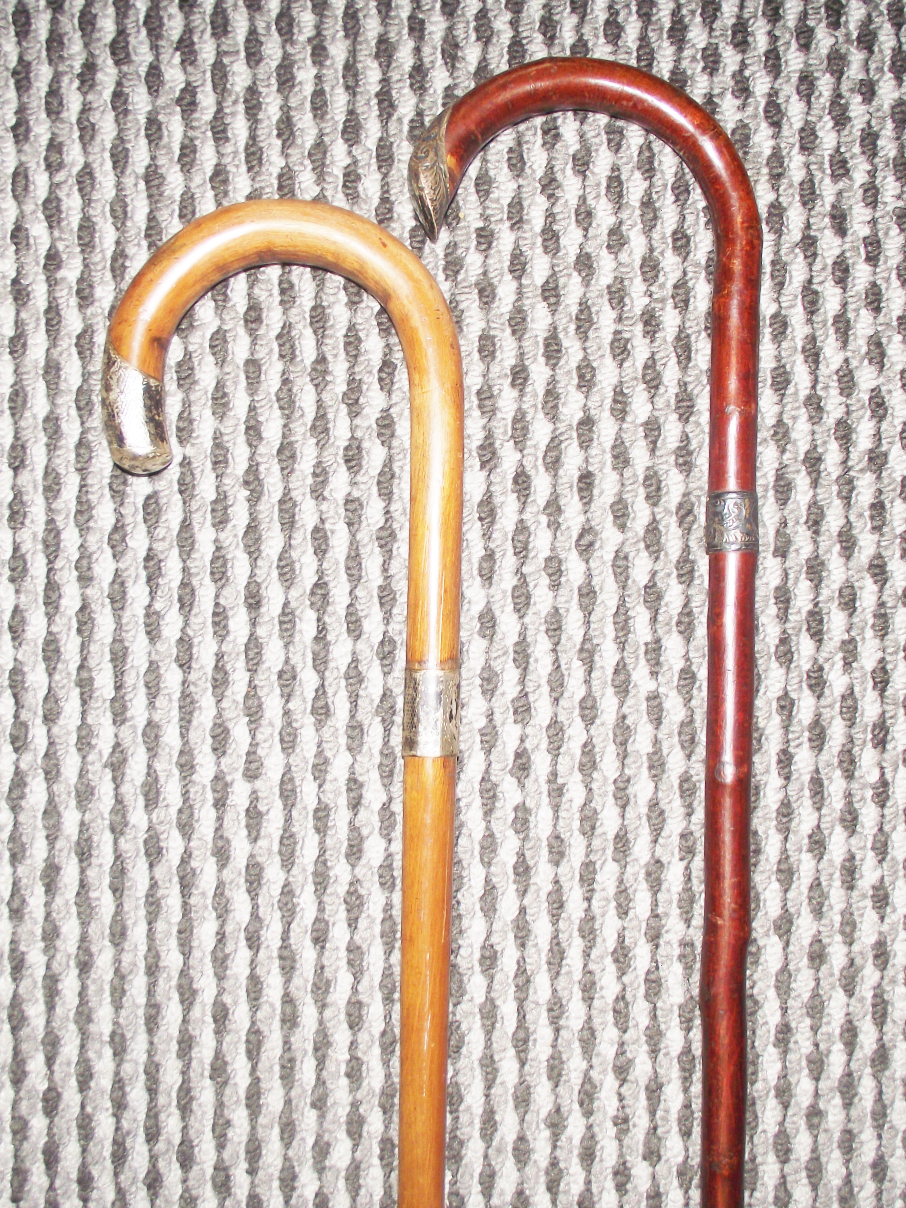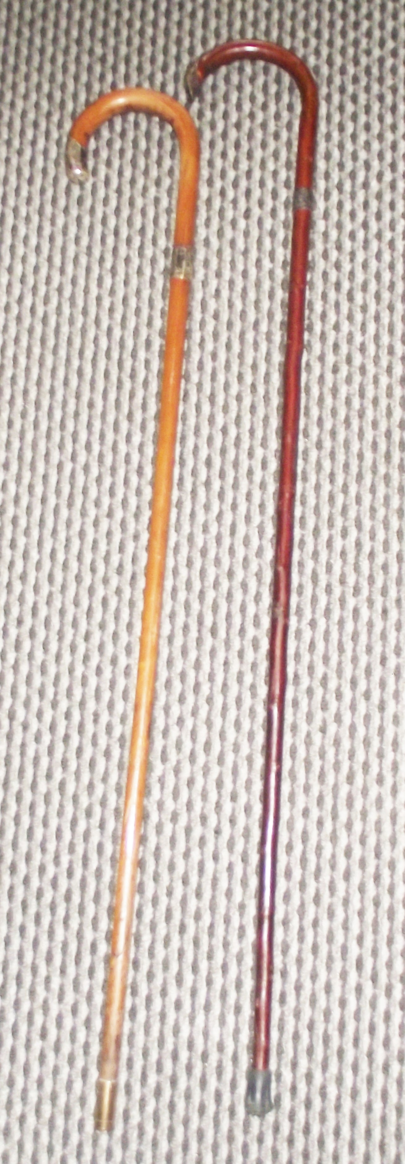 2 x silver banded and silver topped walking canes 1 marked birmingham 1906 the other marked silver K & Sl Kendall silver marked for London 1925 35″ approx