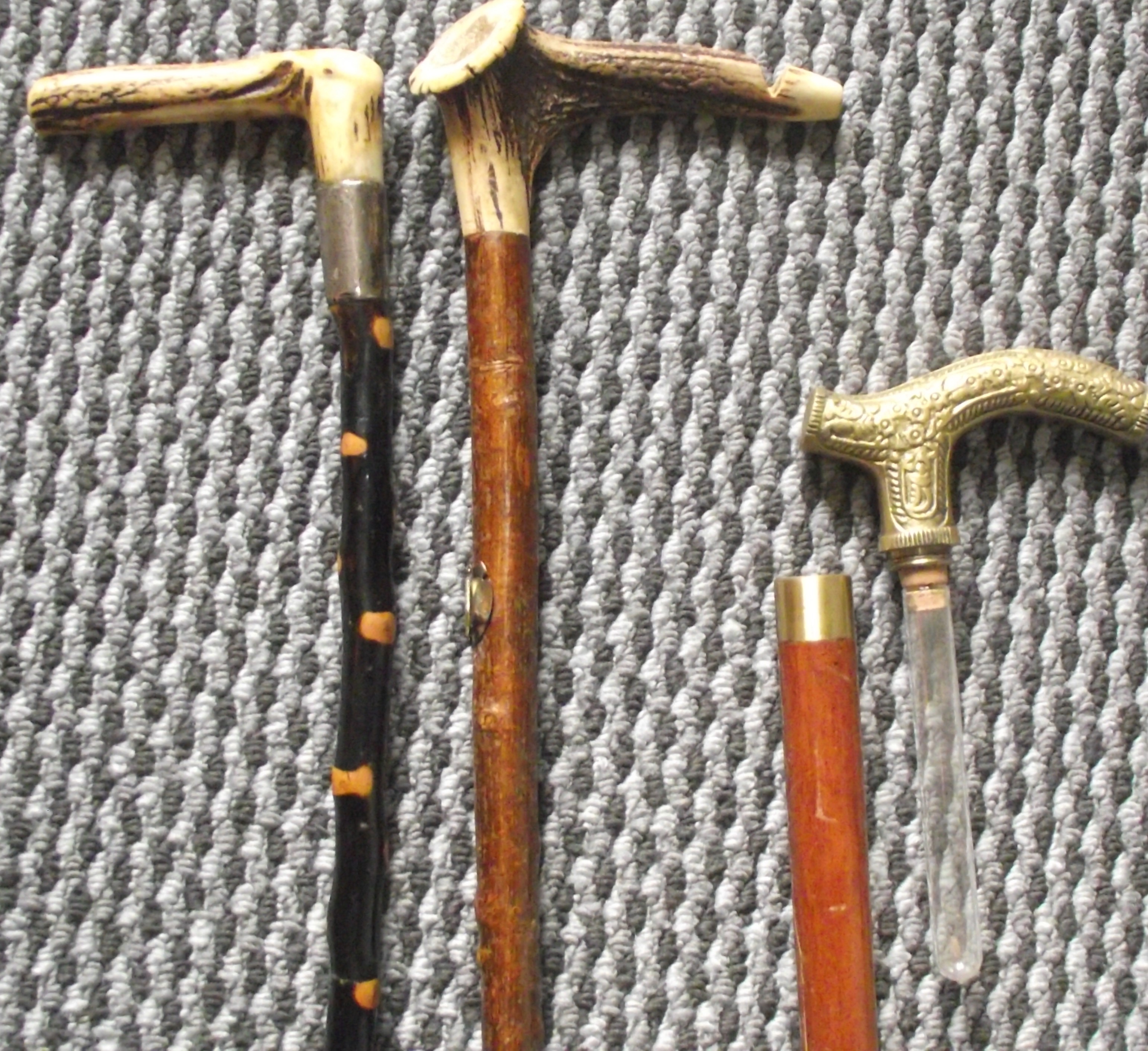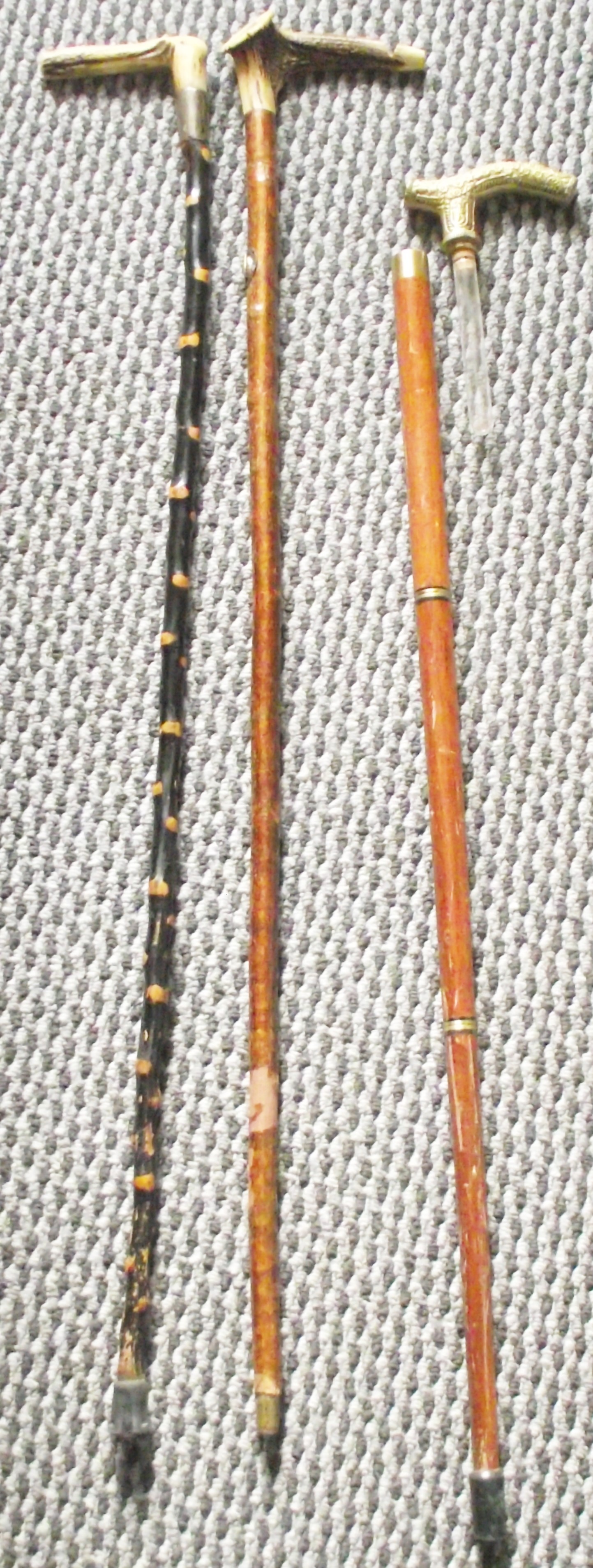 3x unusual walking sticks 35″ approx 1 with hidden test tube cork top drinking vessel , 1 blackthorn with silver plated engraved collar , 1 with horn top with built in whistle