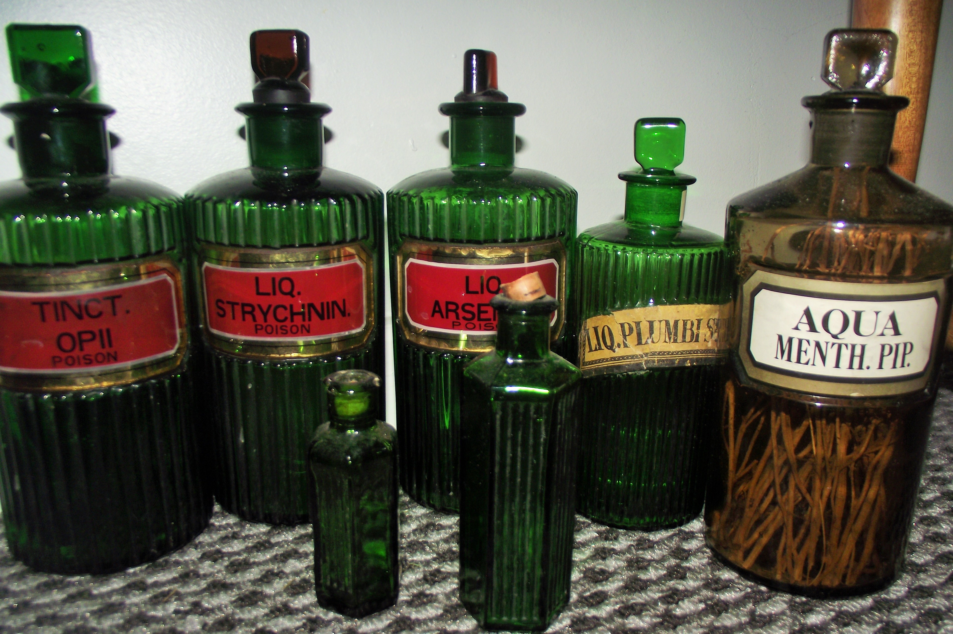collection of victorian green Apothercary bottles with labels 1 with paper label 8″ approx + brown Apothercary bottle & smaller bottles