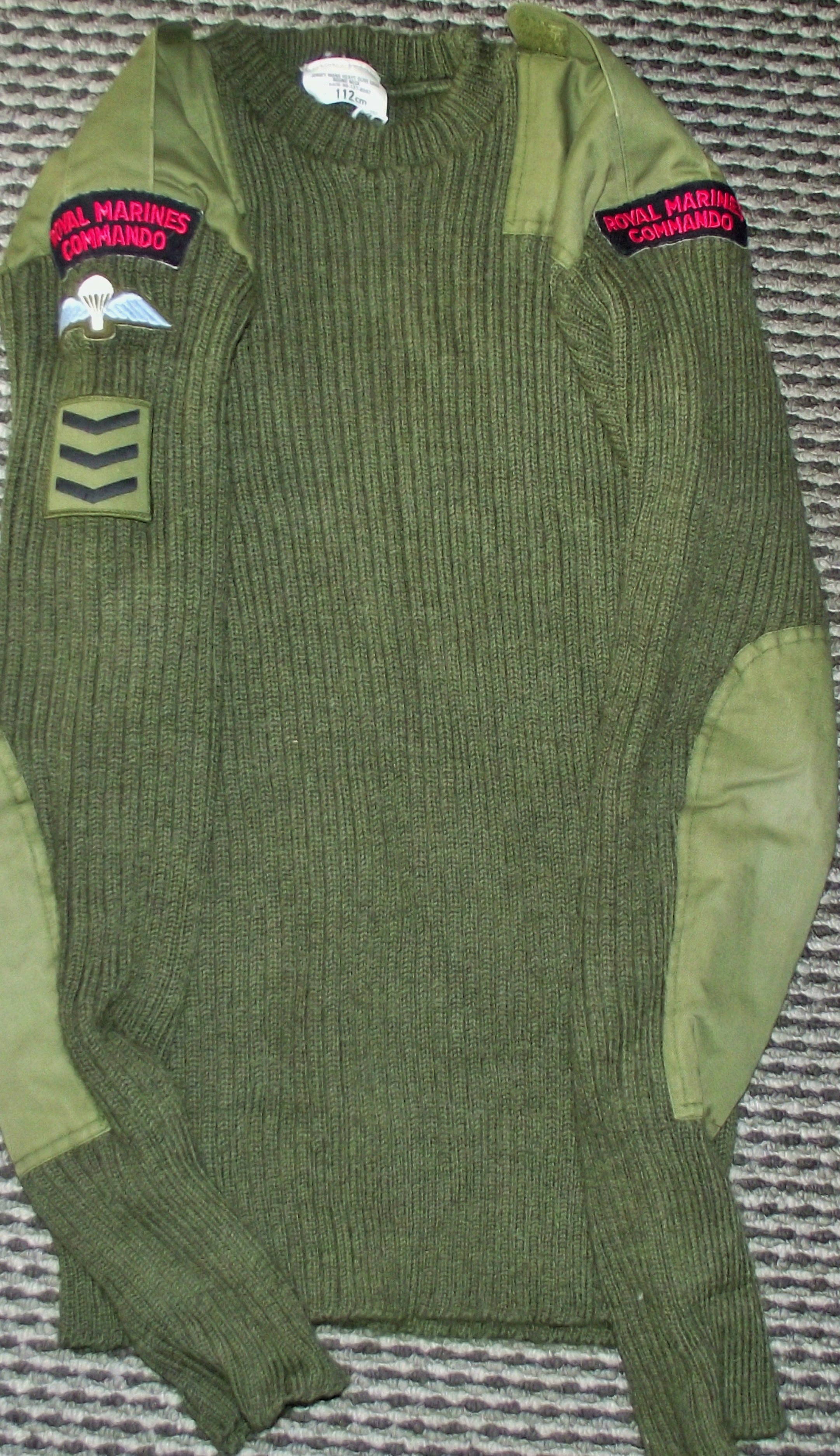 British Army pullover Commando Green Olive Wool Mens/womens wool sweater with stitched on sgt stripes , Royal marine commando stitched on badge , parachute wings stitched on badge size 112cm