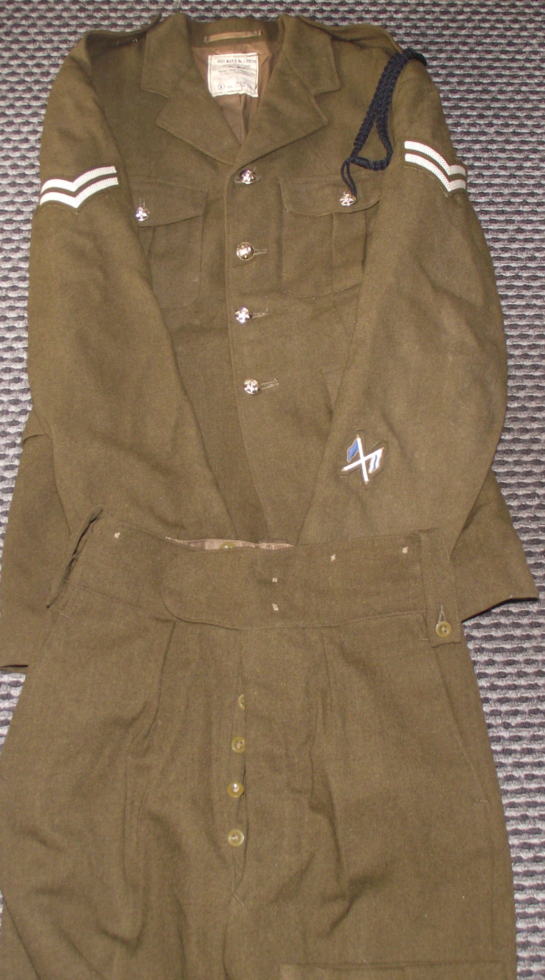 Military Uniform, Mens No. 2 Dress Army corporal 8405-99-973-4630 size 20 with signallers embroided badge on sleeve. made by briggs jones and gibson ltd