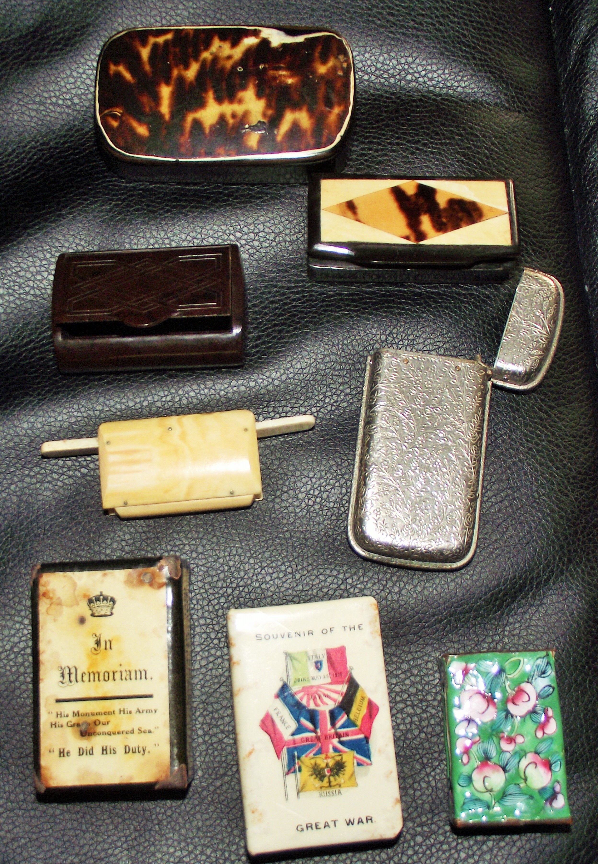 Rare white metal flip top vesta marked patented Sept30 1880 +2x Antique snuff boxes inlaid tortoise shell style, Antique bakelite snuff box , bone 2 ended vesta case , 3x Rare white metal flip top vesta marked patented Sept30 1880 +2x Antique snuff boxes inlaid tortoise shell style, Antique bakelite snuff box , bone 2 ended vesta case , 3x enamelled match box holders